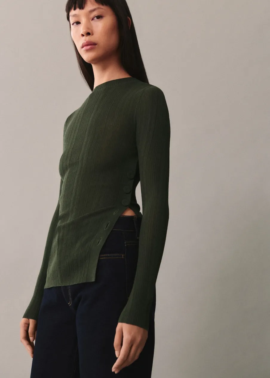 Tkanina z cienkiej dzianiny. Model standardowy. Półprzezroczysty design. Półgolf. Długi rękaw. Zapięcie na boczne guziki. Rozcięcie boczne. Modelka ma 177 cm wzrostu i nosi rozmiar S/36.