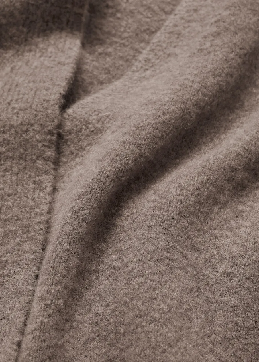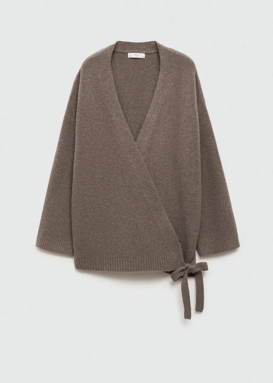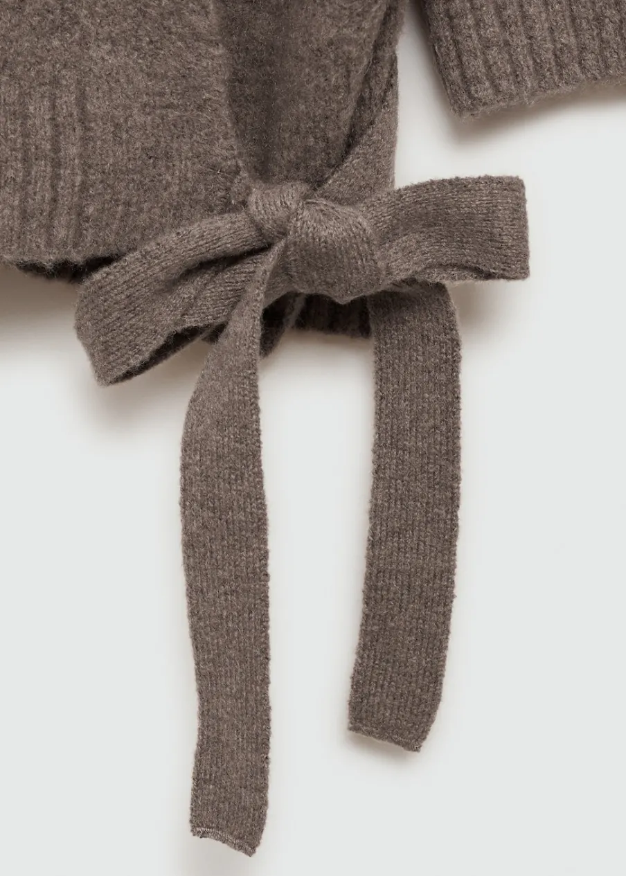 Tkanina z grubej dzianiny. Model prosty. Dekolt V. Długi rękaw. Wiązanie z boku.