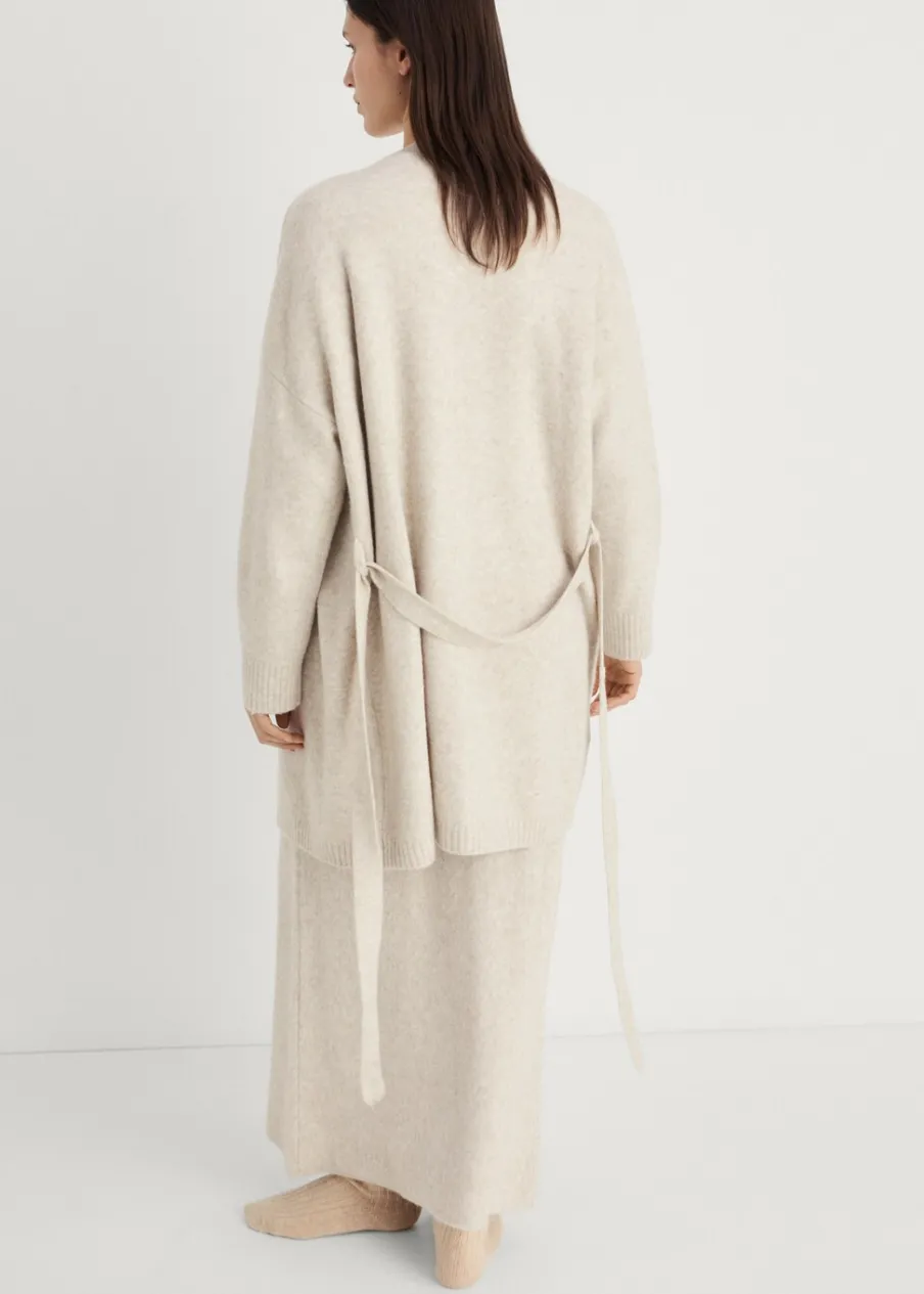 Dzianina średniej grubości. Krój do kolan. Zakładany dekolt V. Długi rękaw. Dekoracyjny pasek. Total look.