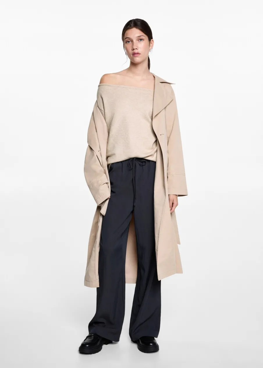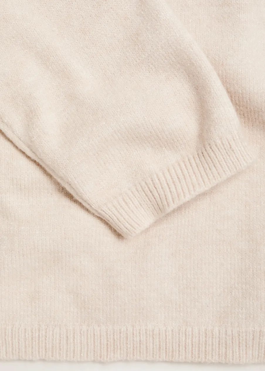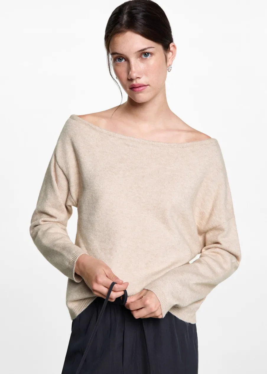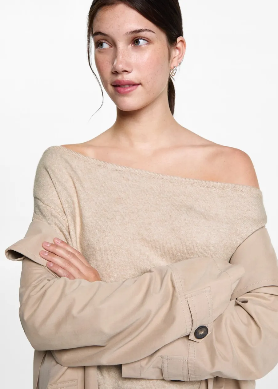 Dekolt w kształcie łódki. Długi rękaw. Bez zapięcia. Modelka ma 172 cm wzrostu i nosi rozmiar M. Model prosty.