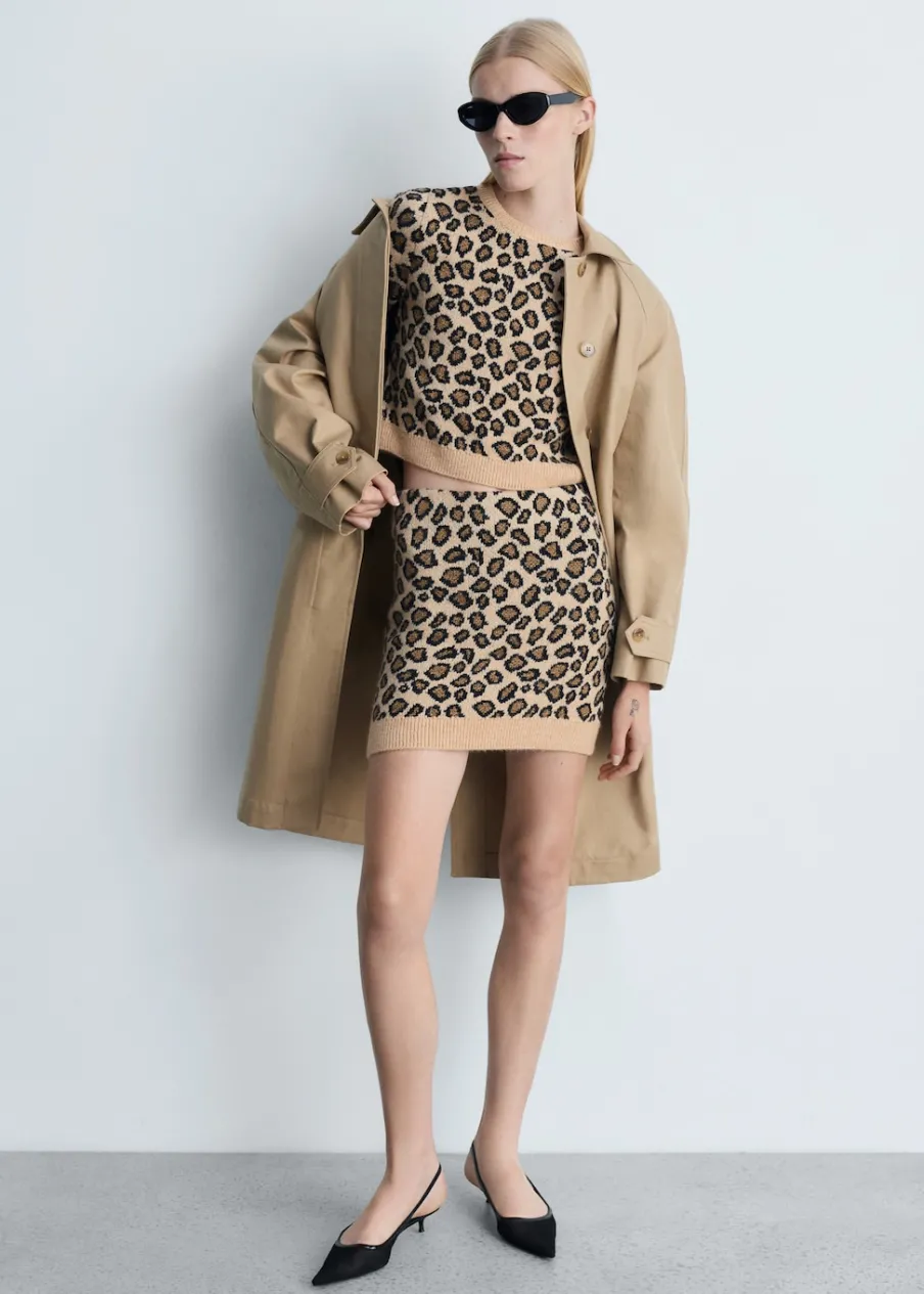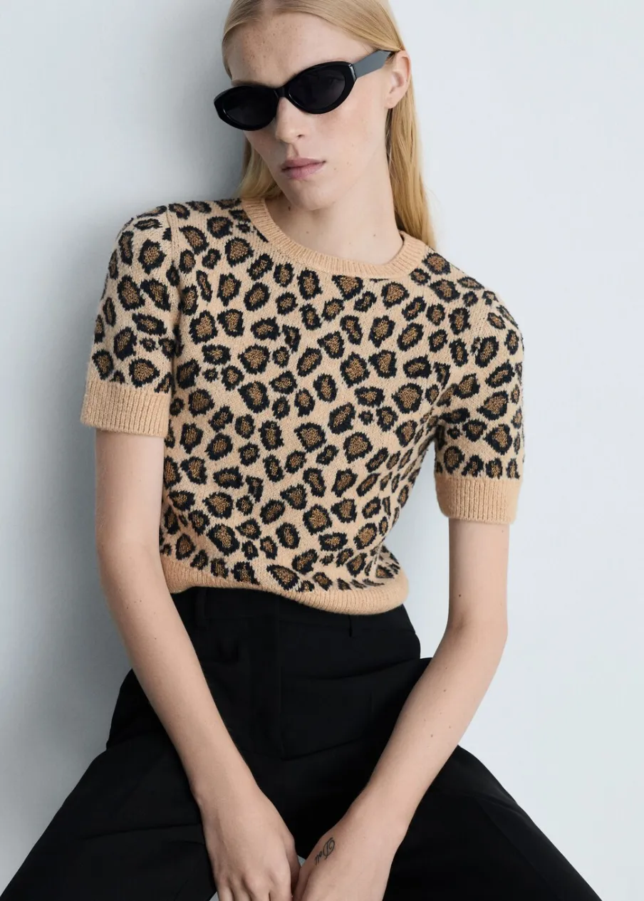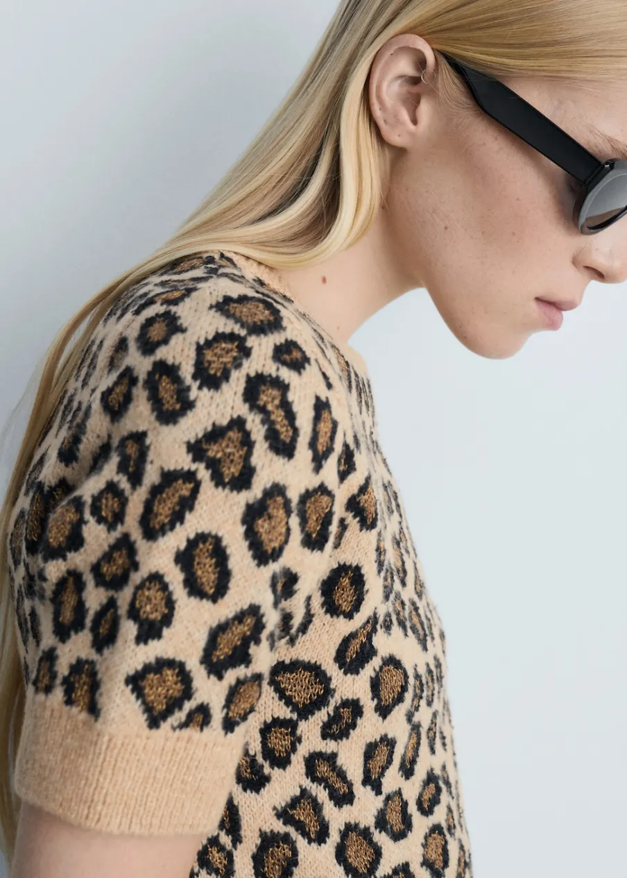 Dzianina średniej grubości. Model prosty. Deseń crop. Wzór w lamparcie cętki. Okrągły dekolt. Krótki rękaw. Bez zapięcia. Modelka ma 178 cm wzrostu i nosi rozmiar S/36. Total look.