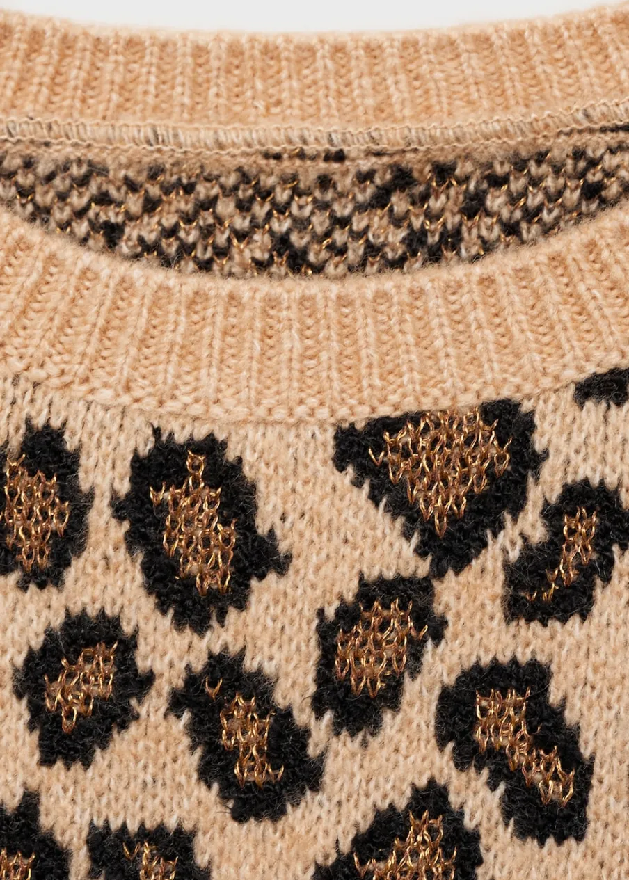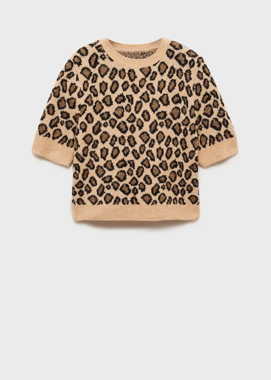 OpisDzianina średniej grubości. Model prosty. Deseń crop. Wzór w lamparcie cętki. Okrągły dekolt. Krótki rękaw….