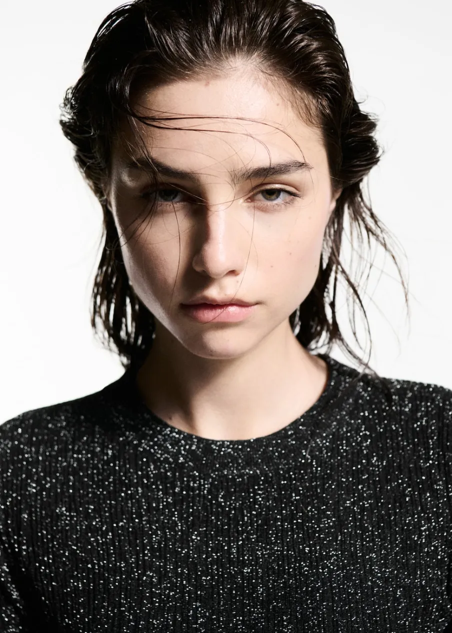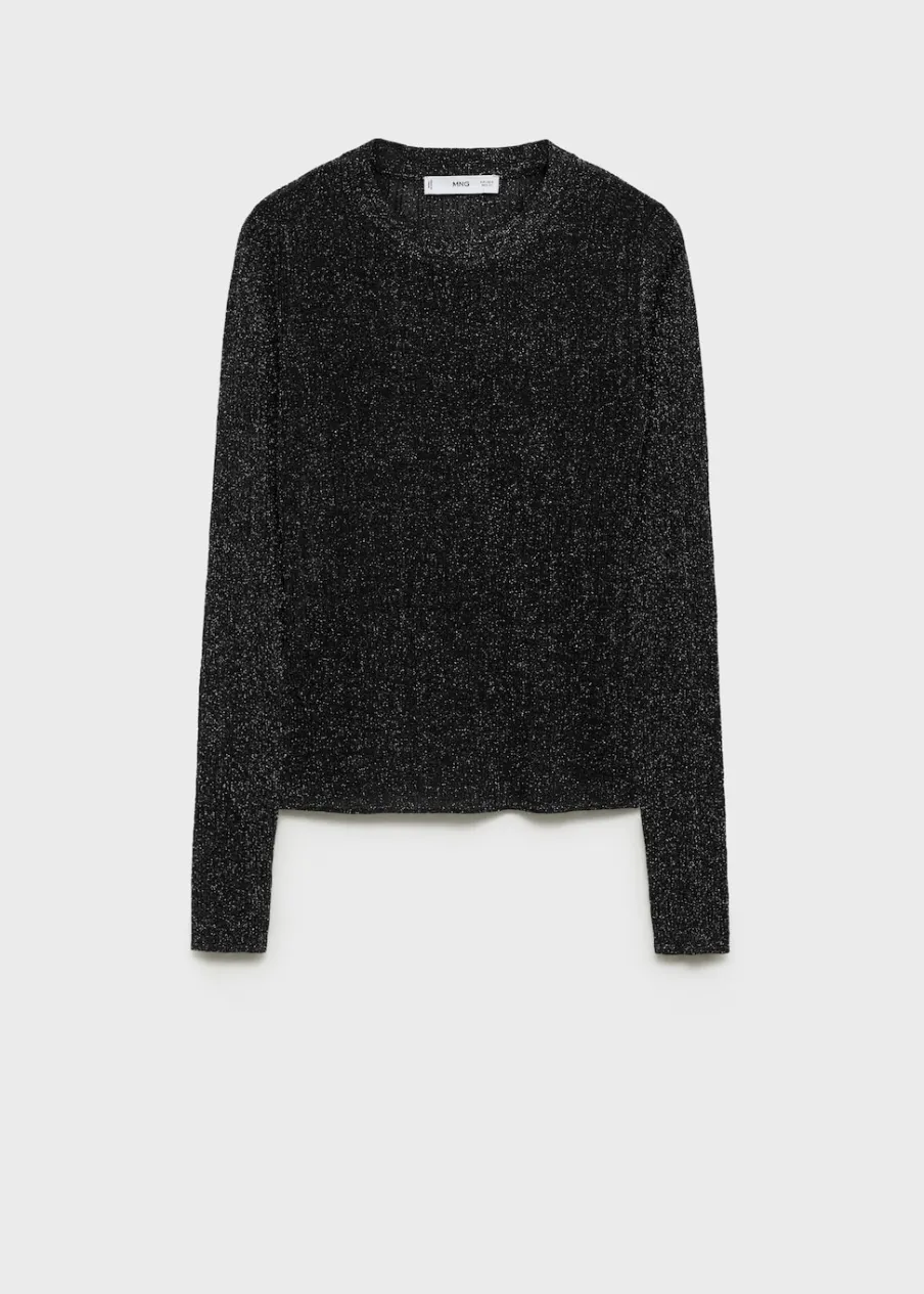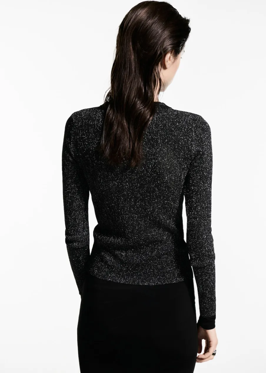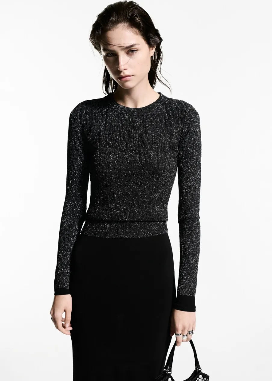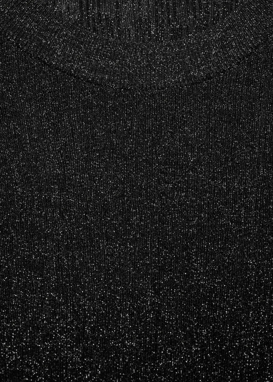 Długi rękaw. Modelka ma 177 cm wzrostu i nosi rozmiar S/36. Modelka ma 178 cm wzrostu i nosi rozmiar S/36. Tkanina z cienkiej dzianiny. Tkanina lureks. Model wcięty. Bez zapięcia. Kolekcja wizytowa. Okrągły dekolt.