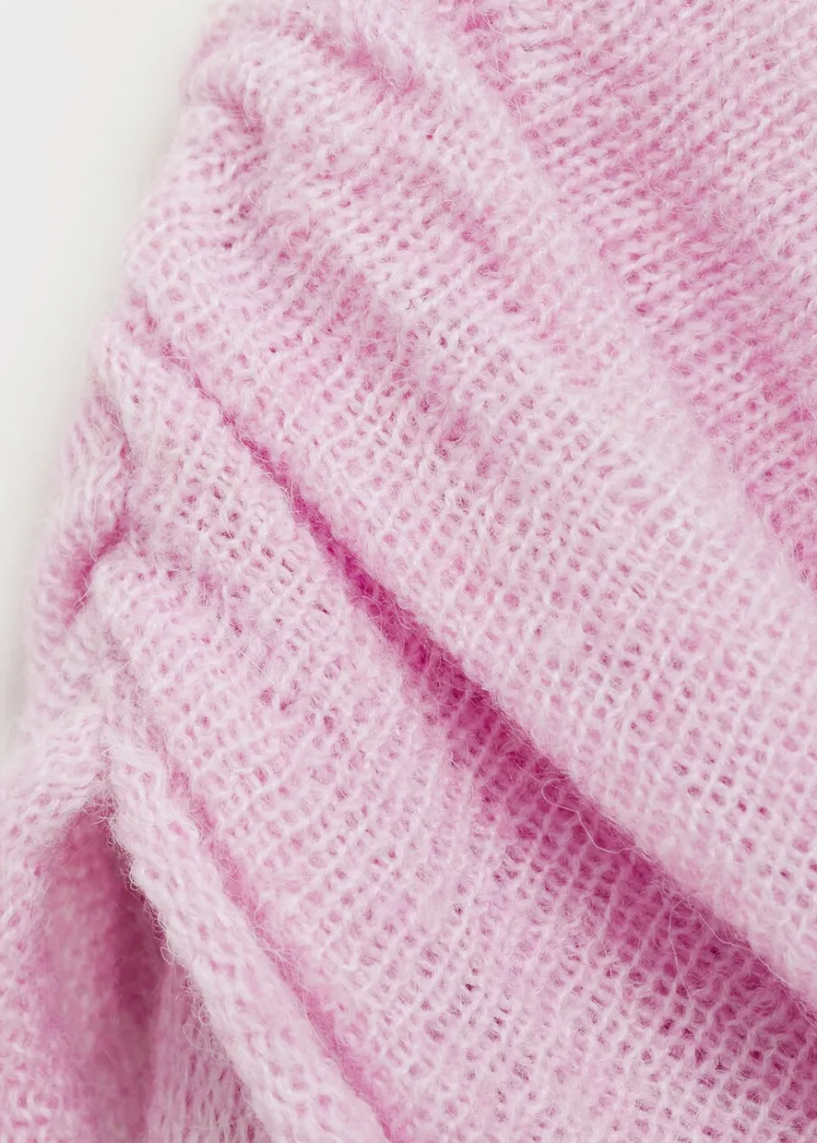 OpisDzianinowa tkanina. Marszczony detal. Dekolt V. Długi rękaw. Modelka ma 179 cm wzrostu i nosi rozmiar S/36. Bez za…