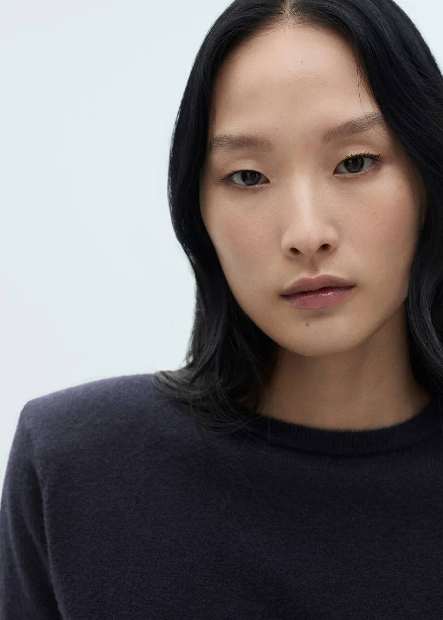 Tkanina z cienkiej dzianiny. Model prosty. Okrągły dekolt. Długi rękaw z prążkowanym wykończeniem. Bez zapięcia. Modelka ma 175 cm wzrostu i nosi rozmiar S/36.