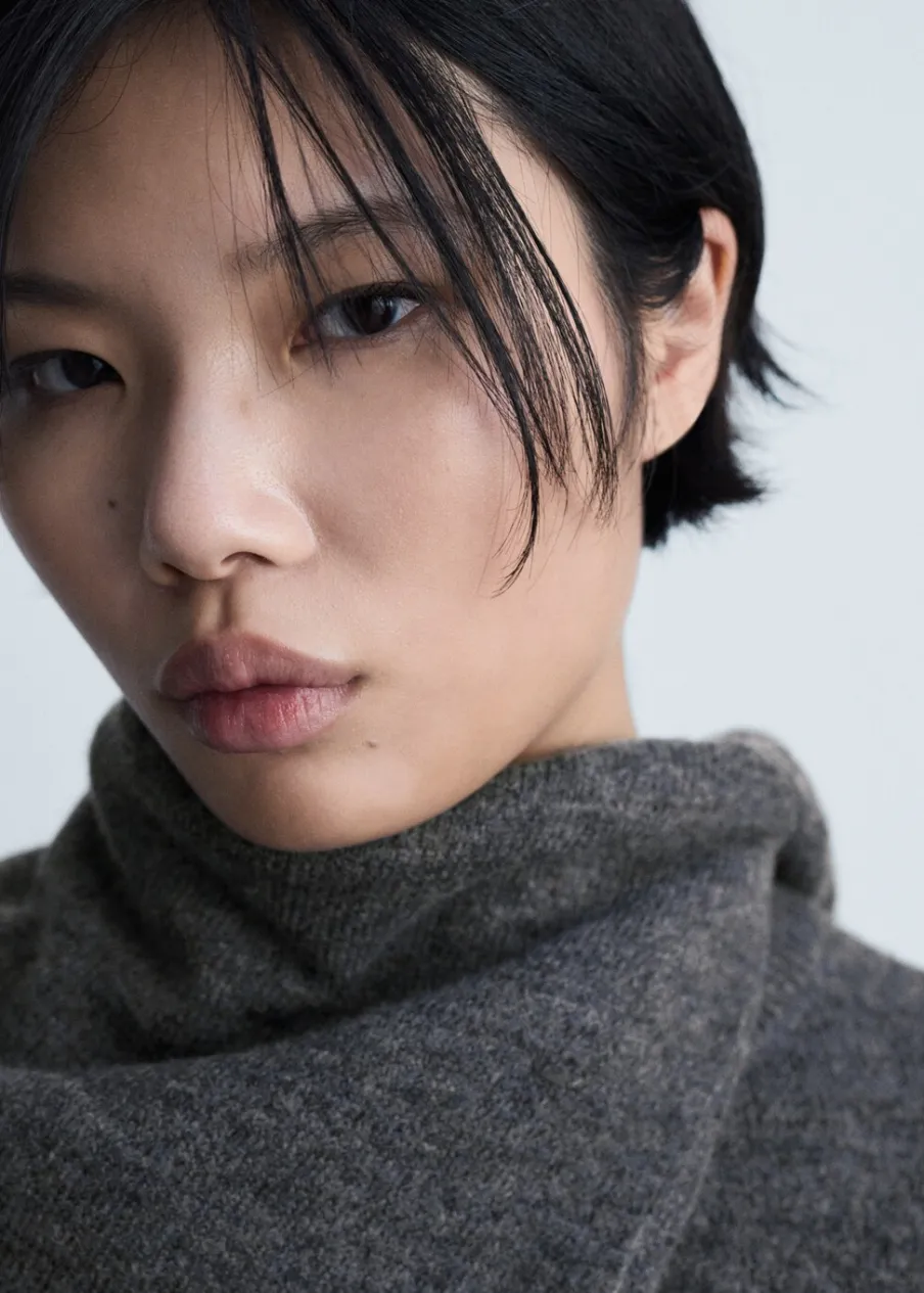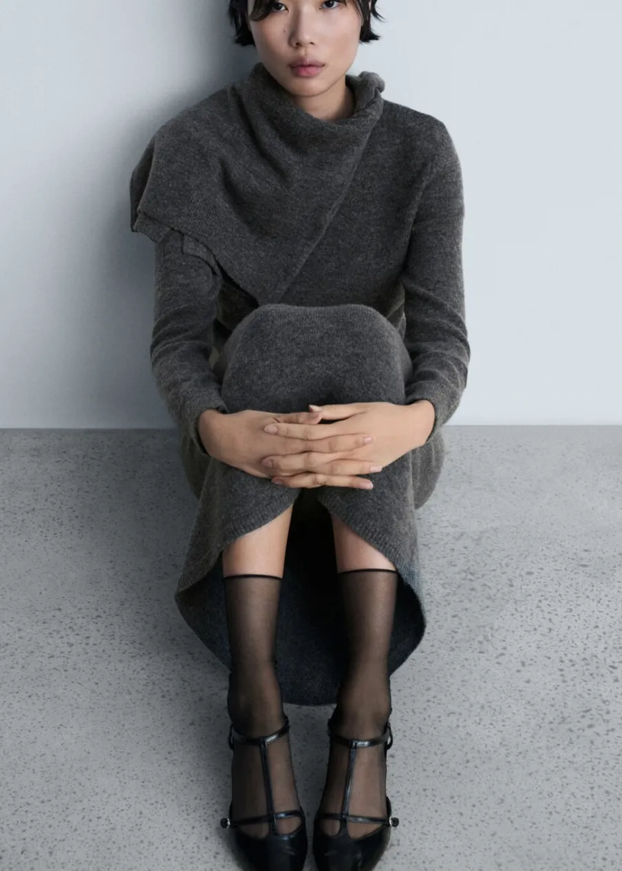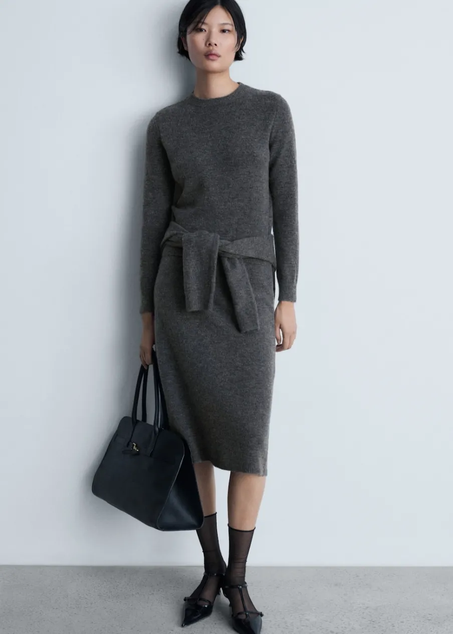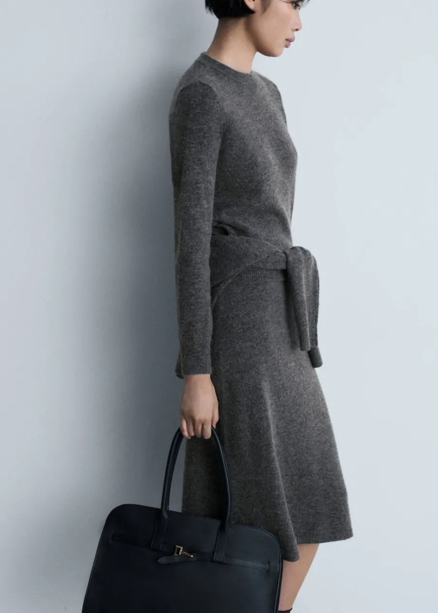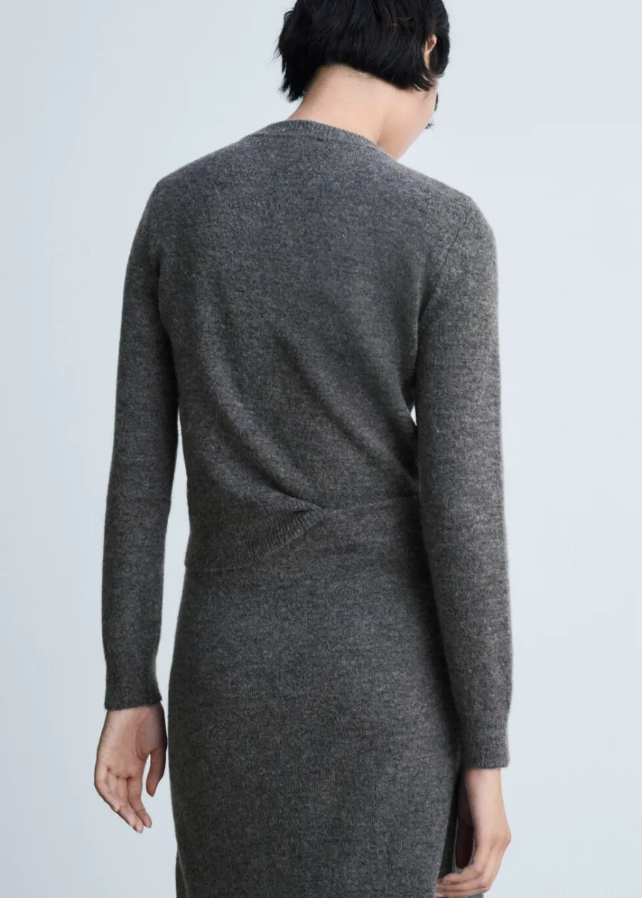 Dzianina średniej grubości. Model prosty. Okrągły dekolt. Długi rękaw. Total look. Modelka ma 179 cm wzrostu i nosi rozmiar S/36.