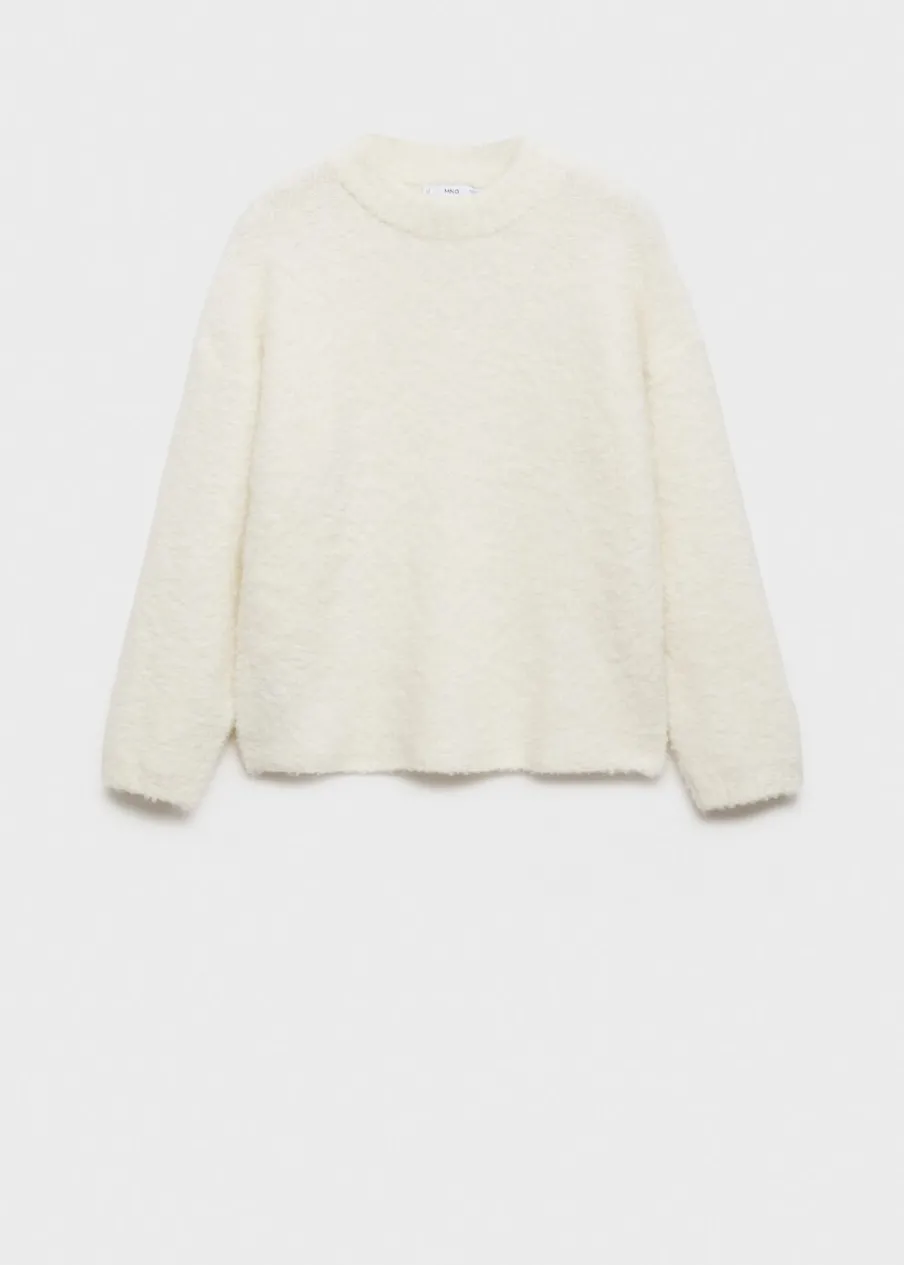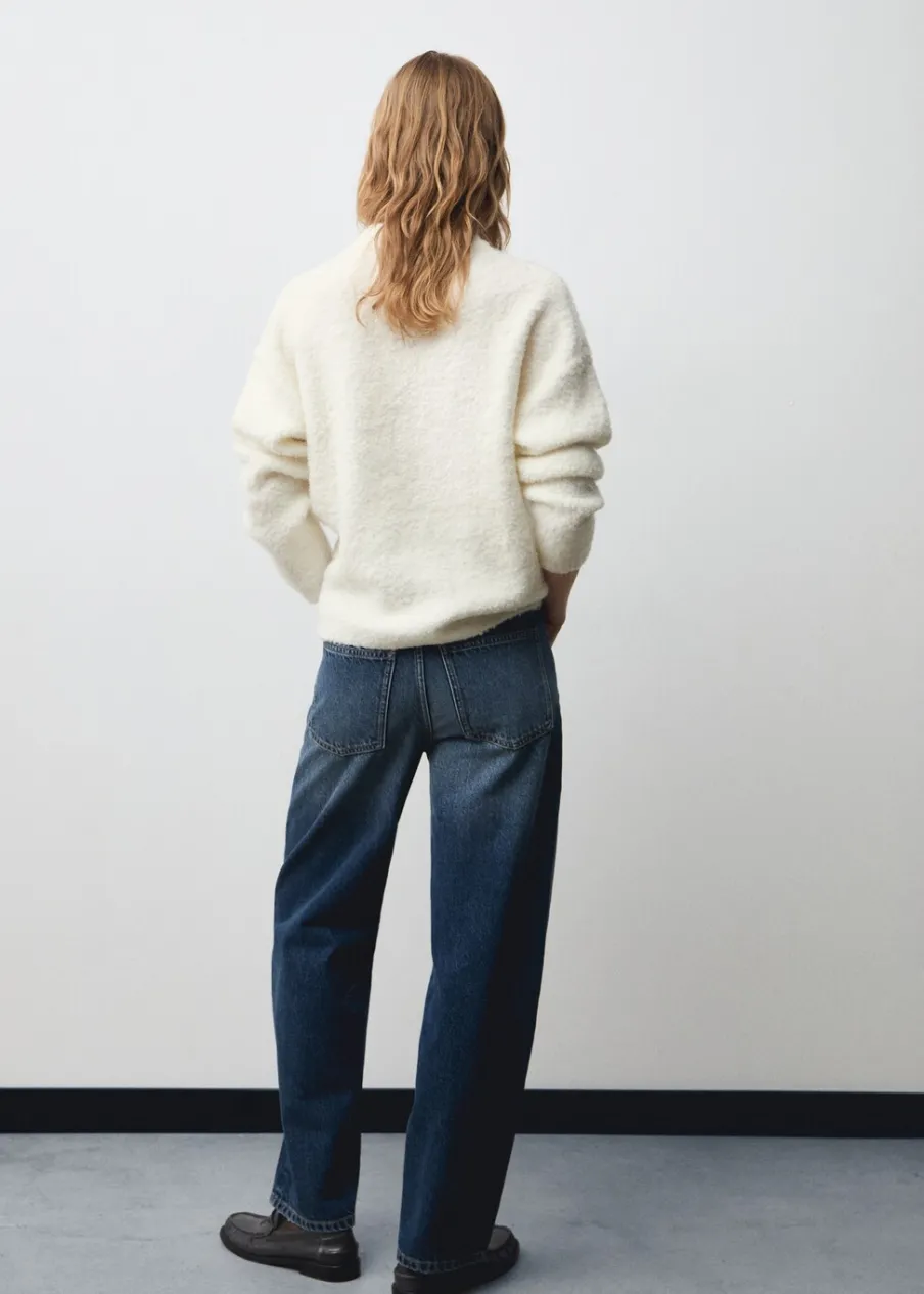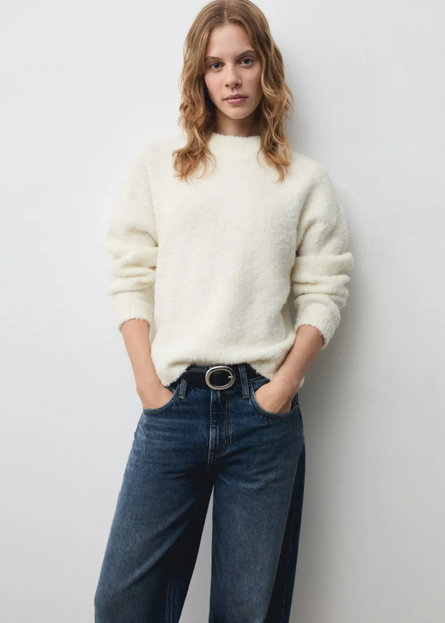 Tkanina z grubej dzianiny. Model prosty. Okrągły dekolt. Długi rękaw. Bez zapięcia. Modelka ma 179 cm wzrostu i nosi rozmiar S/36.