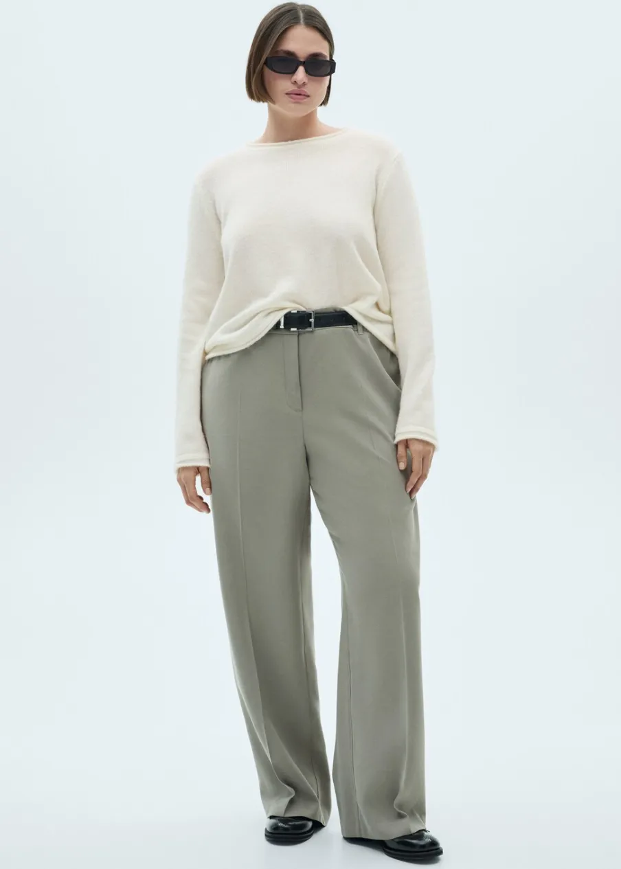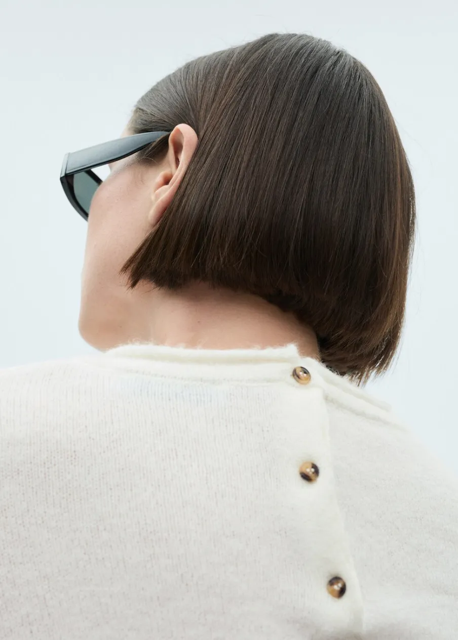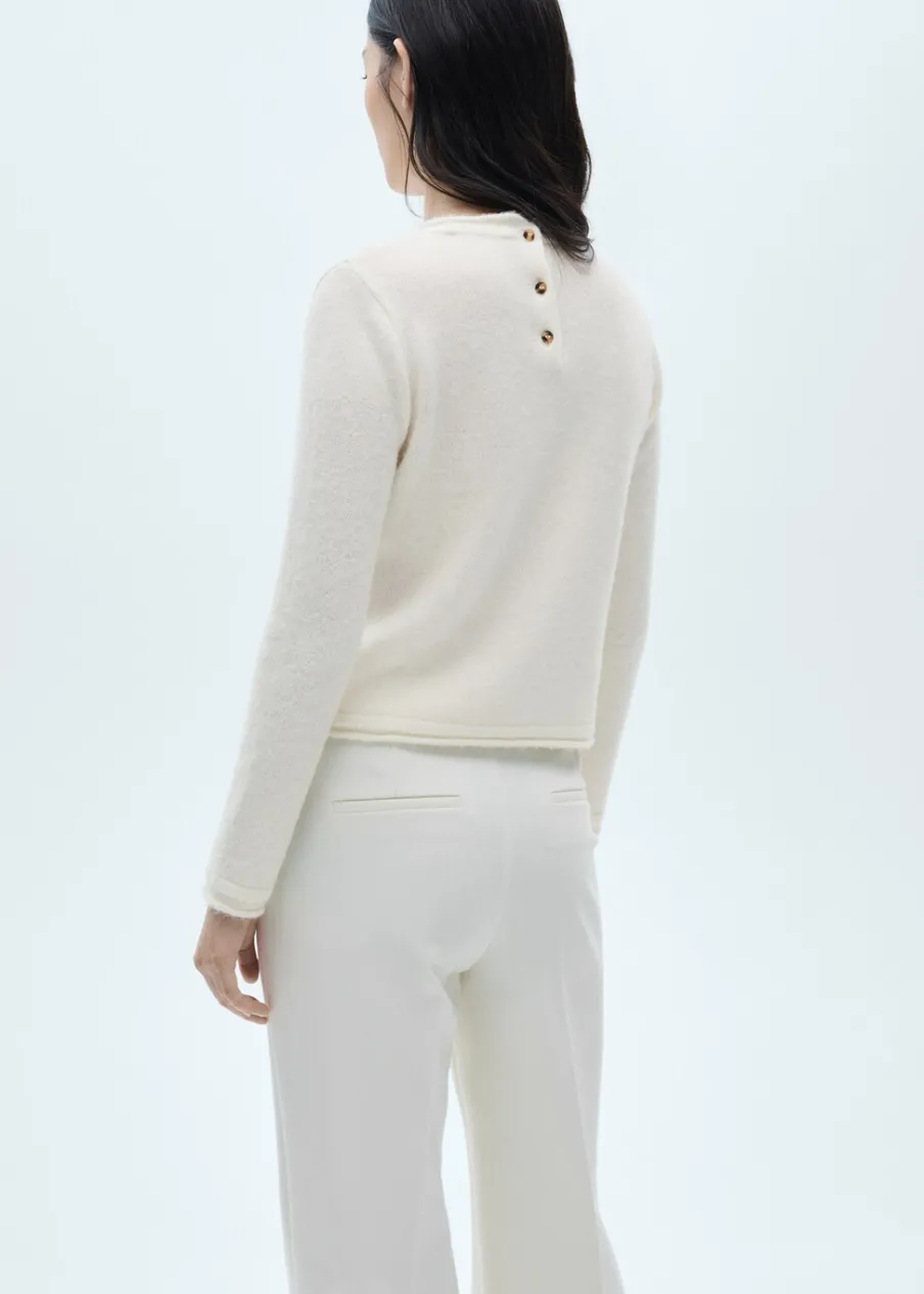 Dzianina średniej grubości. Tkanina mieszanka wełny. Model prosty. Okrągły dekolt. Długi rękaw. Zapięcie z tyłu na guziki. Modelka ma 175 cm wzrostu i nosi rozmiar S/36.