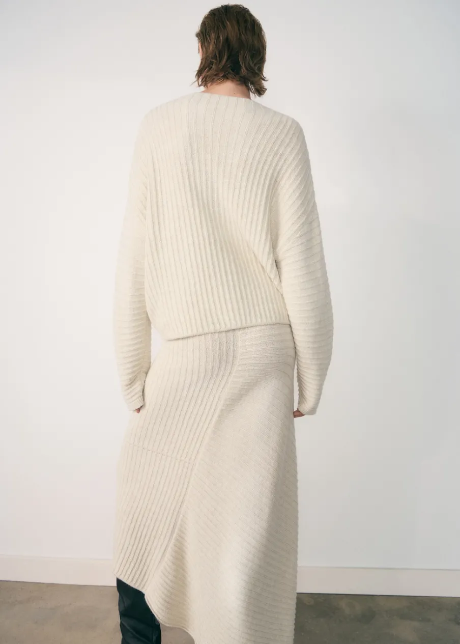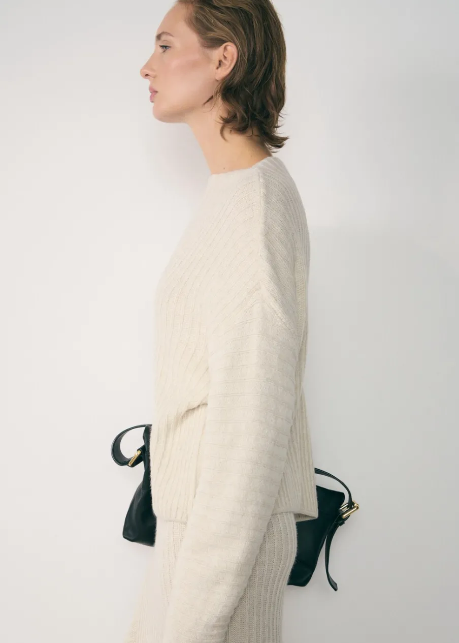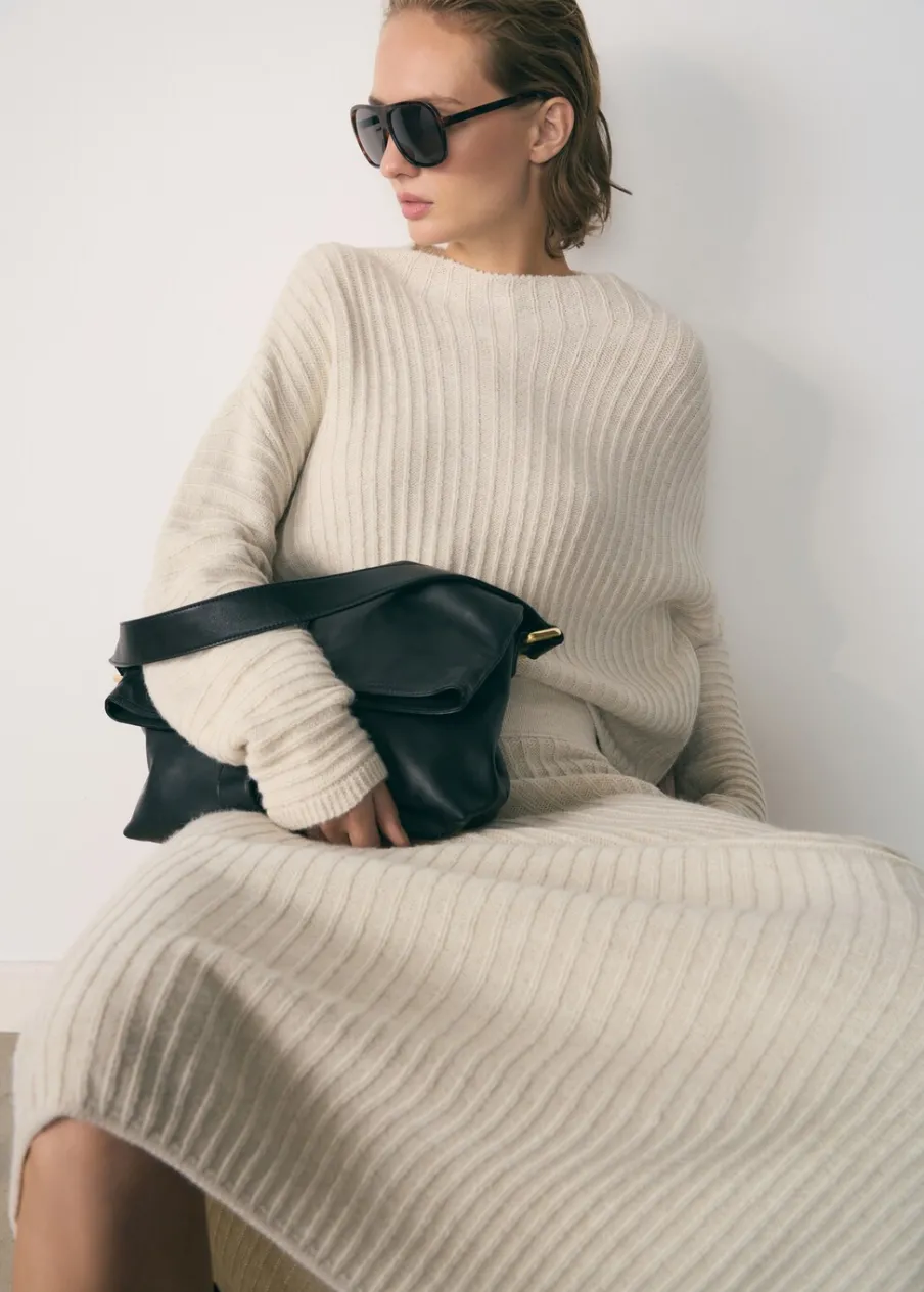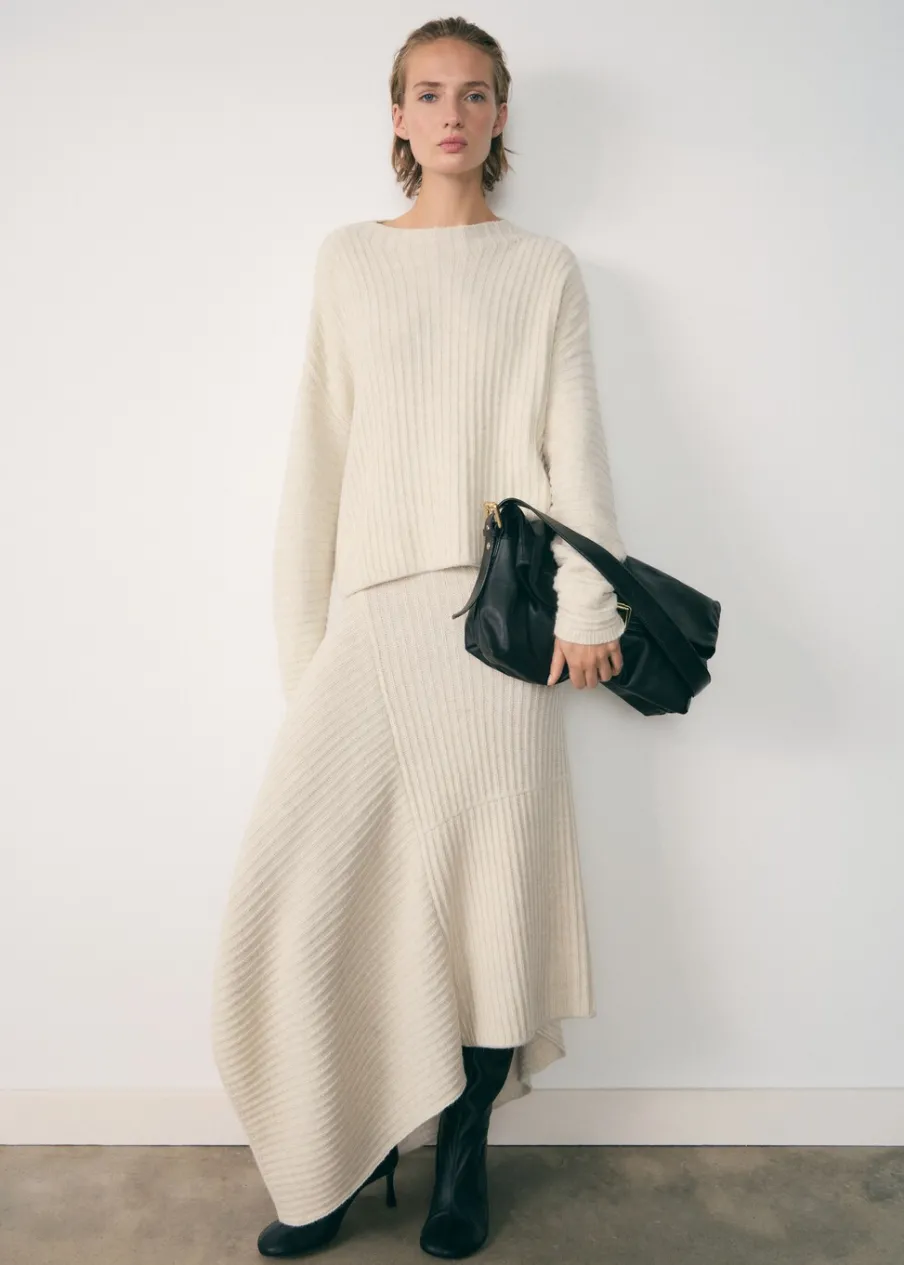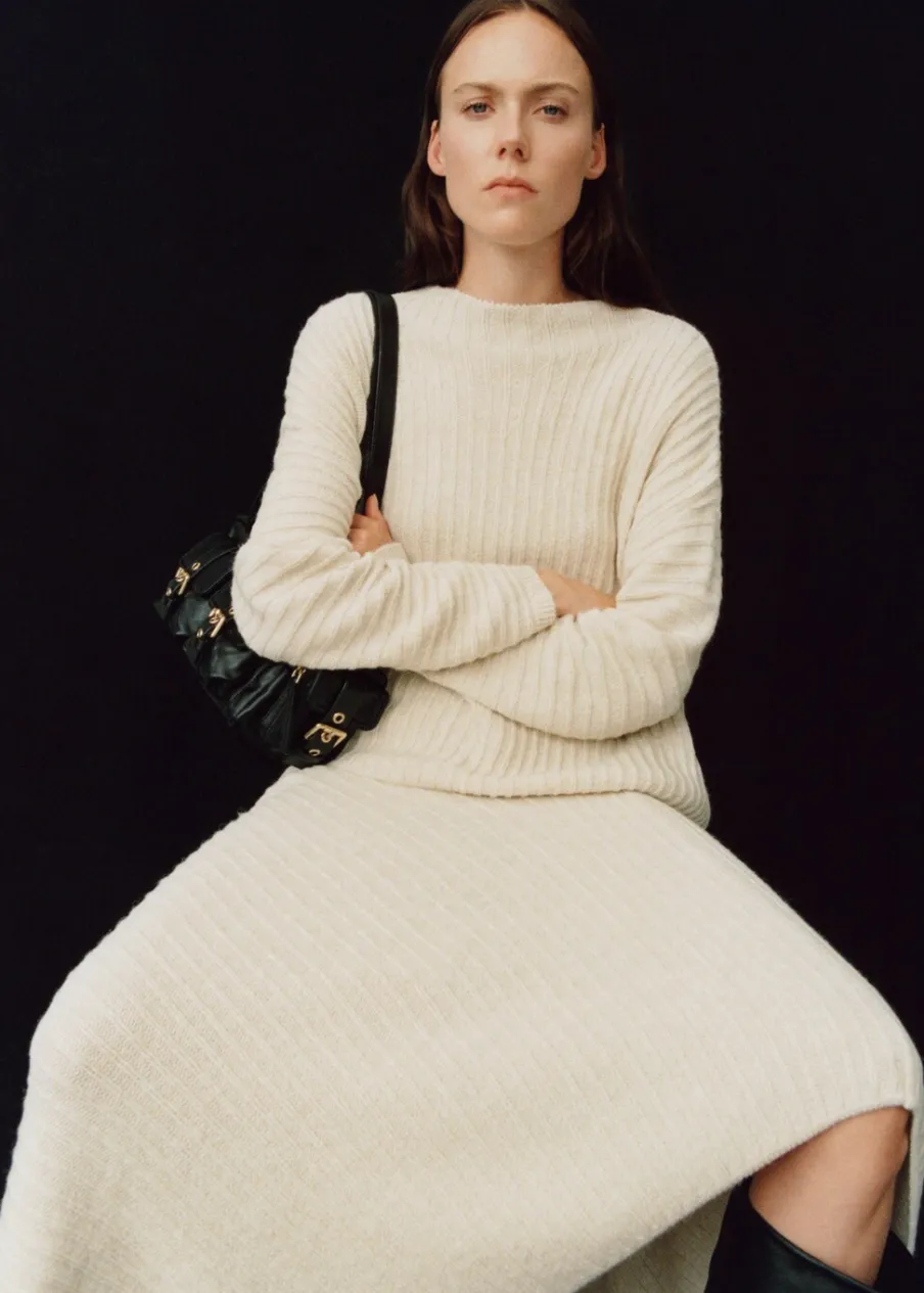 Dzianinowa tkanina. Dzianina średniej grubości. Model oversize. Półgolf. Długi rękaw. Ozdobne szwy. Bez zapięcia. Total look. Modelka ma 178 cm wzrostu i nosi rozmiar S/36.