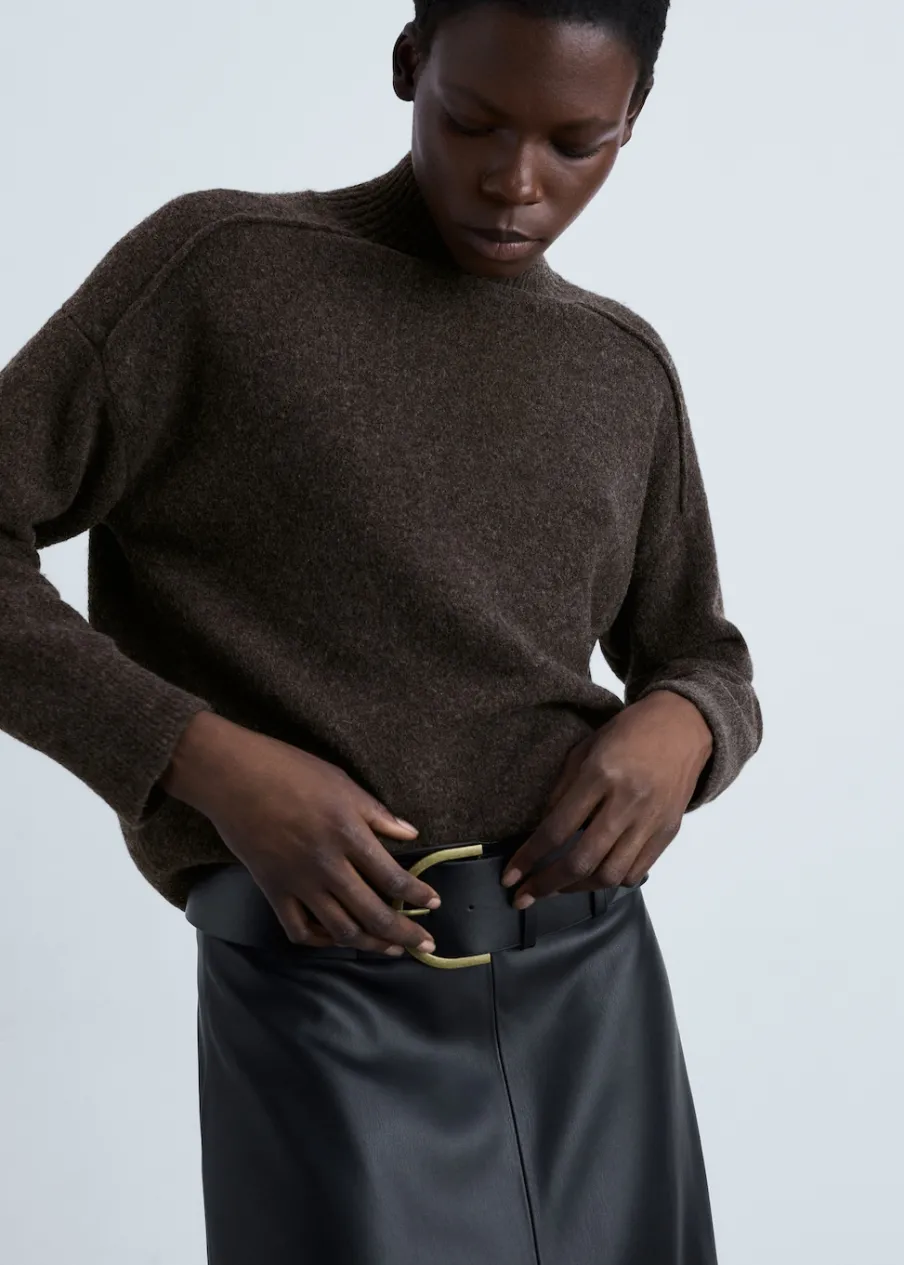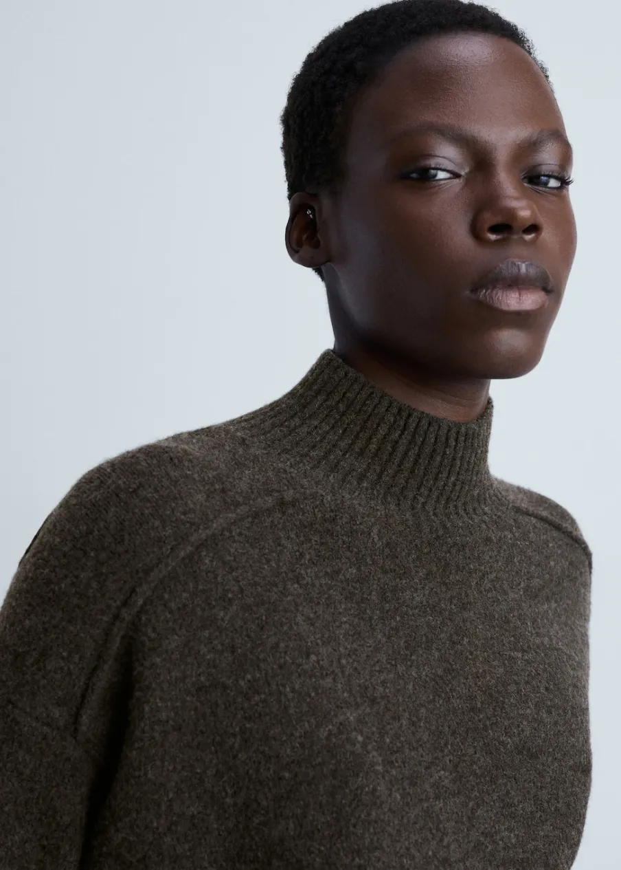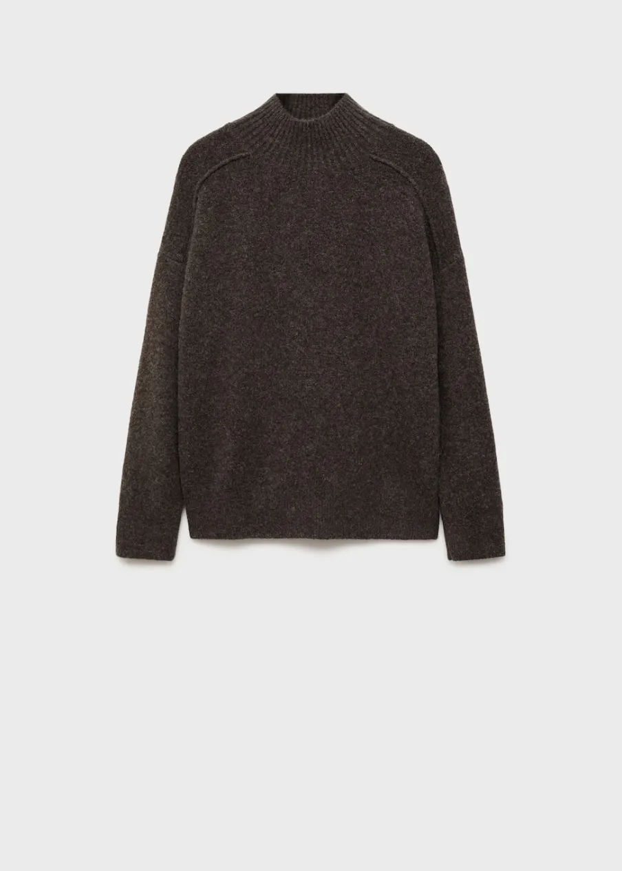 Tkanina z grubej dzianiny. Model prosty. Półgolf. Ozdobne szwy. Ściągaczowe wykończenia.