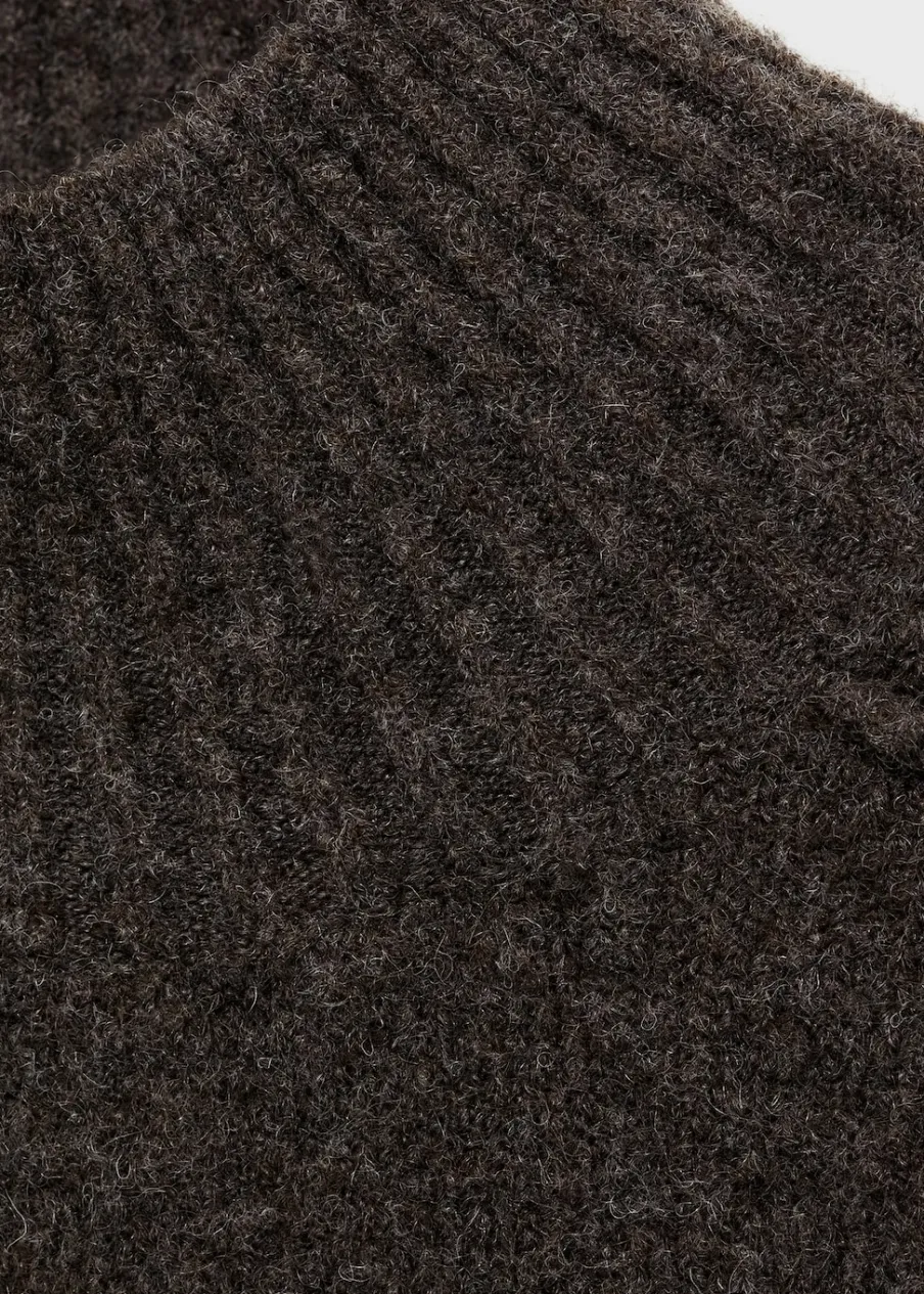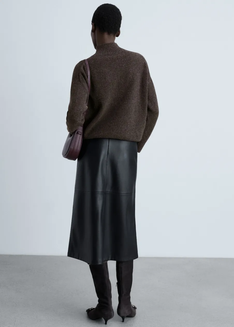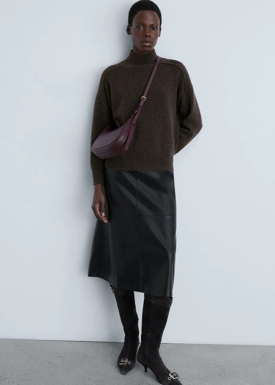 Tkanina z grubej dzianiny. Model prosty. Półgolf. Ozdobne szwy. Ściągaczowe wykończenia.