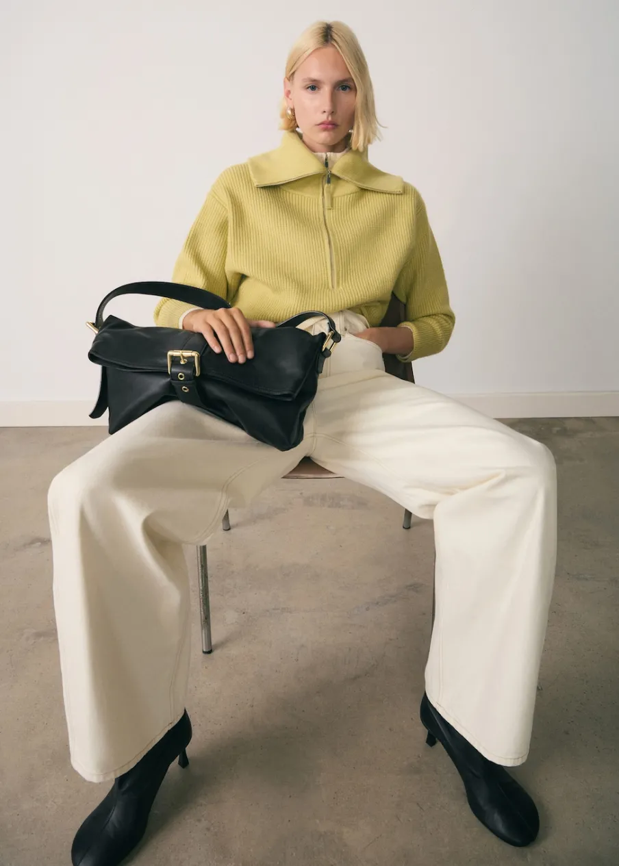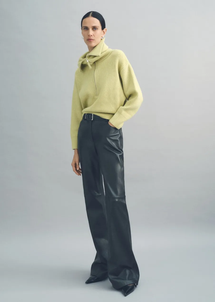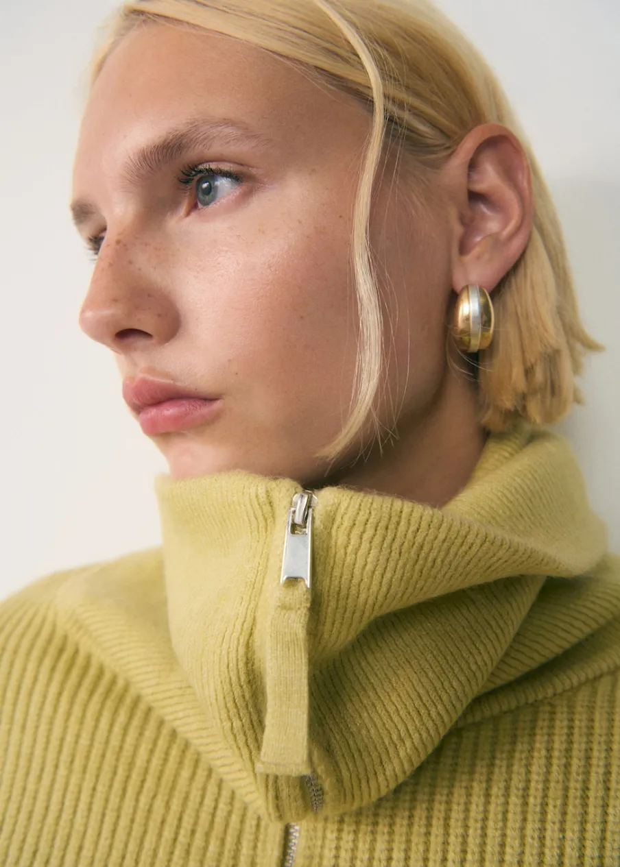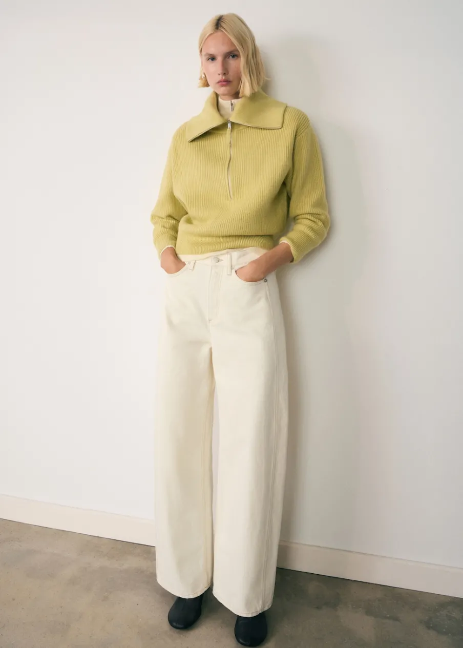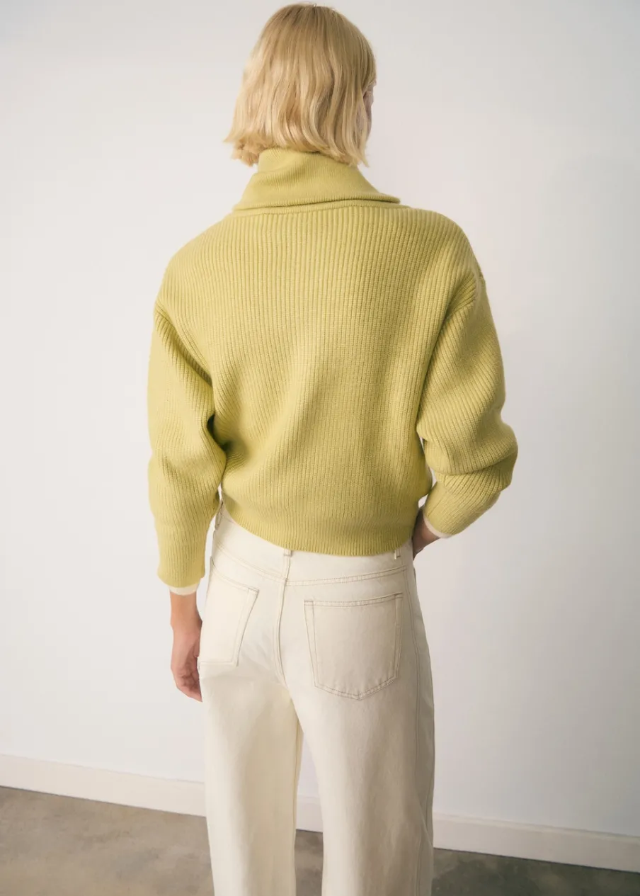 Dzianina średniej grubości. Długi rękaw. Modelka ma 179 cm wzrostu i nosi rozmiar S/36. Półgolf na zamek.