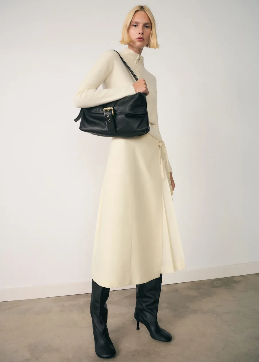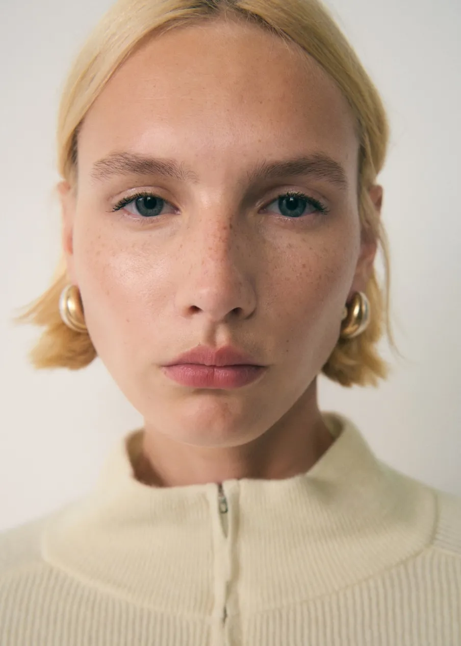 Ściągaczowa dzianina. Tkanina z cienkiej dzianiny. Model wcięty. Półgolf z zapięciem na zamek. Długi rękaw. Modelka ma 178 cm wzrostu i nosi rozmiar S/36.