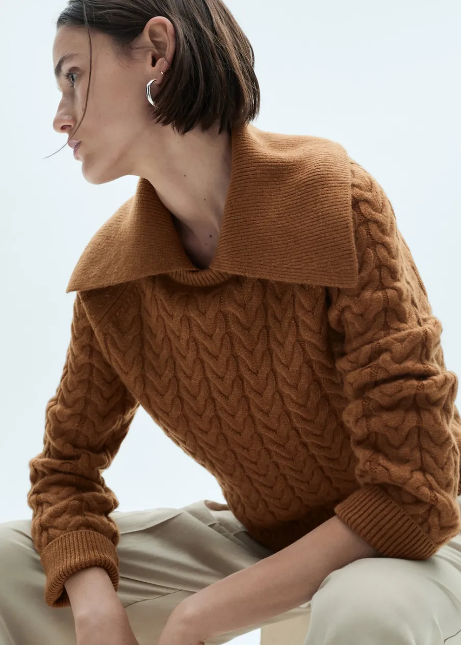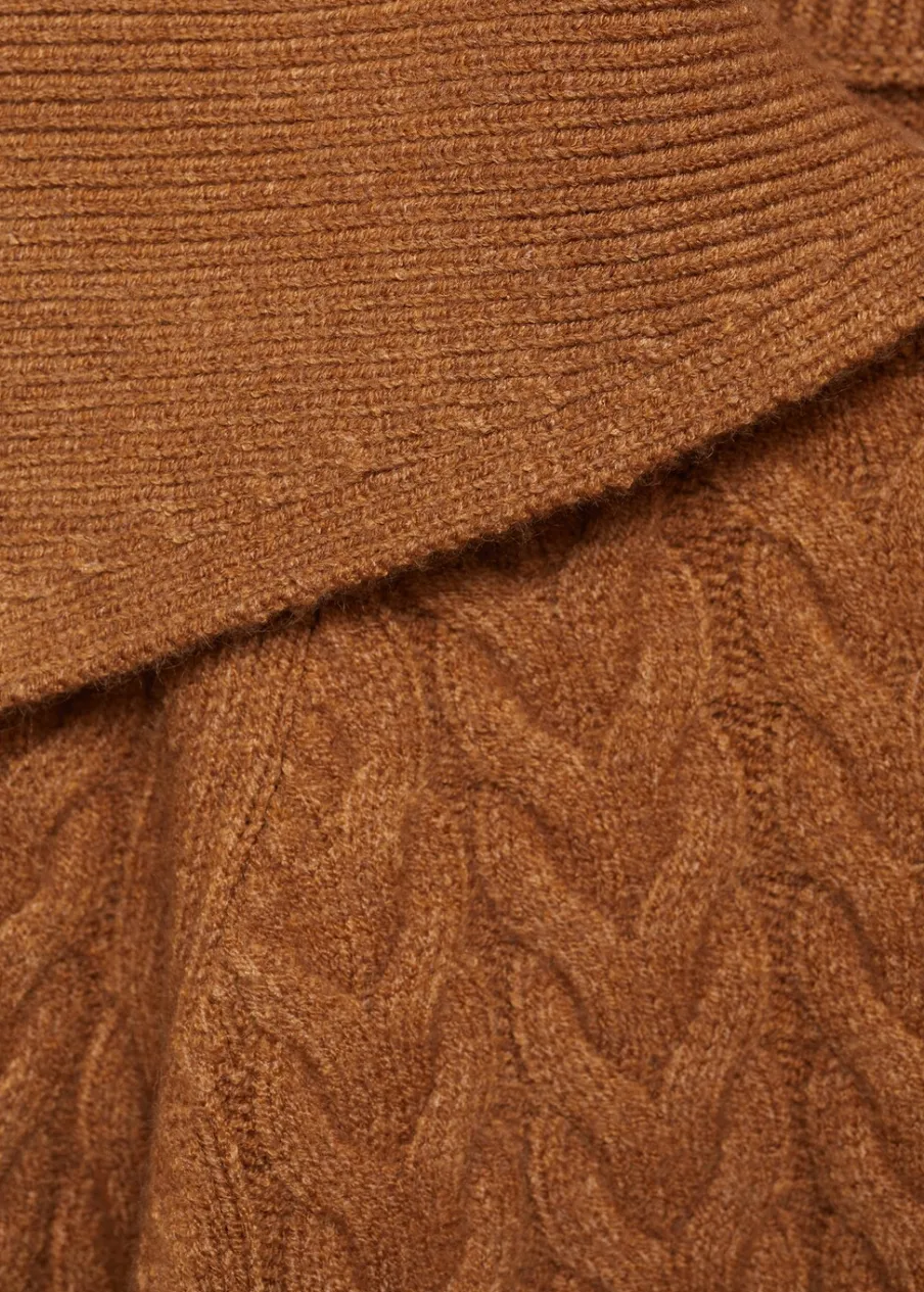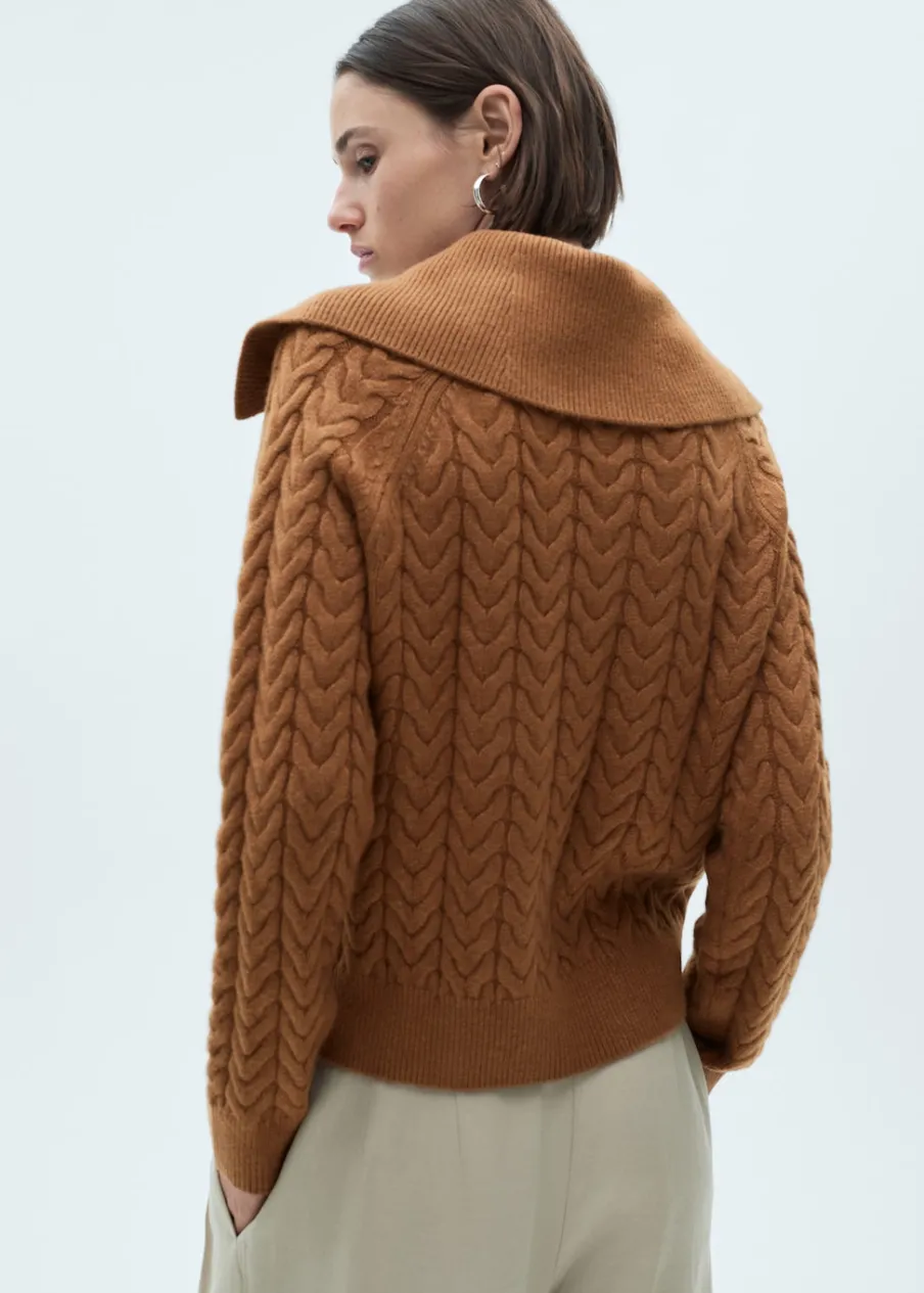 Dzianinowa tkanina. Gruba dzianina z warkoczami. Model prosty. Kołnierz z klapami. Długi rękaw. Bez zapięcia. Modelka ma 179 cm wzrostu i nosi rozmiar S/36.