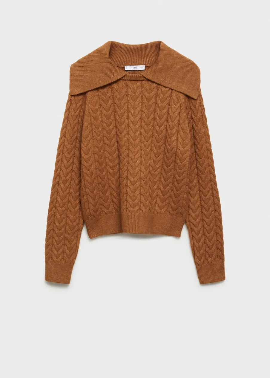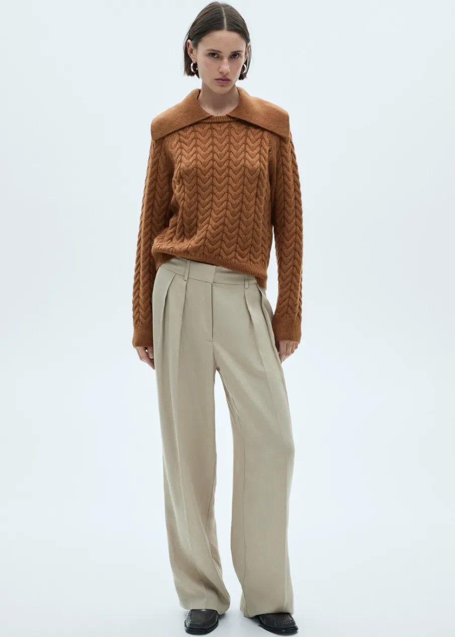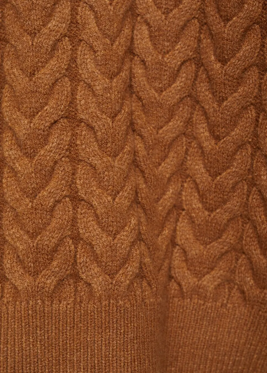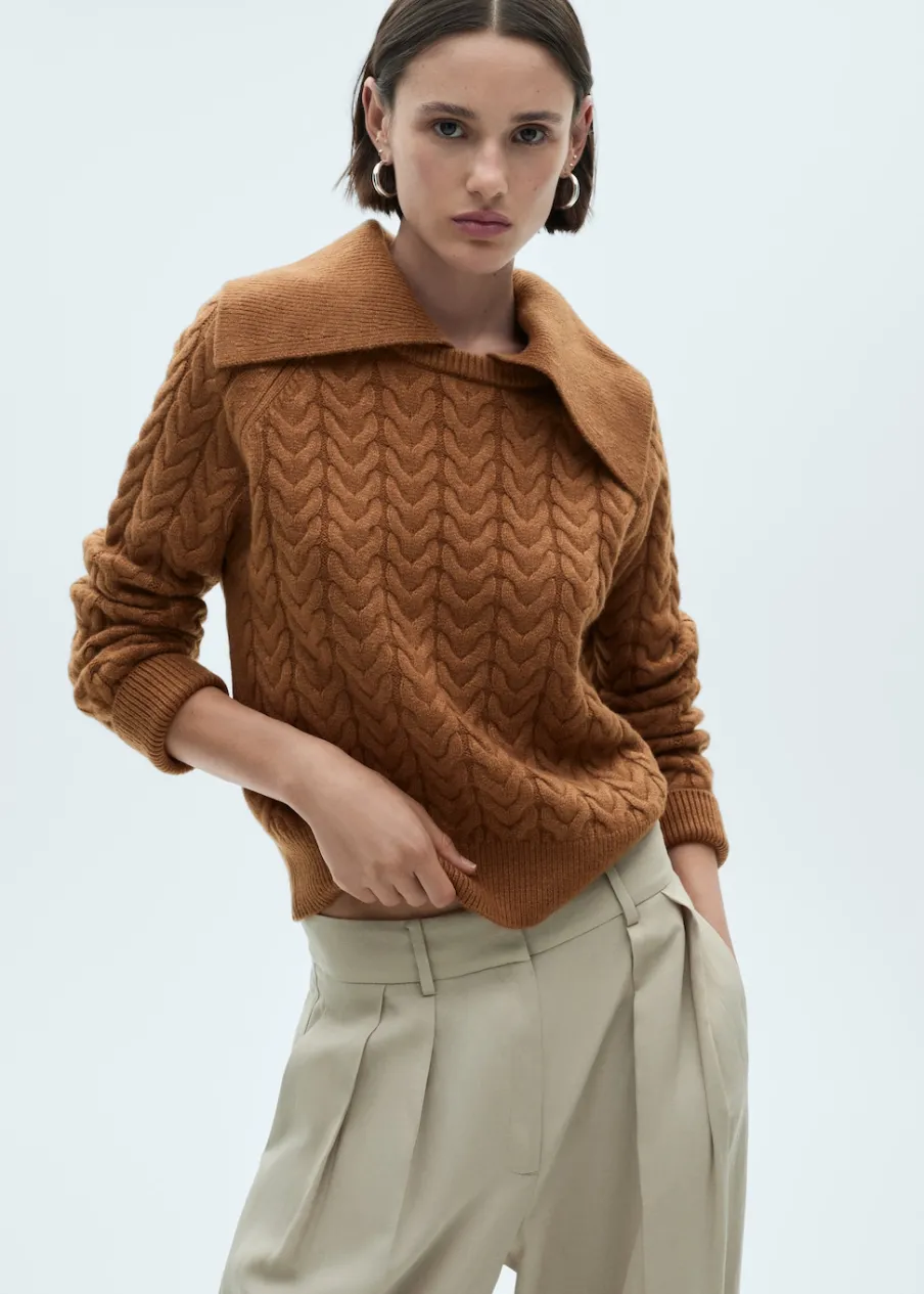 Dzianinowa tkanina. Gruba dzianina z warkoczami. Model prosty. Kołnierz z klapami. Długi rękaw. Bez zapięcia. Modelka ma 179 cm wzrostu i nosi rozmiar S/36.