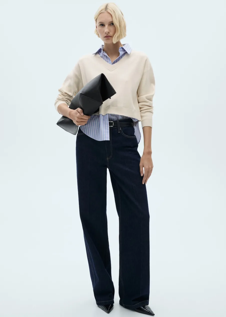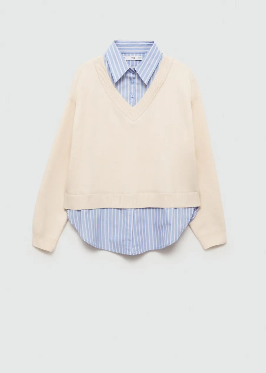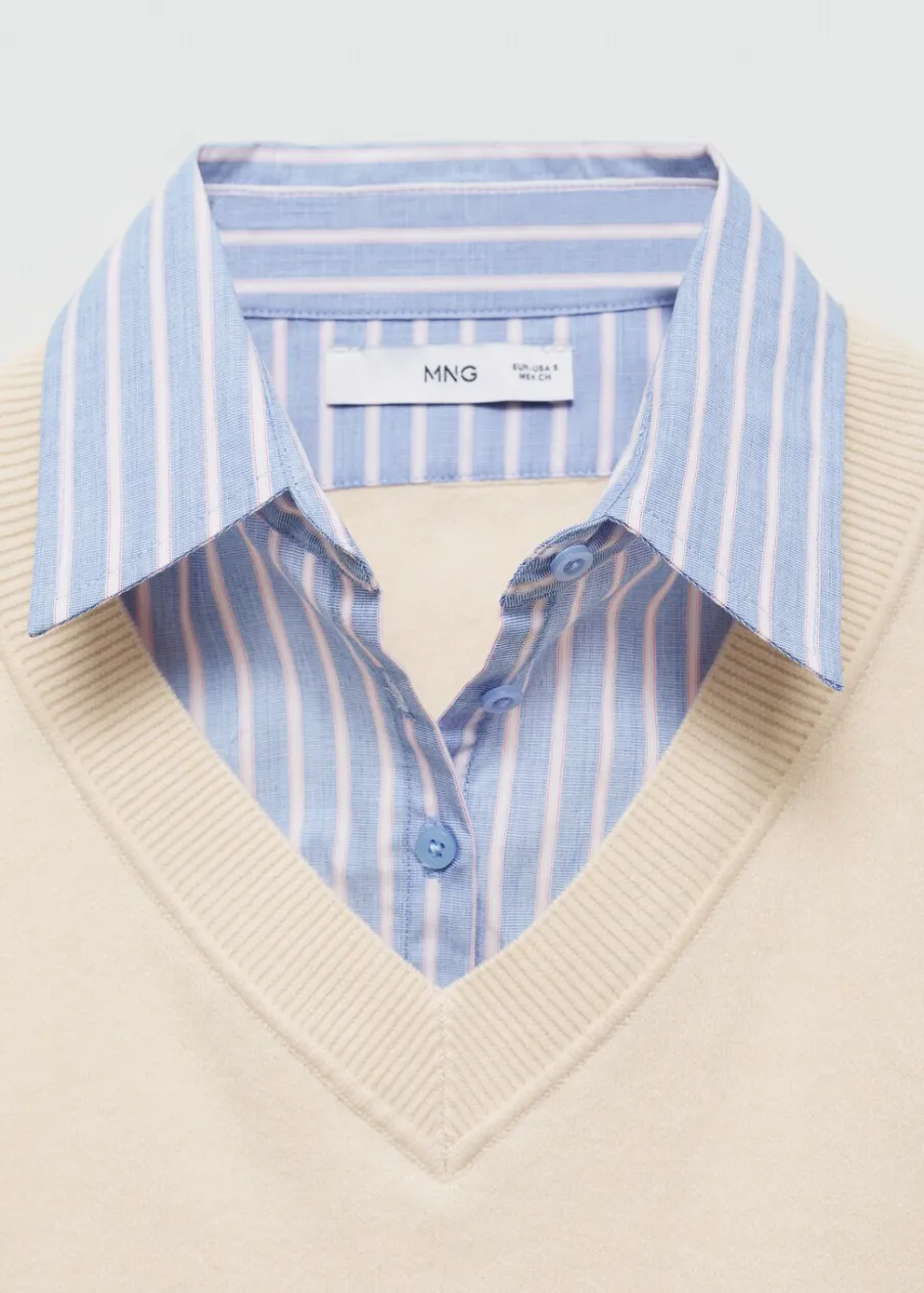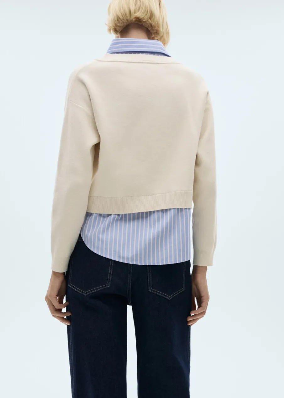 Sweter z dołączoną koszulą. Tkanina mieszanka bawełny. Tkanina z cienkiej dzianiny. Model prosty. Koszulowy kołnierz. Zapinany kołnierzyk. Długi rękaw. Bez zapięcia. Modelka ma 179 cm wzrostu i nosi rozmiar S/36. Prążkowane wykończenie na dekolcie, rękawach i u dołu.