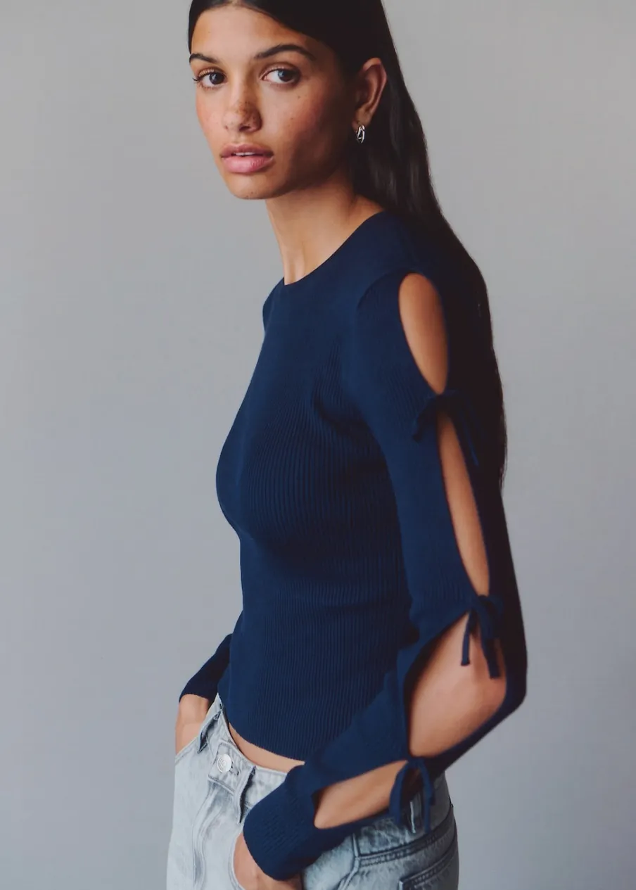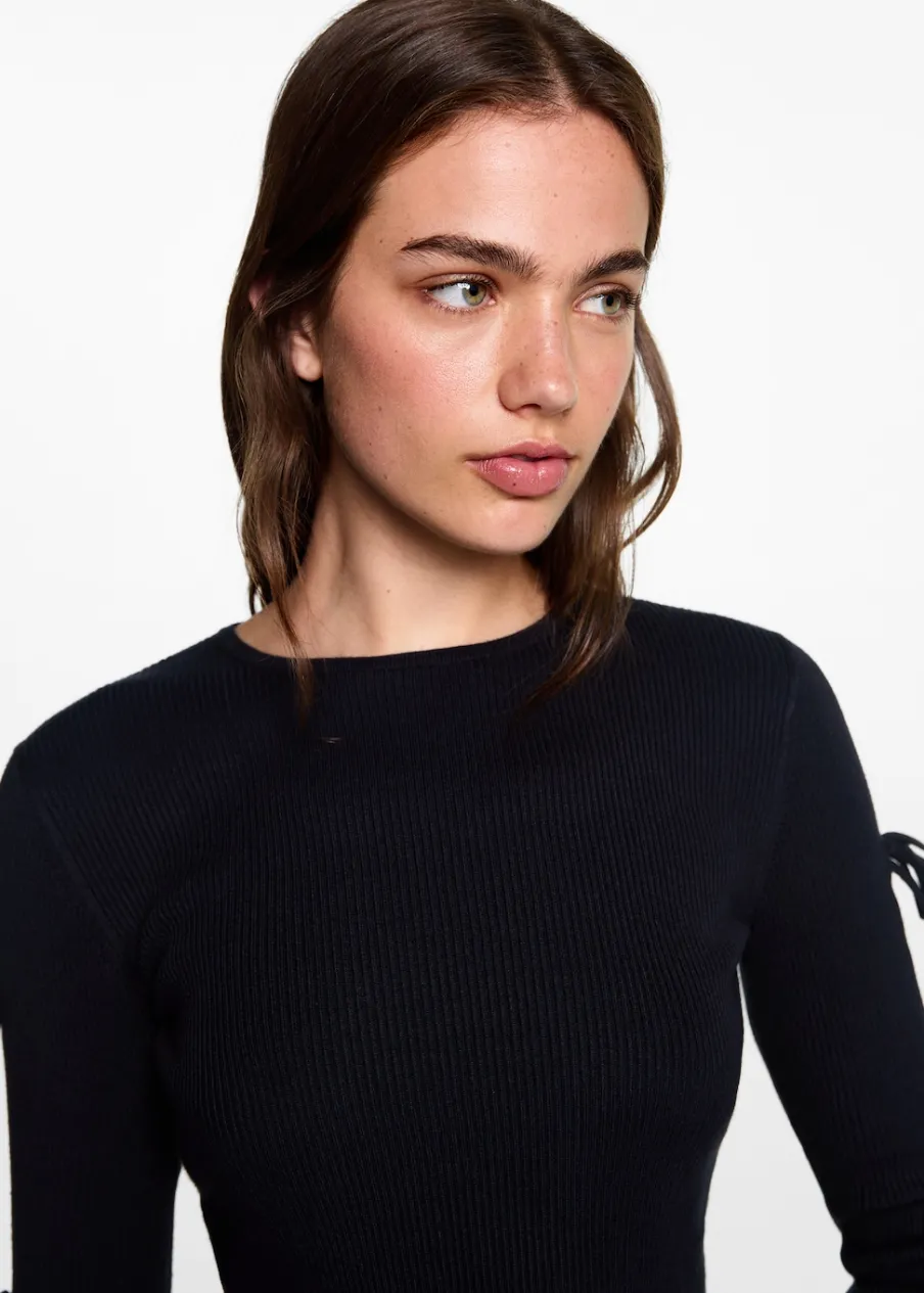 Powrót do szkoły. Model prosty. Okrągły dekolt. Długie rękawy z rozcięciem. Regulowane wiązanie. Modelka ma 172 cm wzrostu i nosi rozmiar M.