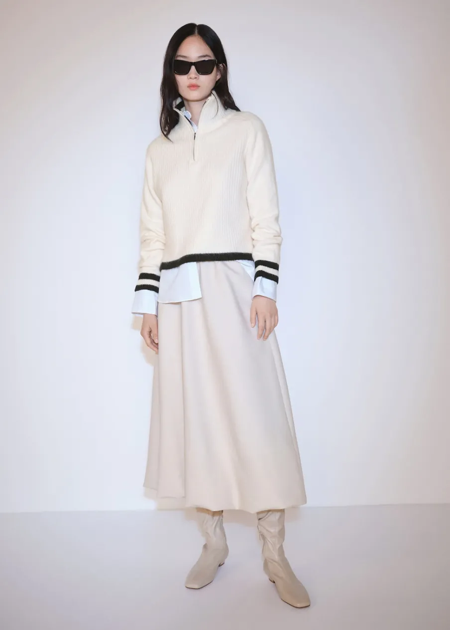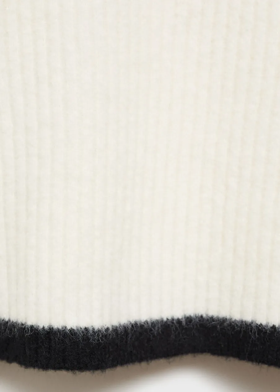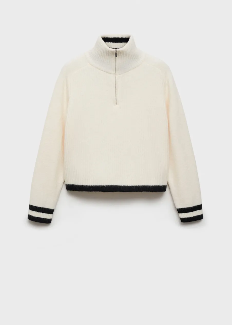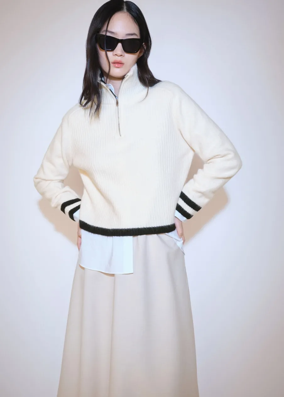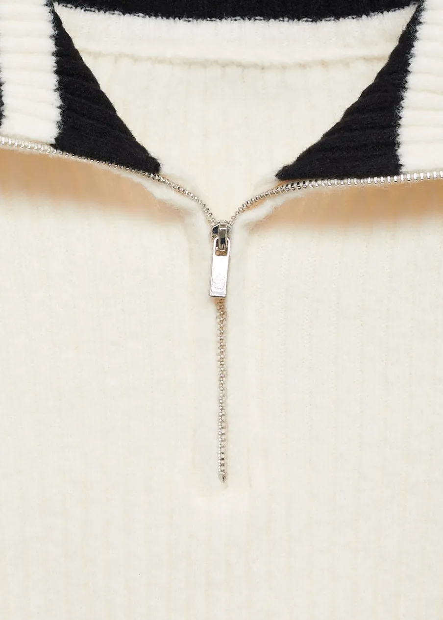 Tkanina z grubej dzianiny. Ściągaczowa dzianina. Model prosty. Wysoki kołnierz z zapięciem na zamek. Długi rękaw. Kontrastowe paski. Modelka ma 178 cm wzrostu i nosi rozmiar S/36.
