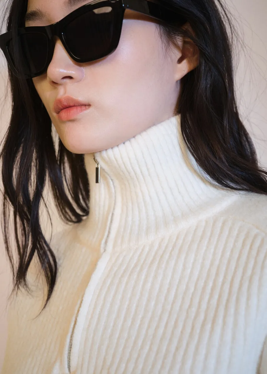 OpisTkanina z grubej dzianiny. Ściągaczowa dzianina. Model prosty. Wysoki kołnierz z zapięciem na zamek. Długi ręk…