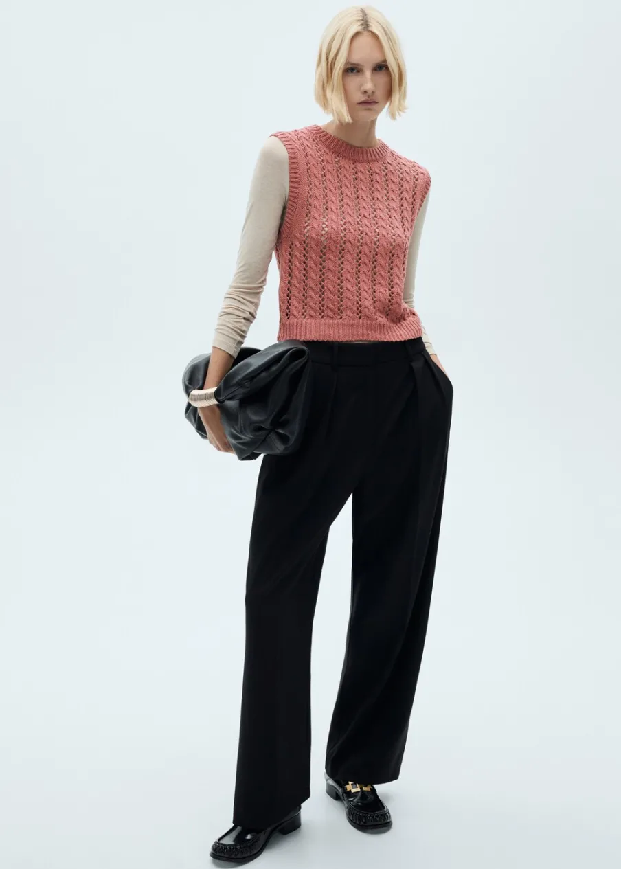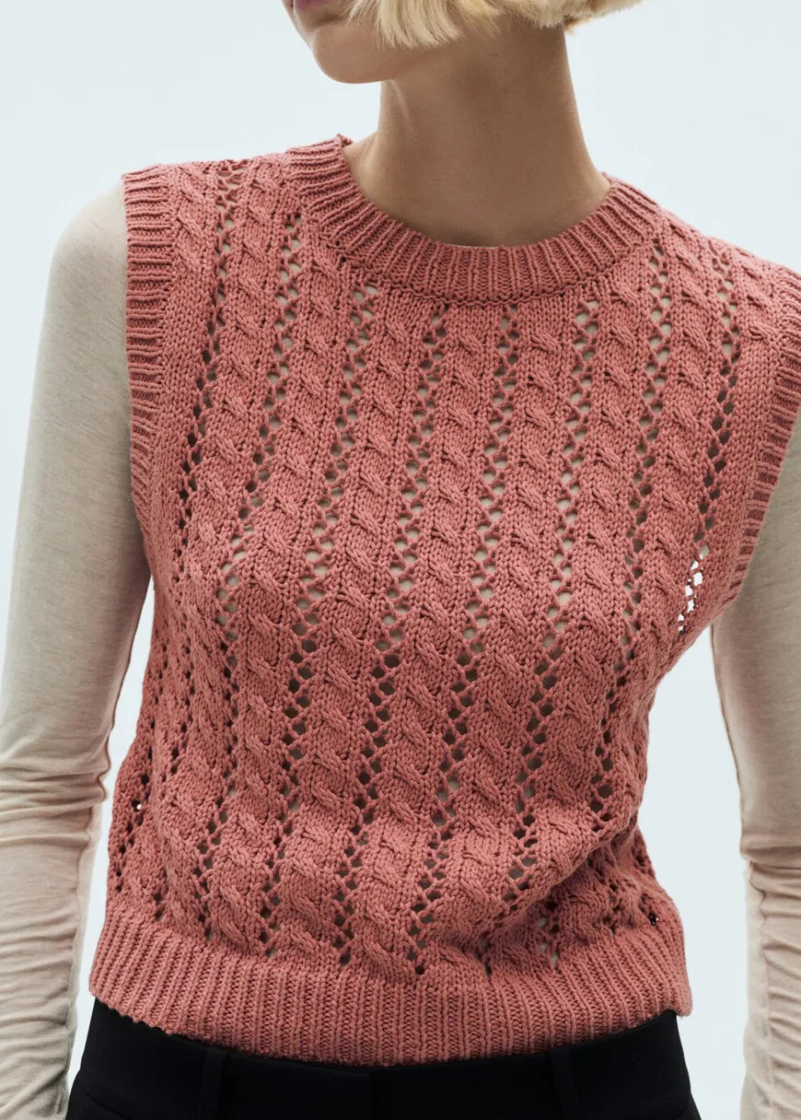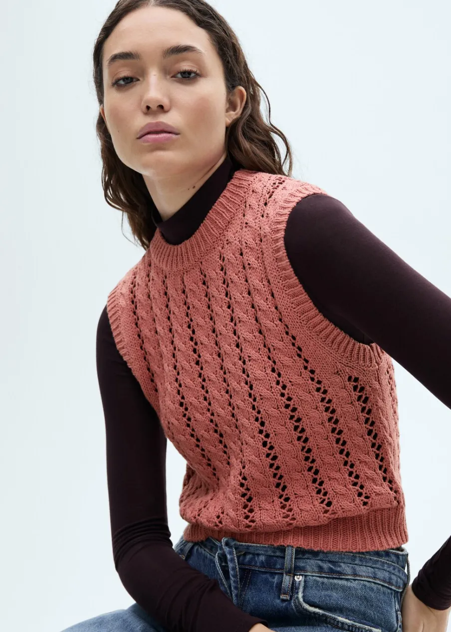Tkanina z grubej dzianiny. Deseń crop. Model prosty. Okrągły dekolt. Bez rękawów. Ażurowe detale. Modelka ma 178 cm wzrostu i nosi rozmiar S/36. Modelka ma 179 cm wzrostu i nosi rozmiar S/36.