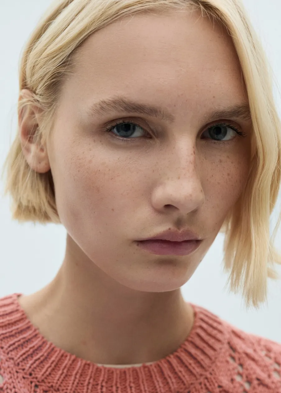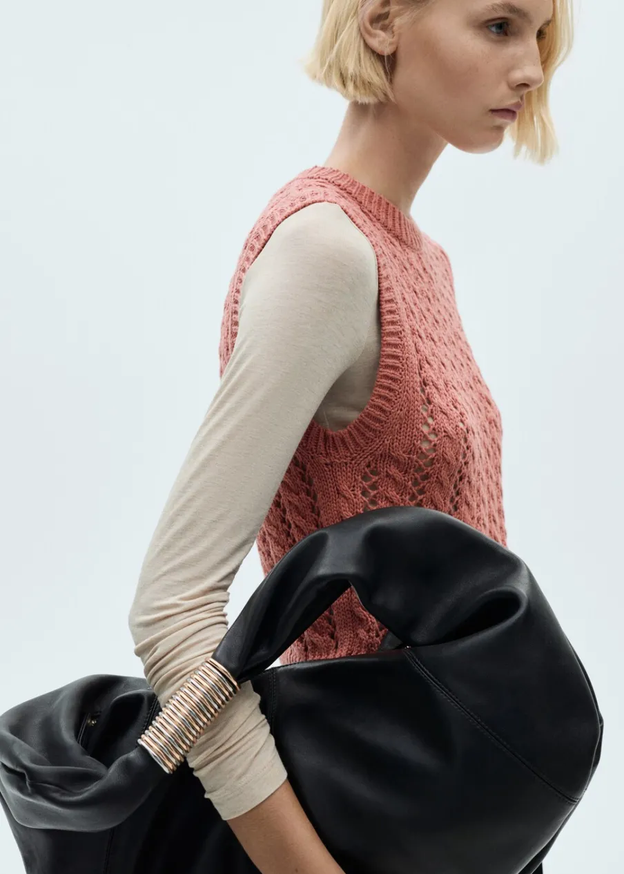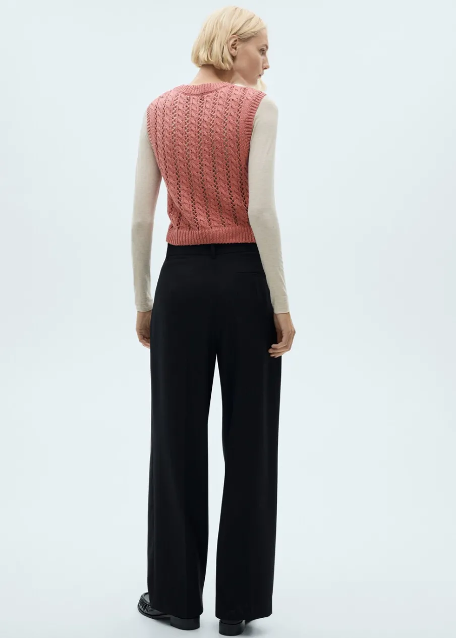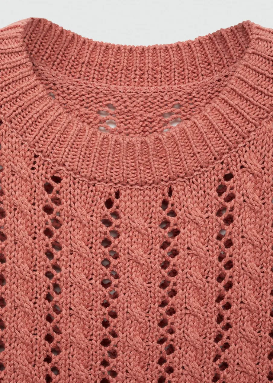 Tkanina z grubej dzianiny. Deseń crop. Model prosty. Okrągły dekolt. Bez rękawów. Ażurowe detale. Modelka ma 178 cm wzrostu i nosi rozmiar S/36. Modelka ma 179 cm wzrostu i nosi rozmiar S/36.