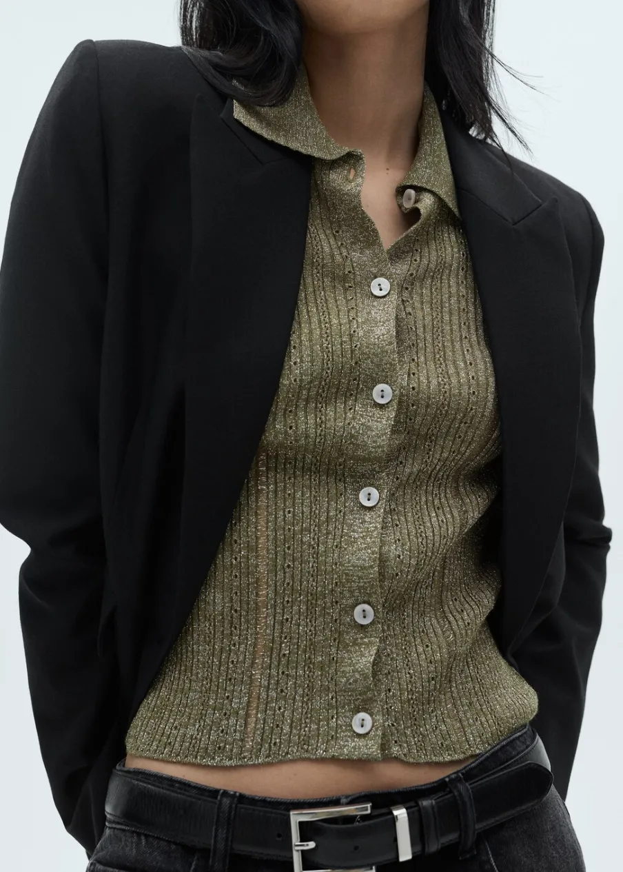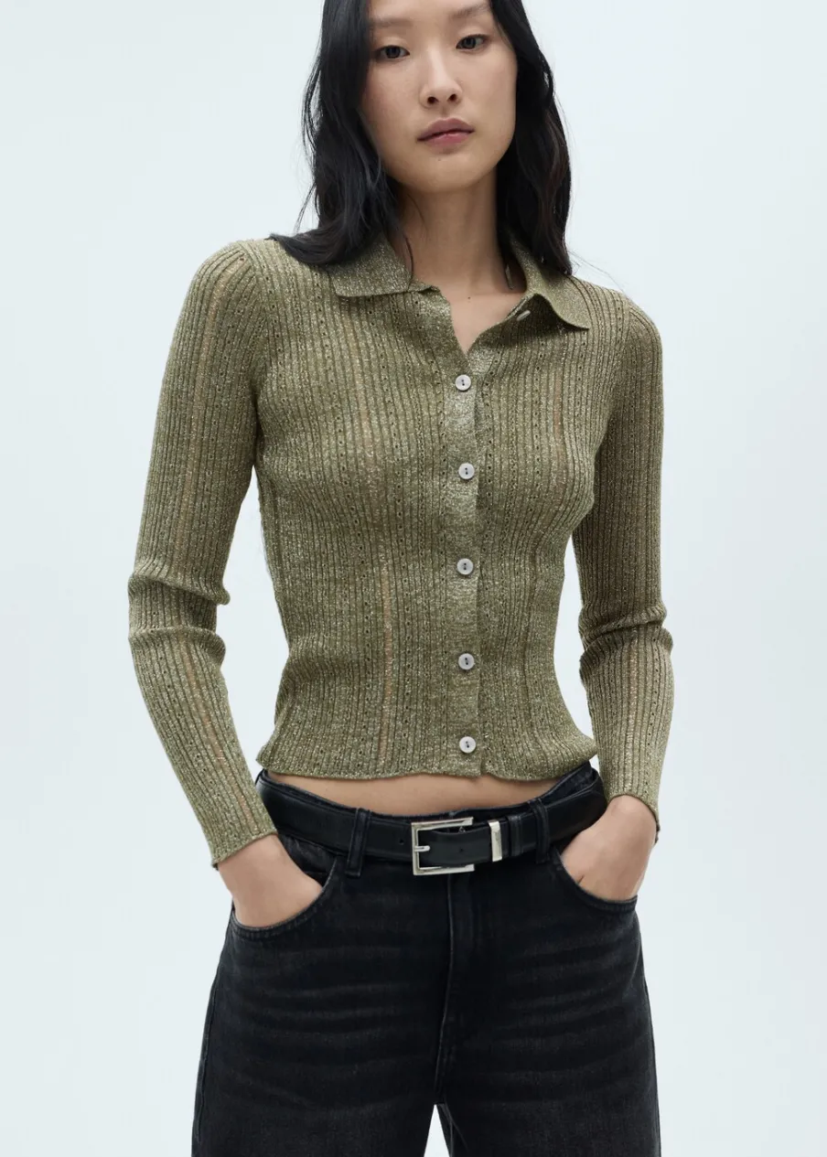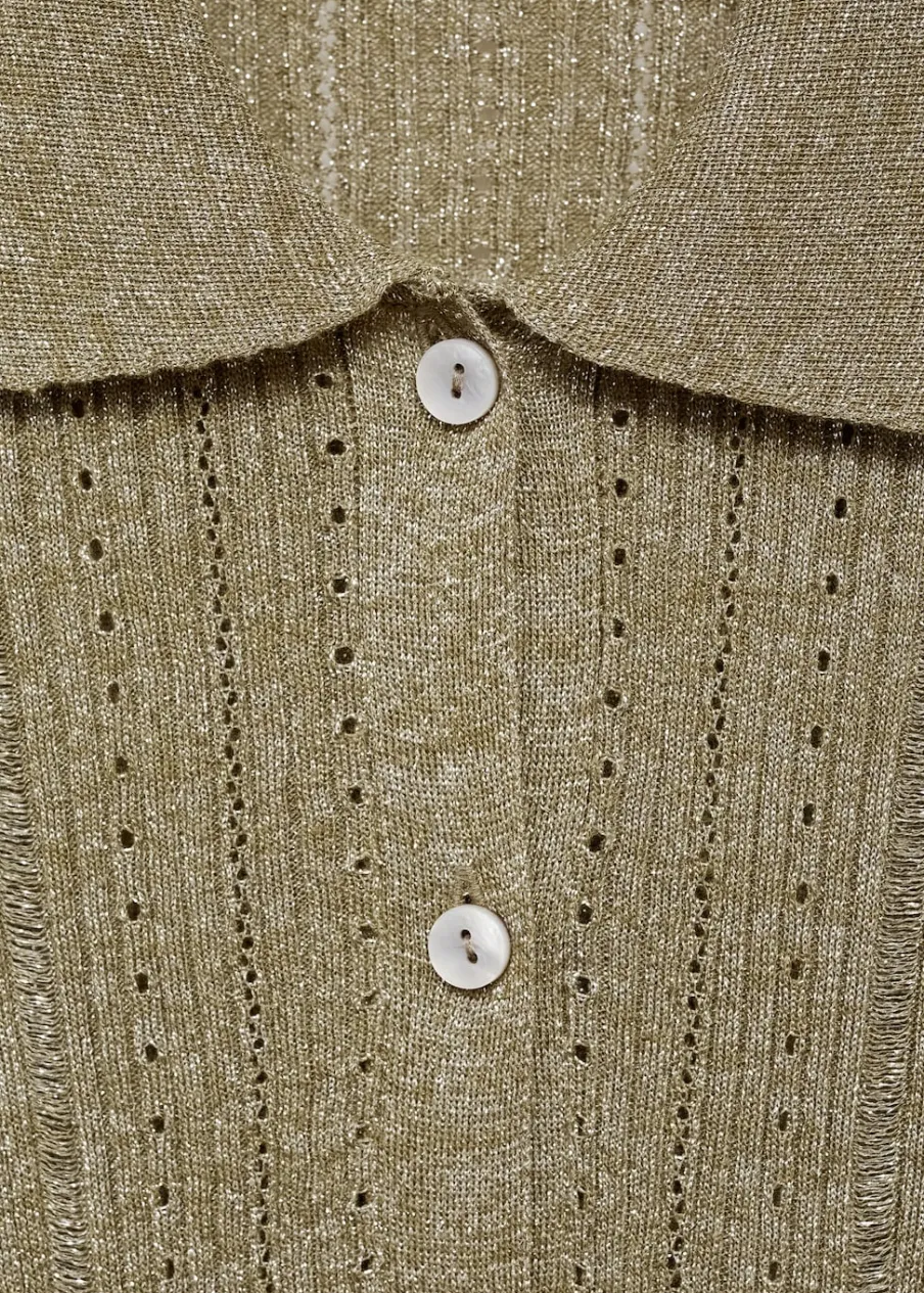 Tkanina z cienkiej dzianiny. Tkanina ze ściągaczowej dzianiny. Tkanina lureks. Koszulowy kołnierz. Długi rękaw. Ażurowe detale. Zapięcie z przodu na guziki. Modelka ma 175 cm wzrostu i nosi rozmiar S/36.