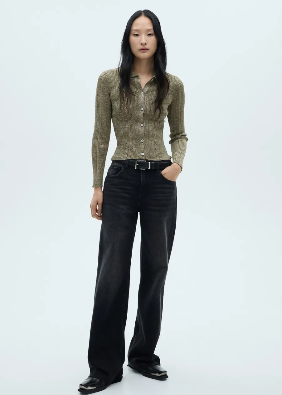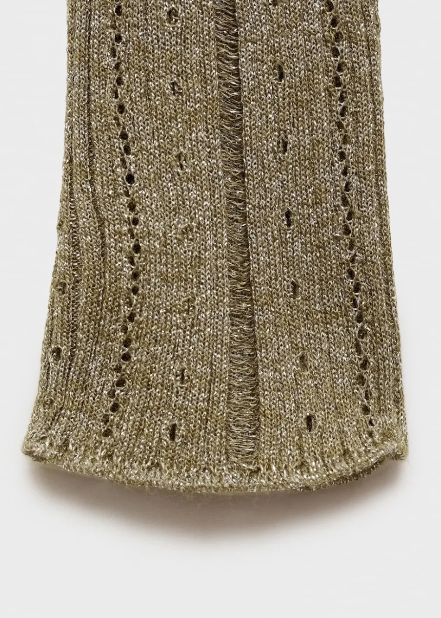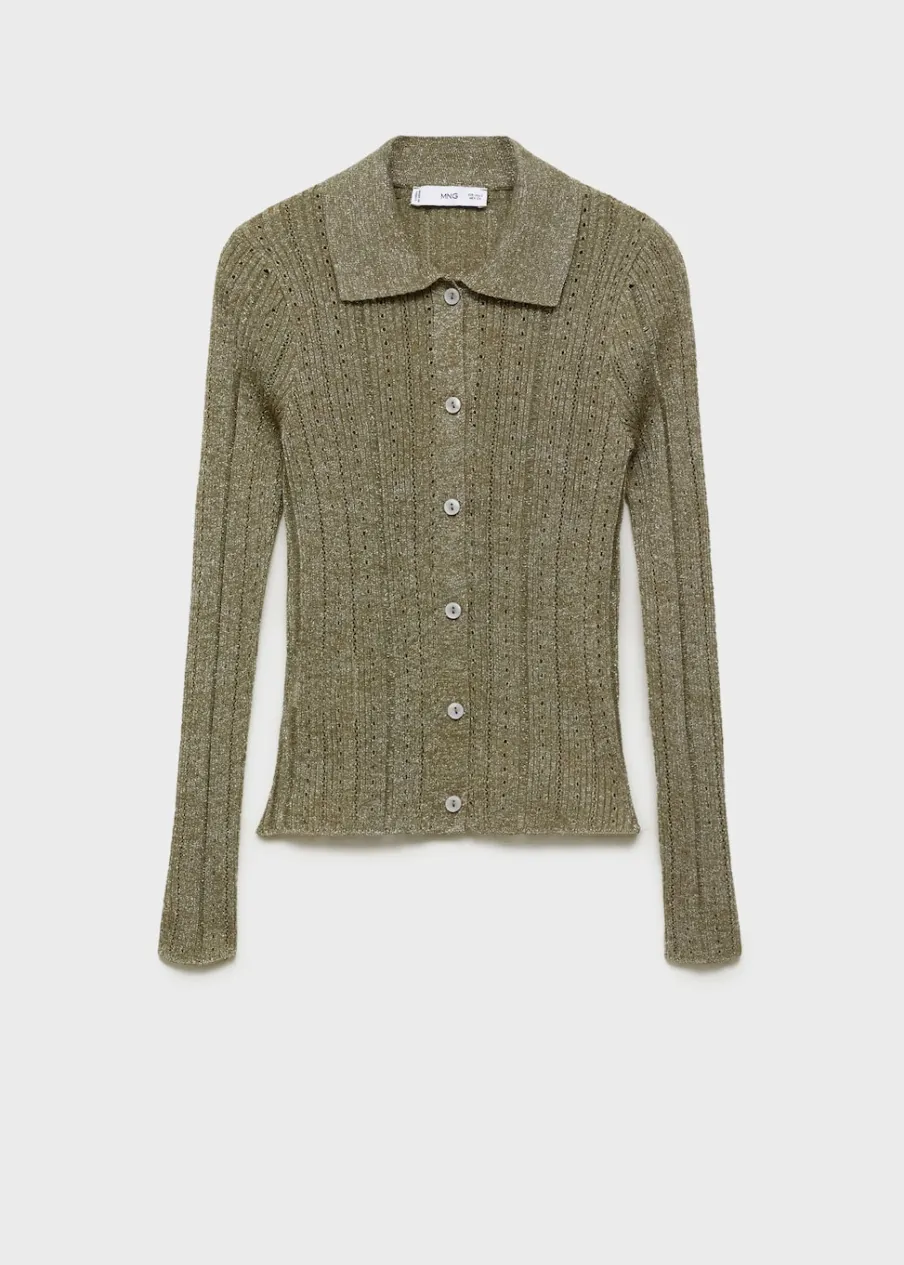 Tkanina z cienkiej dzianiny. Tkanina ze ściągaczowej dzianiny. Tkanina lureks. Koszulowy kołnierz. Długi rękaw. Ażurowe detale. Zapięcie z przodu na guziki. Modelka ma 175 cm wzrostu i nosi rozmiar S/36.