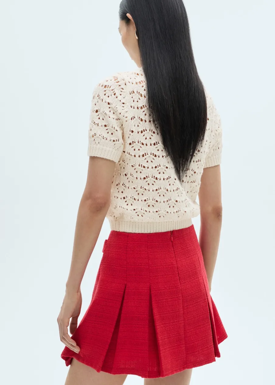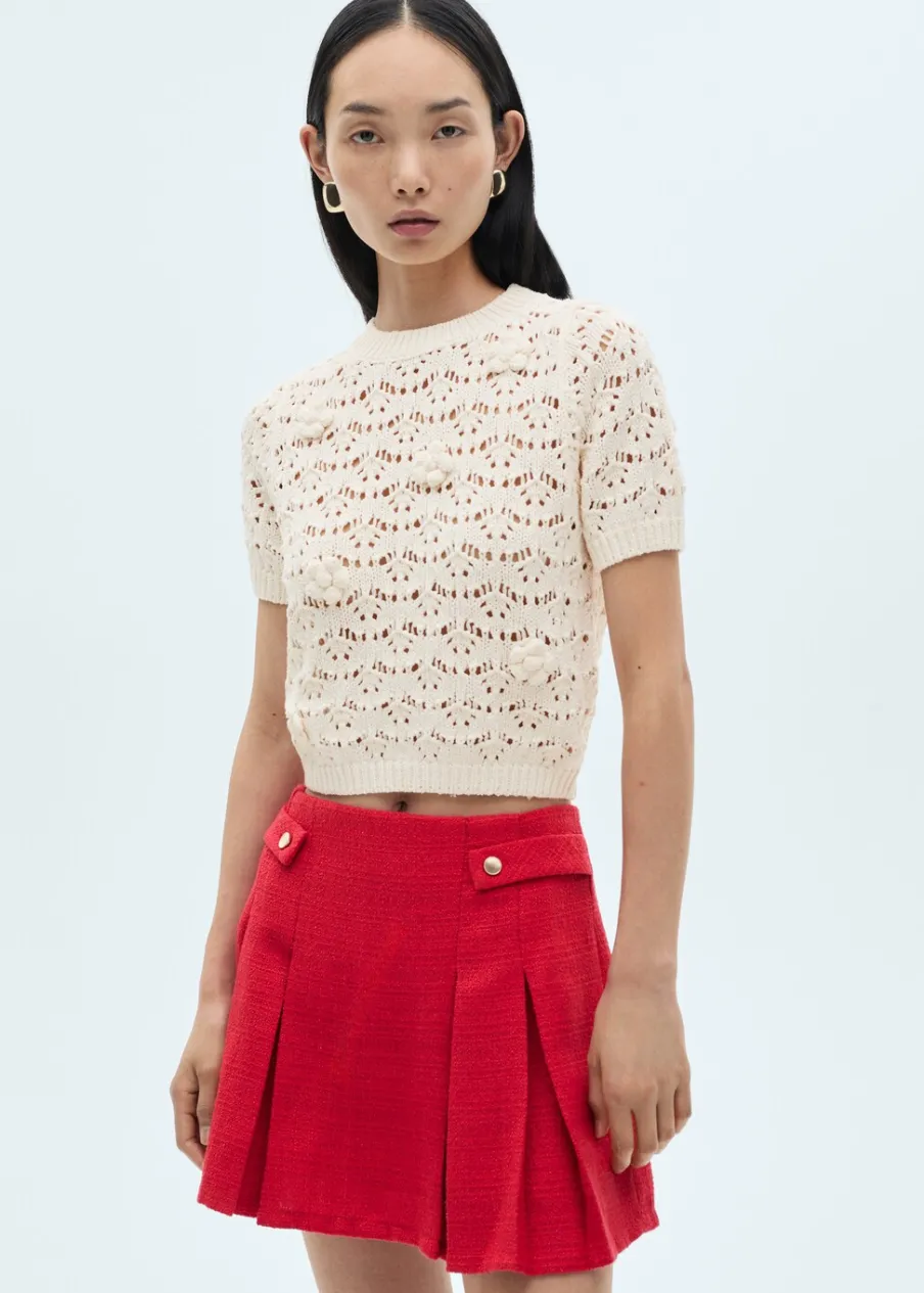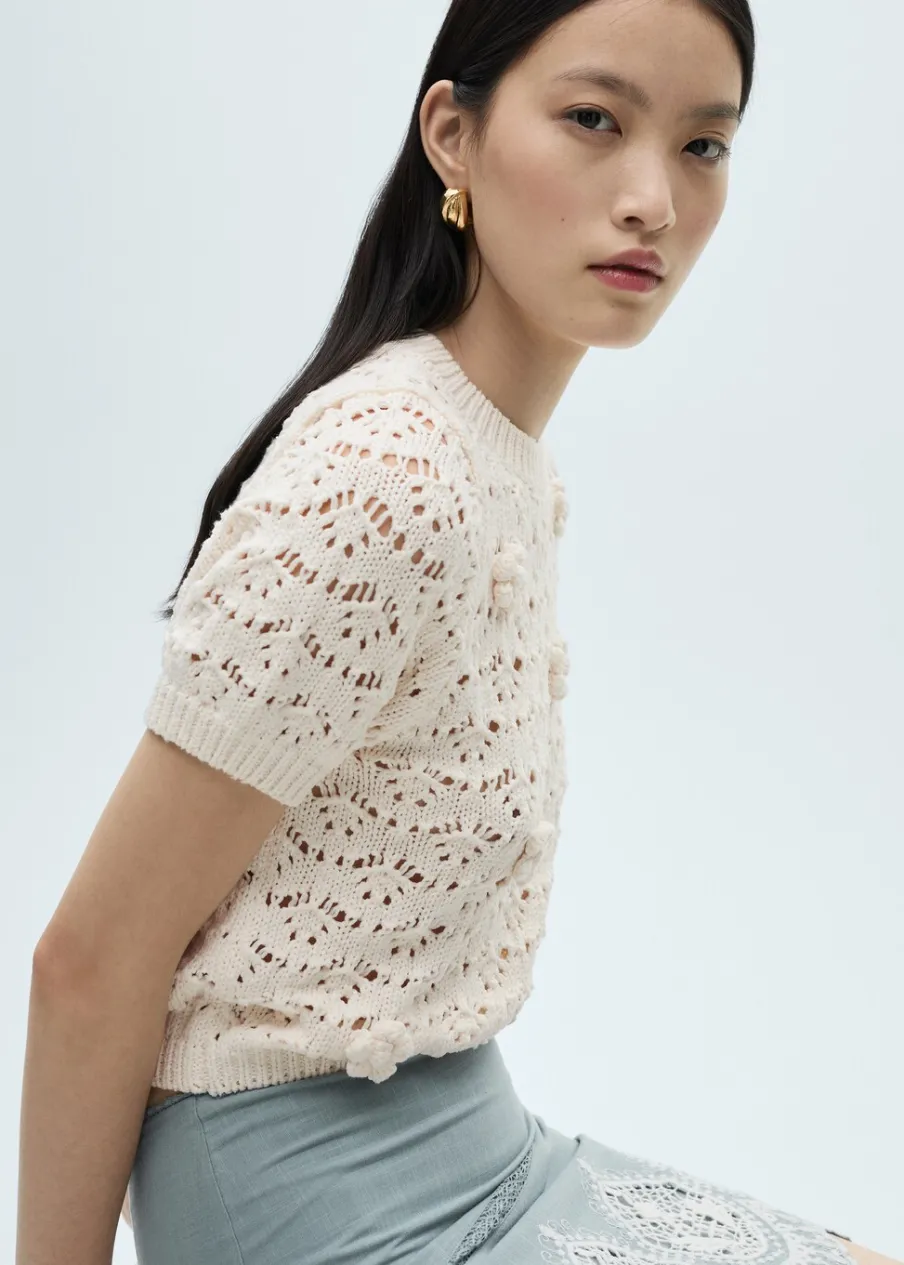 Ażurowa dzianina. Dzianina średniej grubości. Deseń crop. Model prosty. Okrągły dekolt. Krótki rękaw. Bez zapięcia. Ściągaczowe wykończenia.