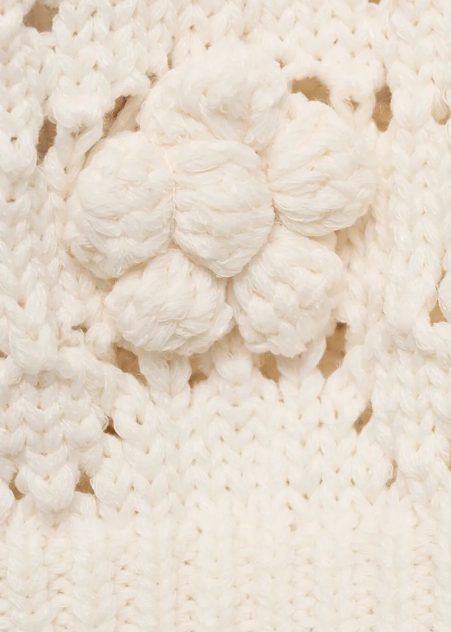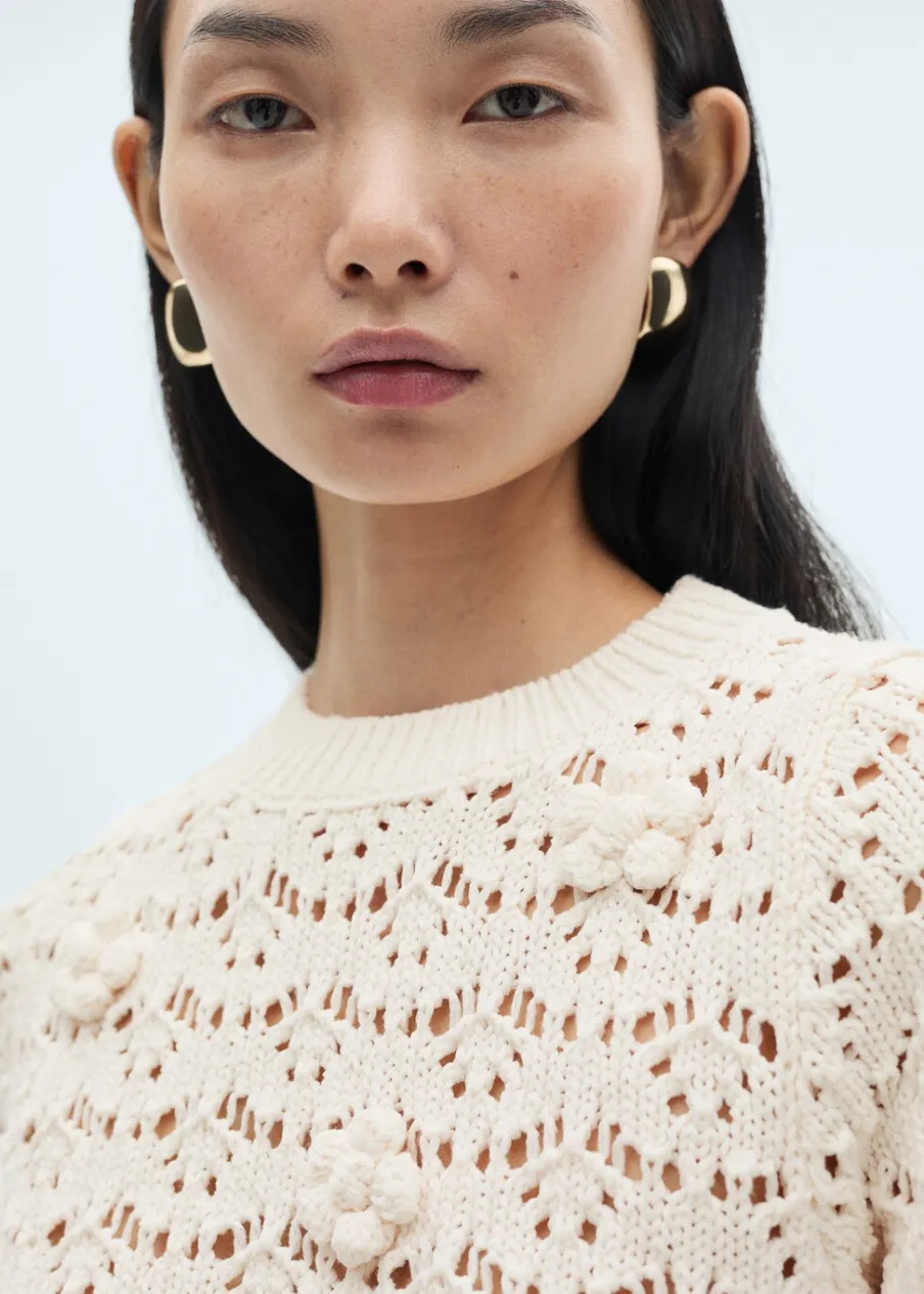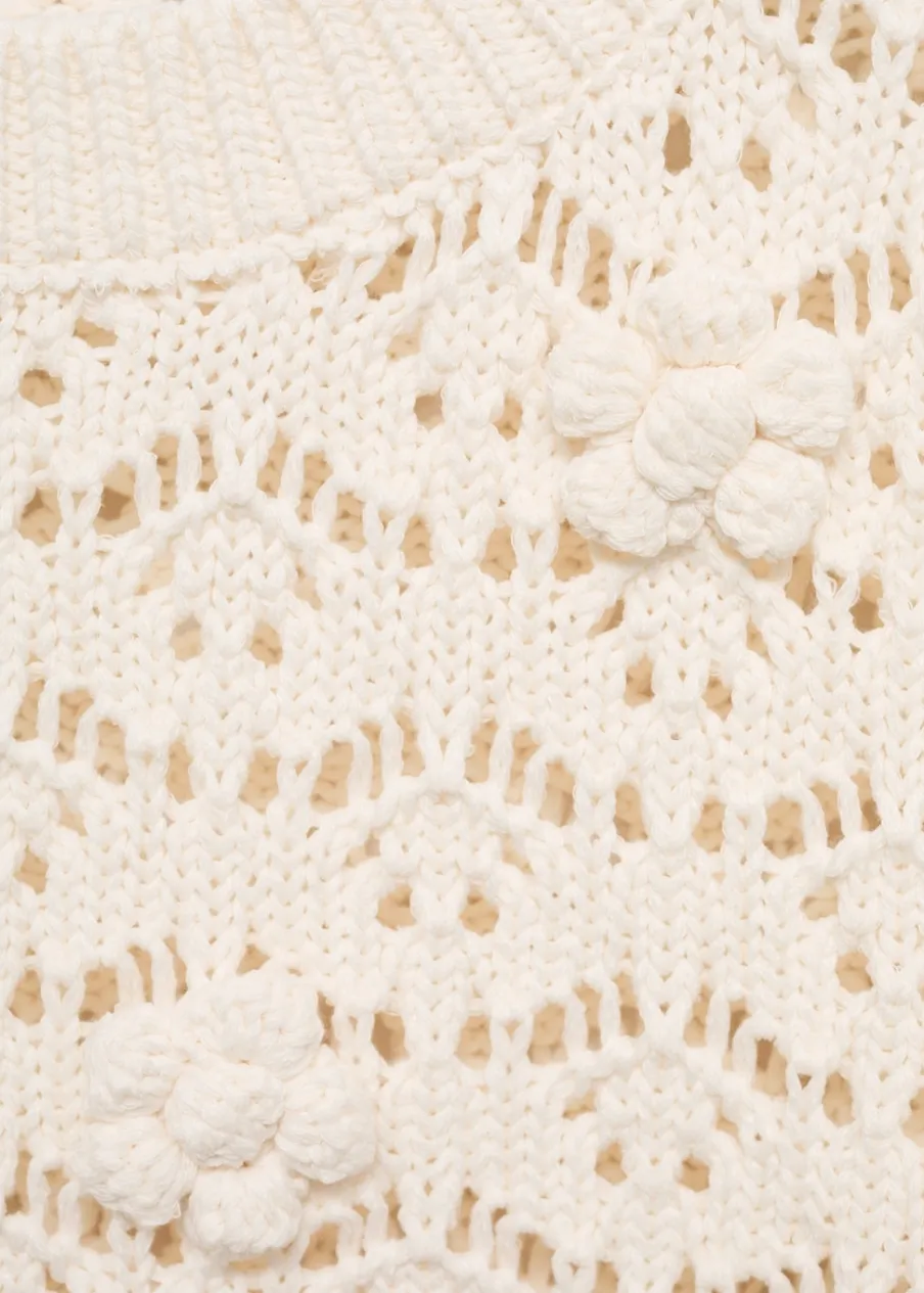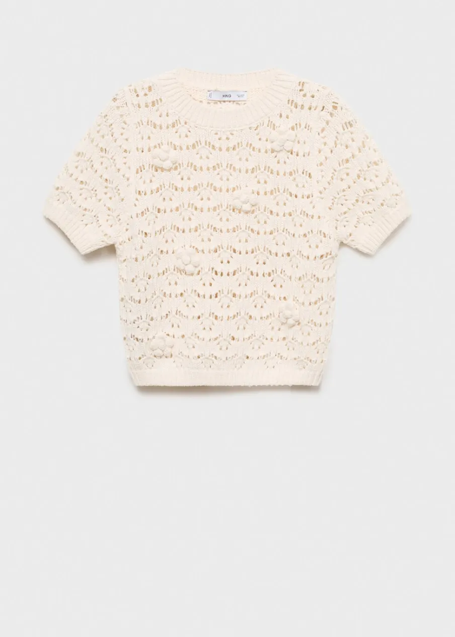 OpisAżurowa dzianina. Dzianina średniej grubości. Deseń crop. Model prosty. Okrągły dekolt. Krótki rękaw. Bez za…