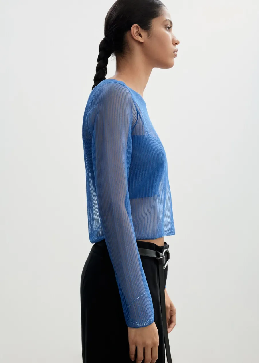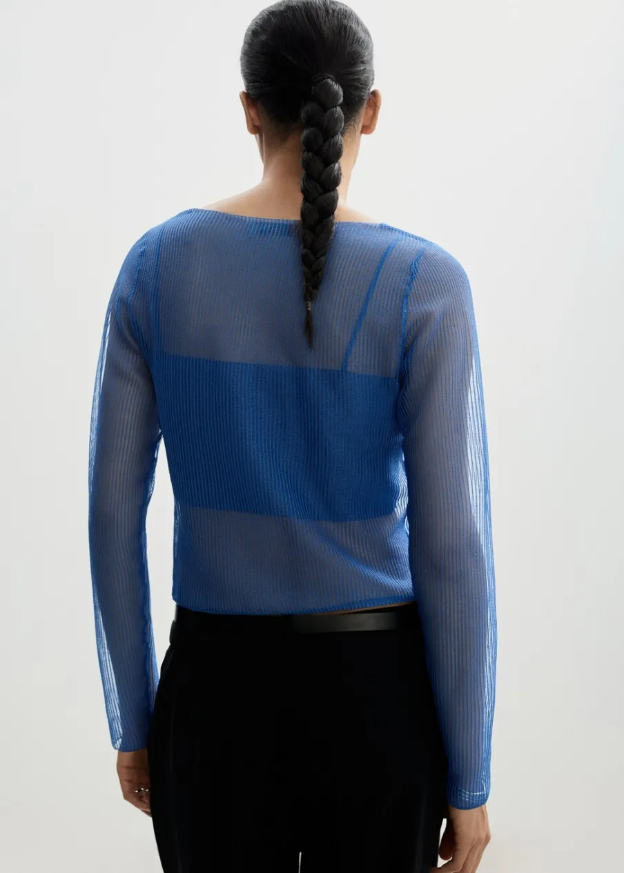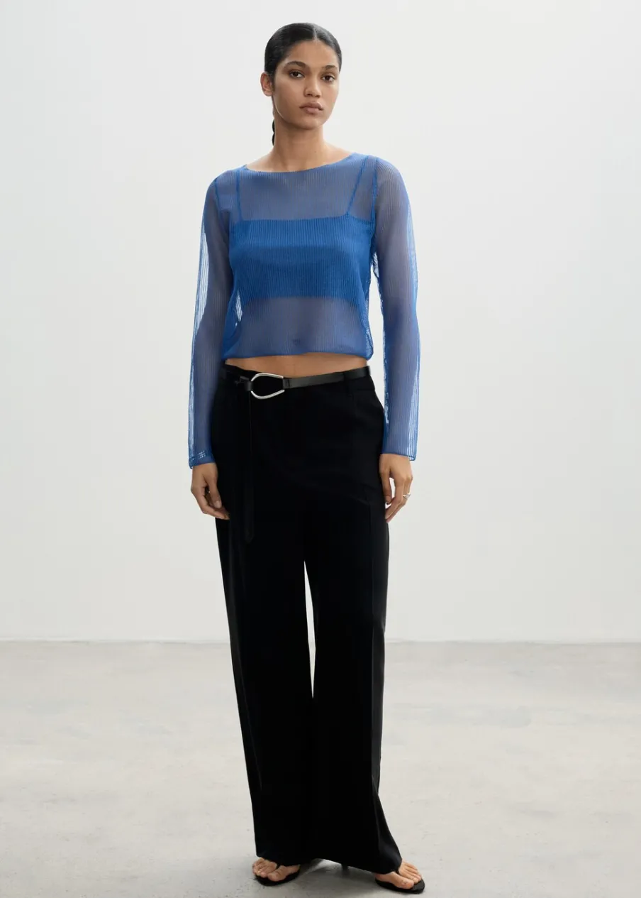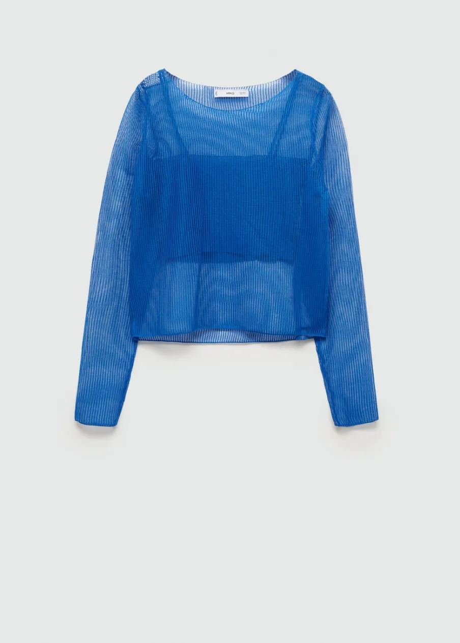 Tkanina z cienkiej dzianiny. Półprzezroczysta tkanina. Model łączony. Model prosty. Okrągły dekolt. Krótki rękaw. Bez zapięcia.