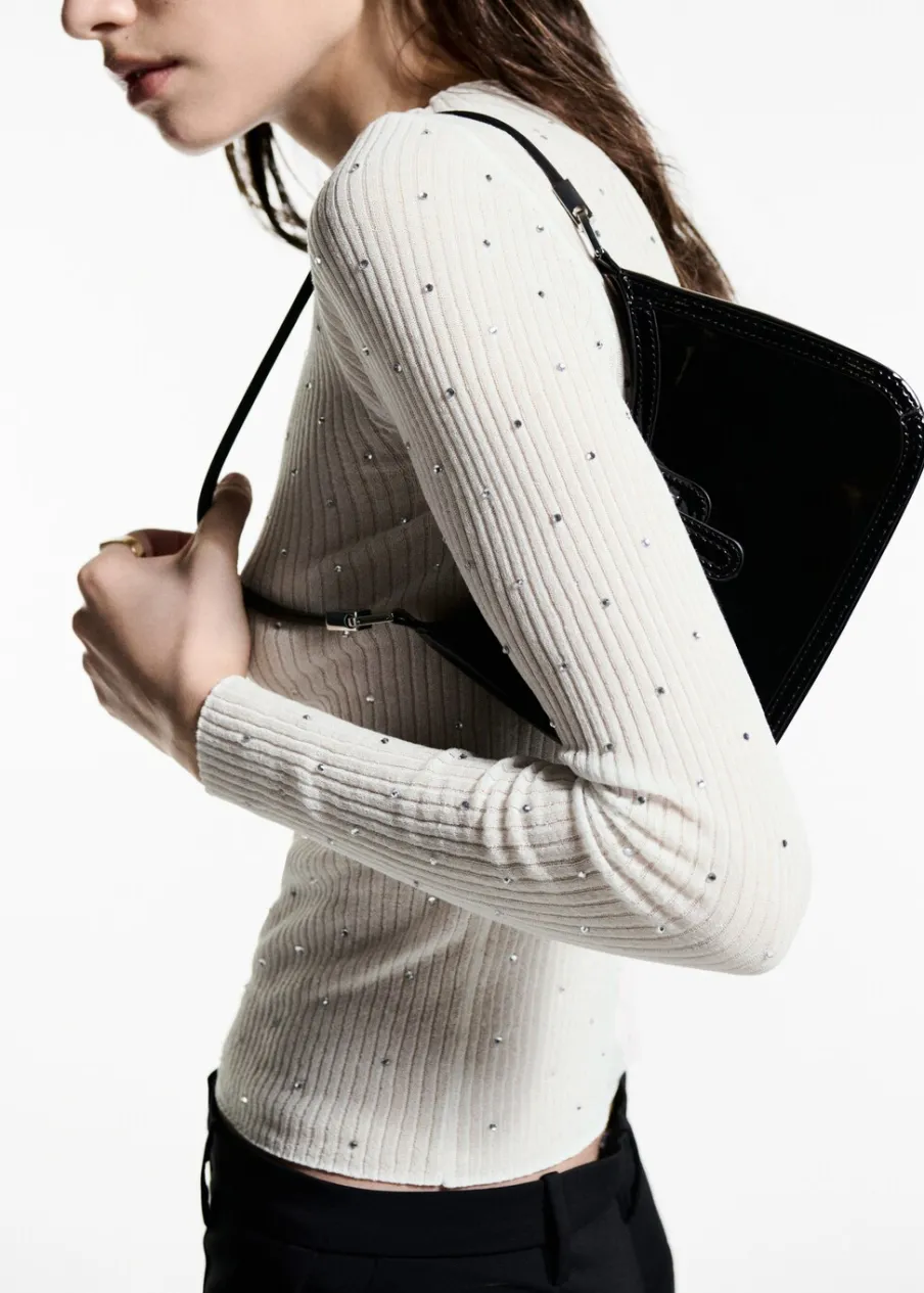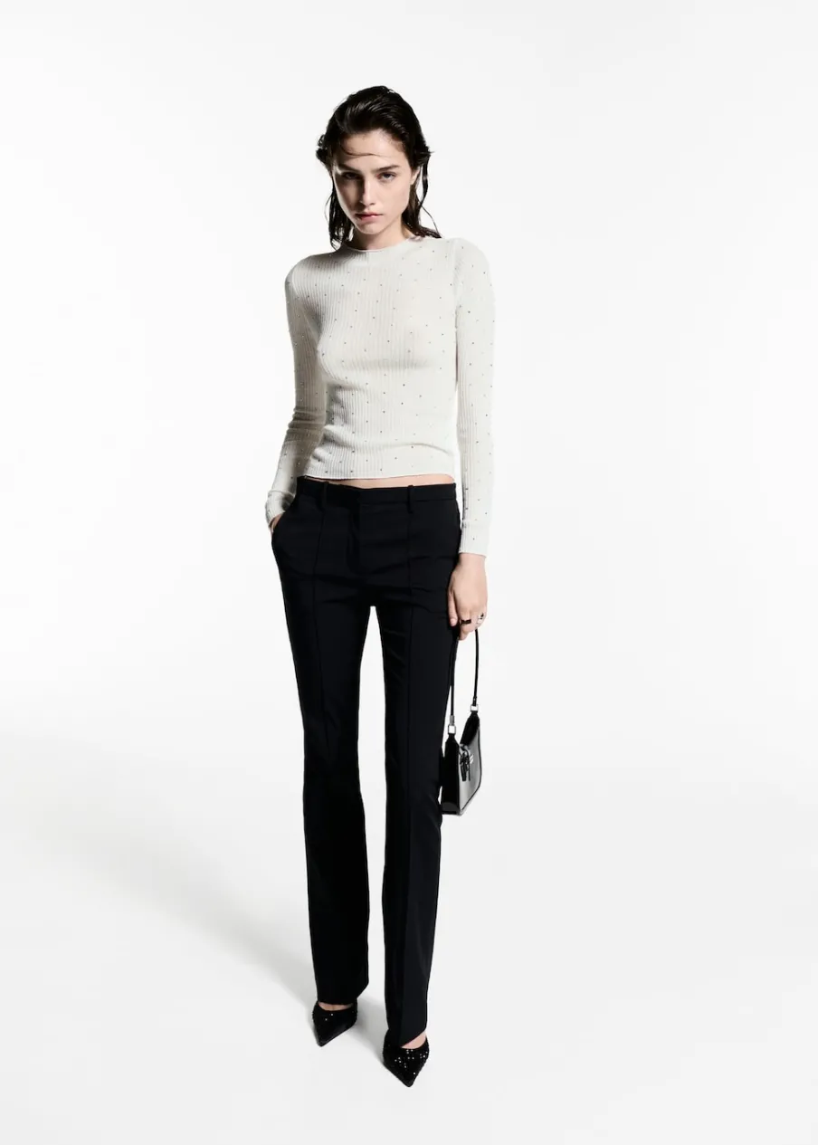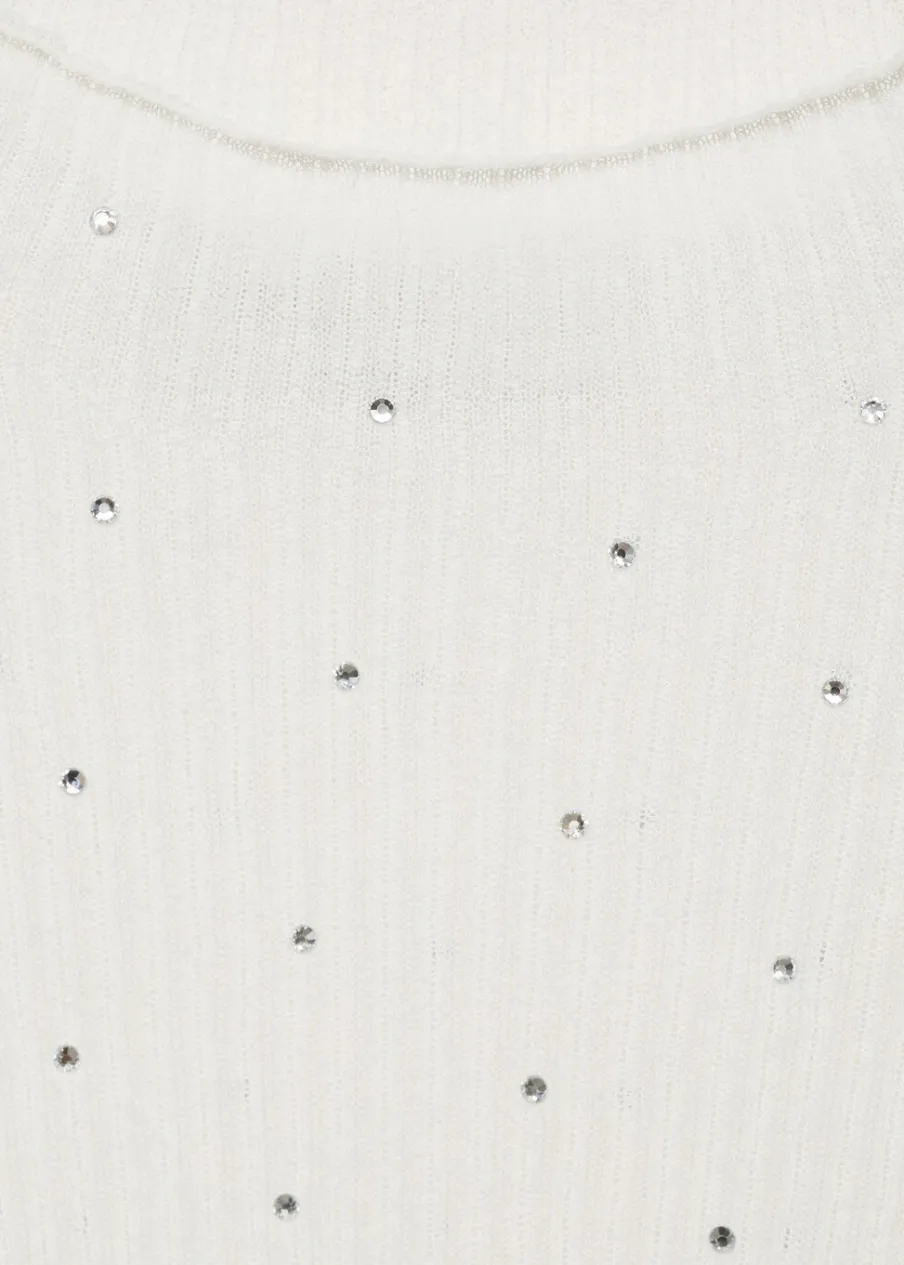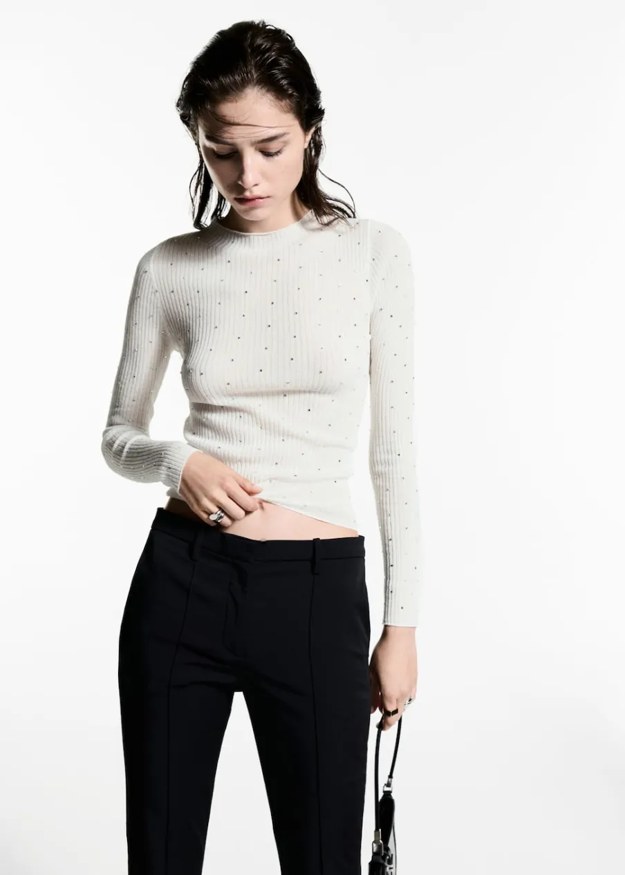 Ściągaczowa dzianina. Model wcięty. Półgolf. Długi rękaw. Detal strass. Kolekcja wizytowa. Modelka ma 177 cm wzrostu i nosi rozmiar S/36.