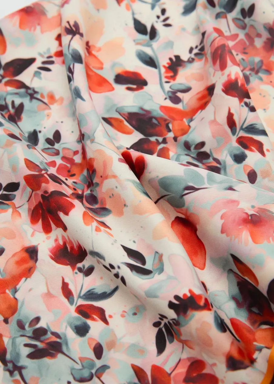 Satynowa tkanina. Kwadratowy fason. Wzór w kwiaty.
