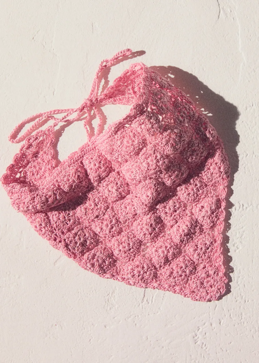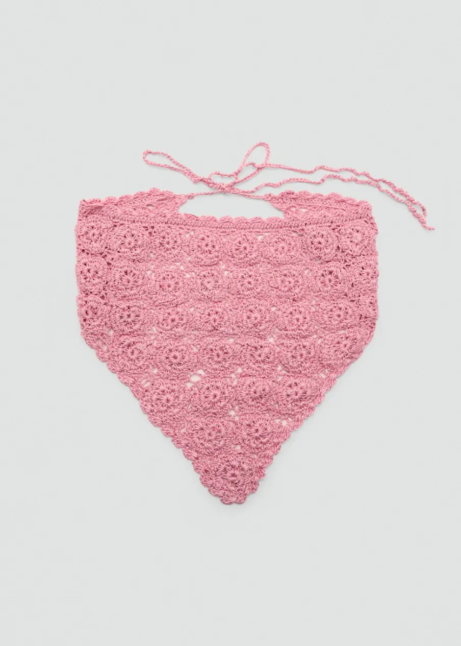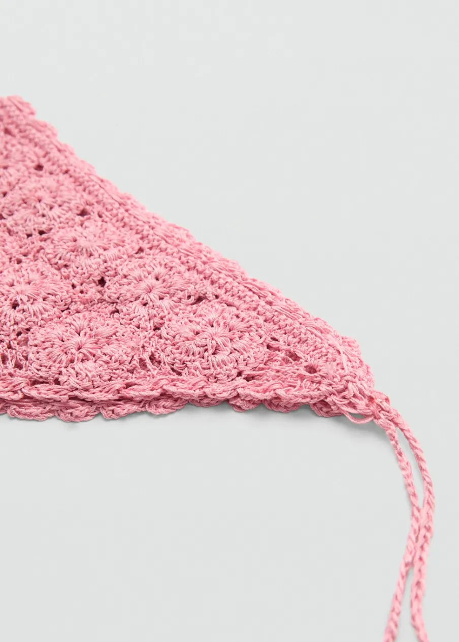 OpisDzianinowa tkanina. Trójkątny kształt. Wiązane zapięcie. Szydełkowa tkanina.