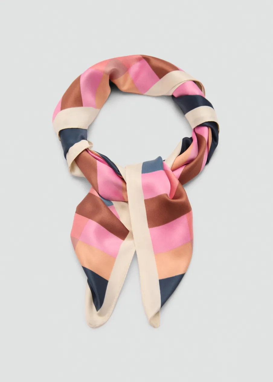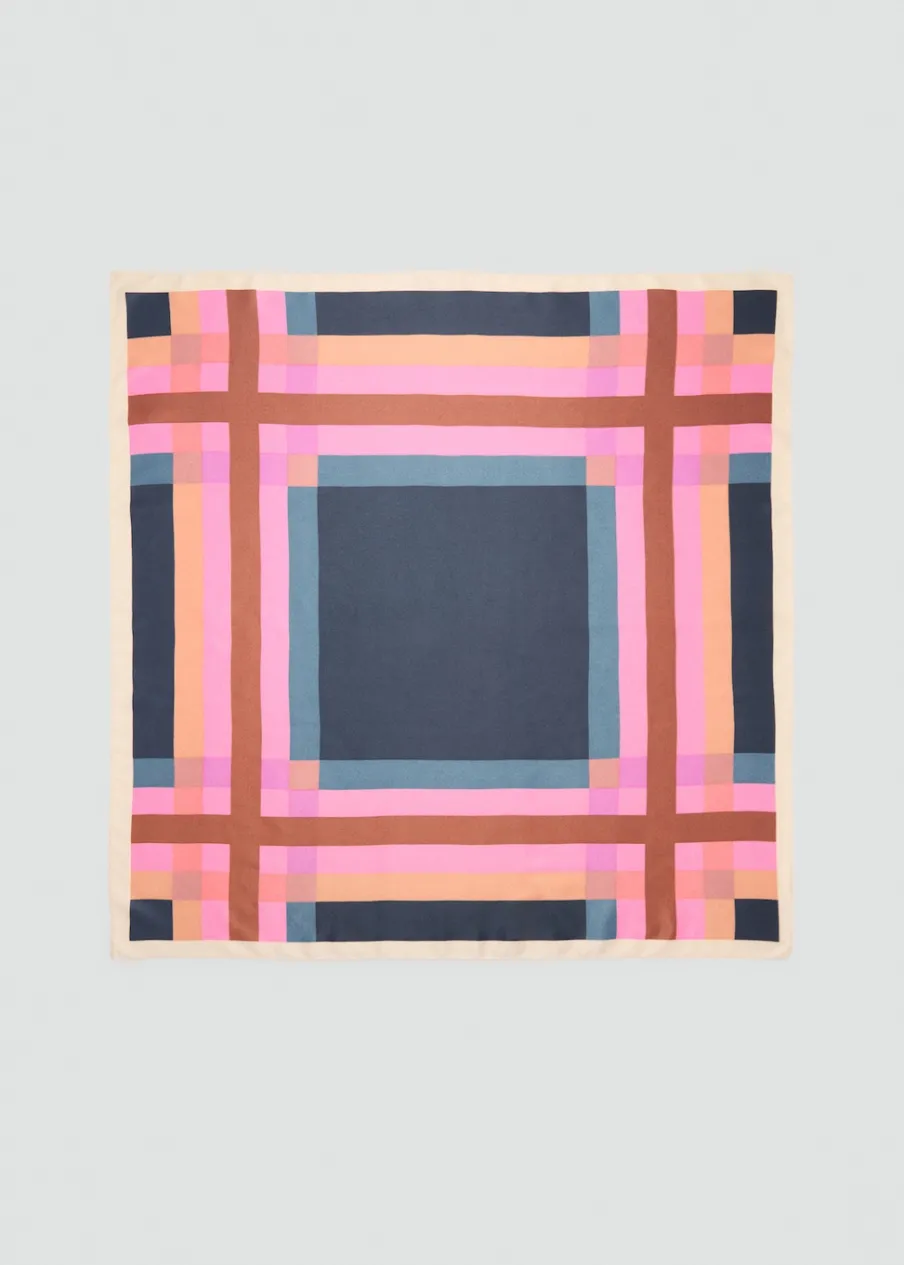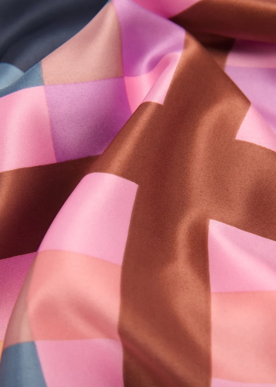 Deseń w kratę. Lejąca tkanina z satynowym wykończeniem. Kwadratowy fason.