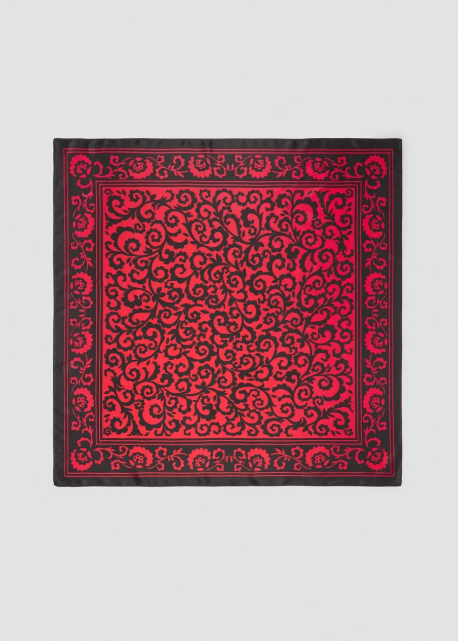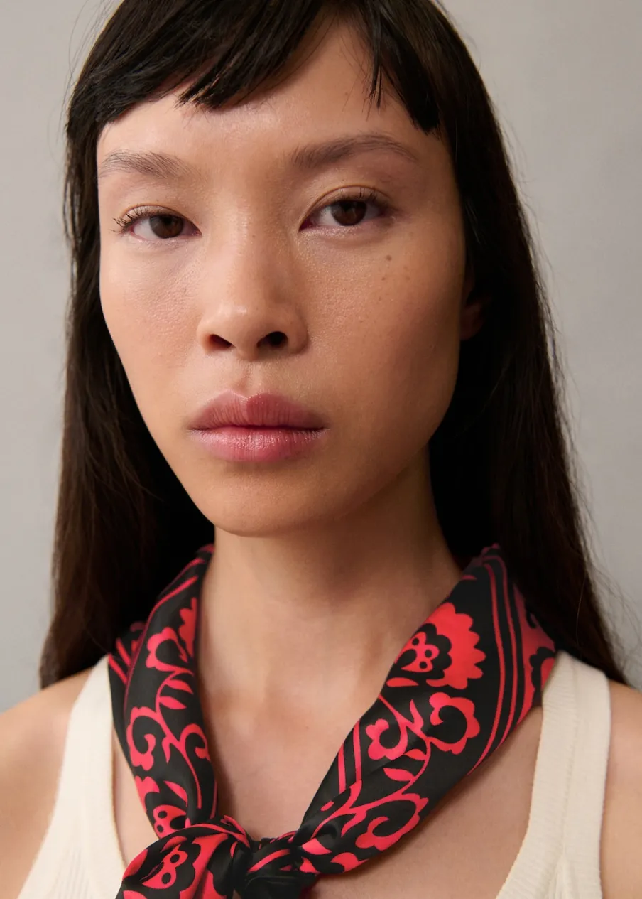 Satynowa tkanina. Kwadratowy fason. Kontrastowe szwy. Nadruk.