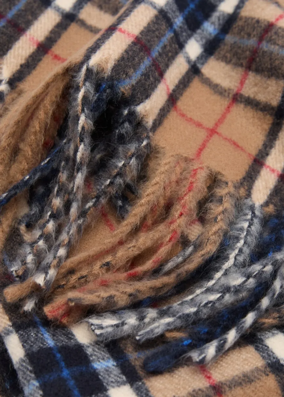 Dzianinowa tkanina. Deseń w kratę. Frędzlowe wykończenie.