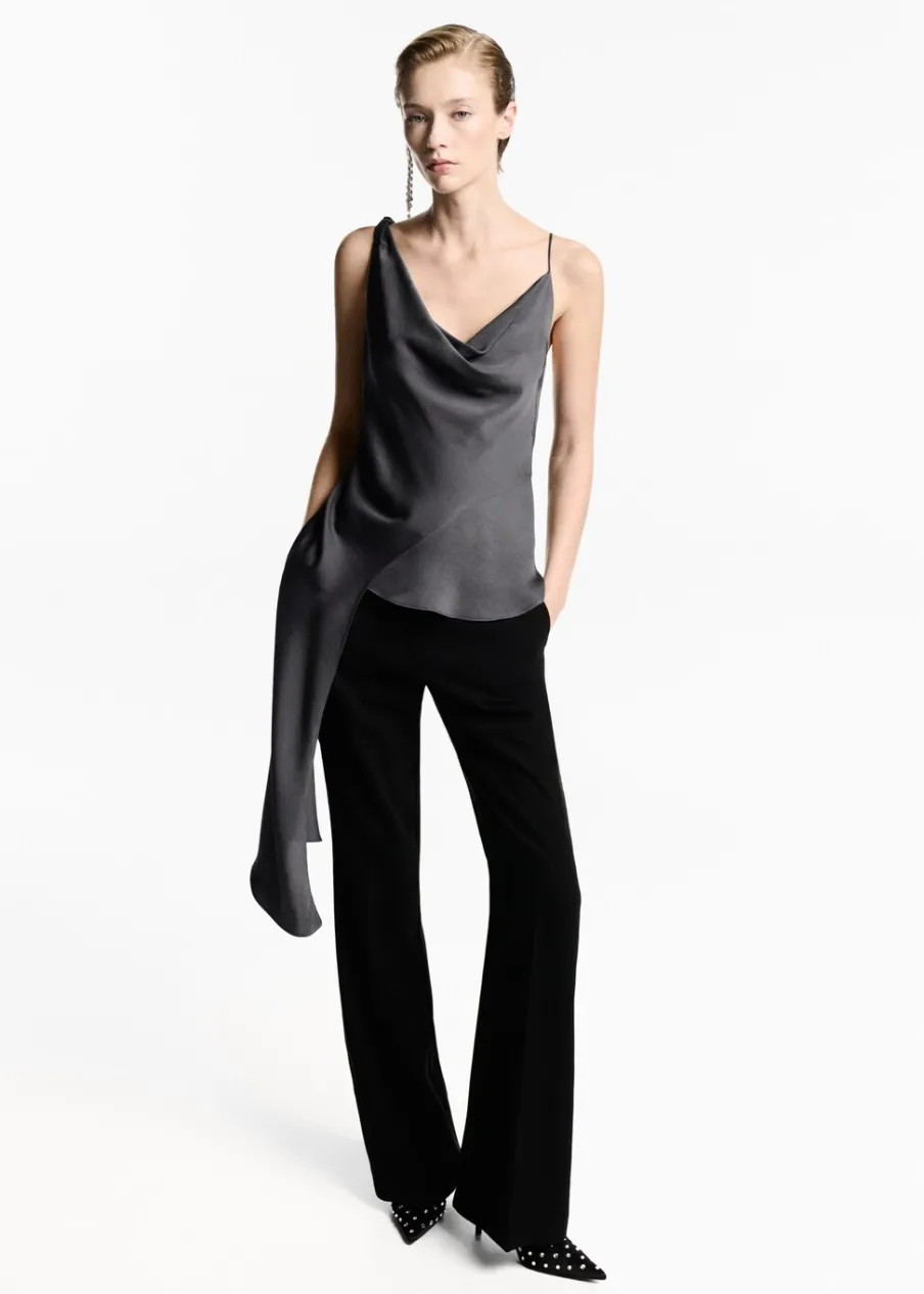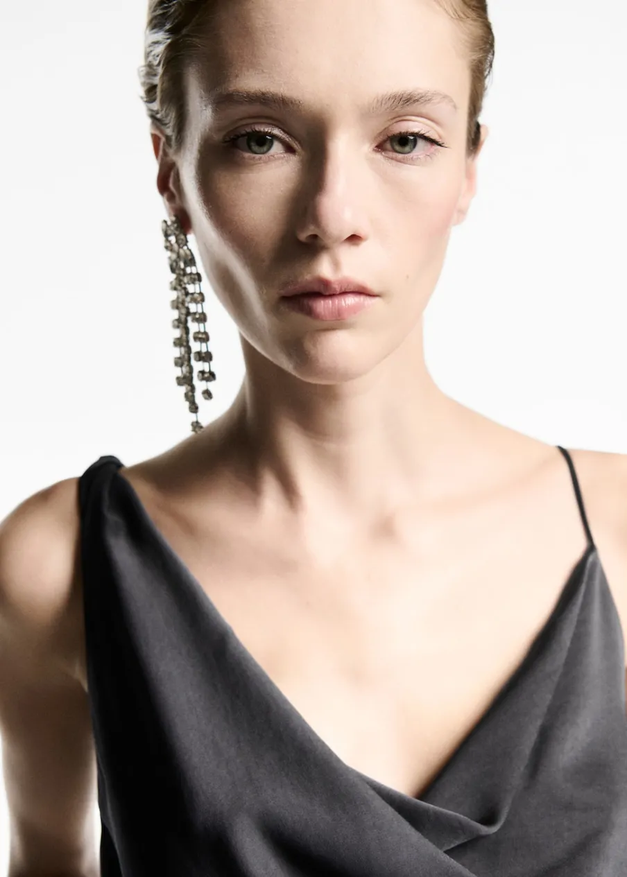 Satynowa tkanina. Asymetryczny krój. Model wcięty. Drapowany dekolt. Cienkie ramiączka. Bez rękawów. Sznurowanie z boku. Bez zapięcia. Modelka ma 181 cm wzrostu i nosi rozmiar S/36. Kolekcja wizytowa.