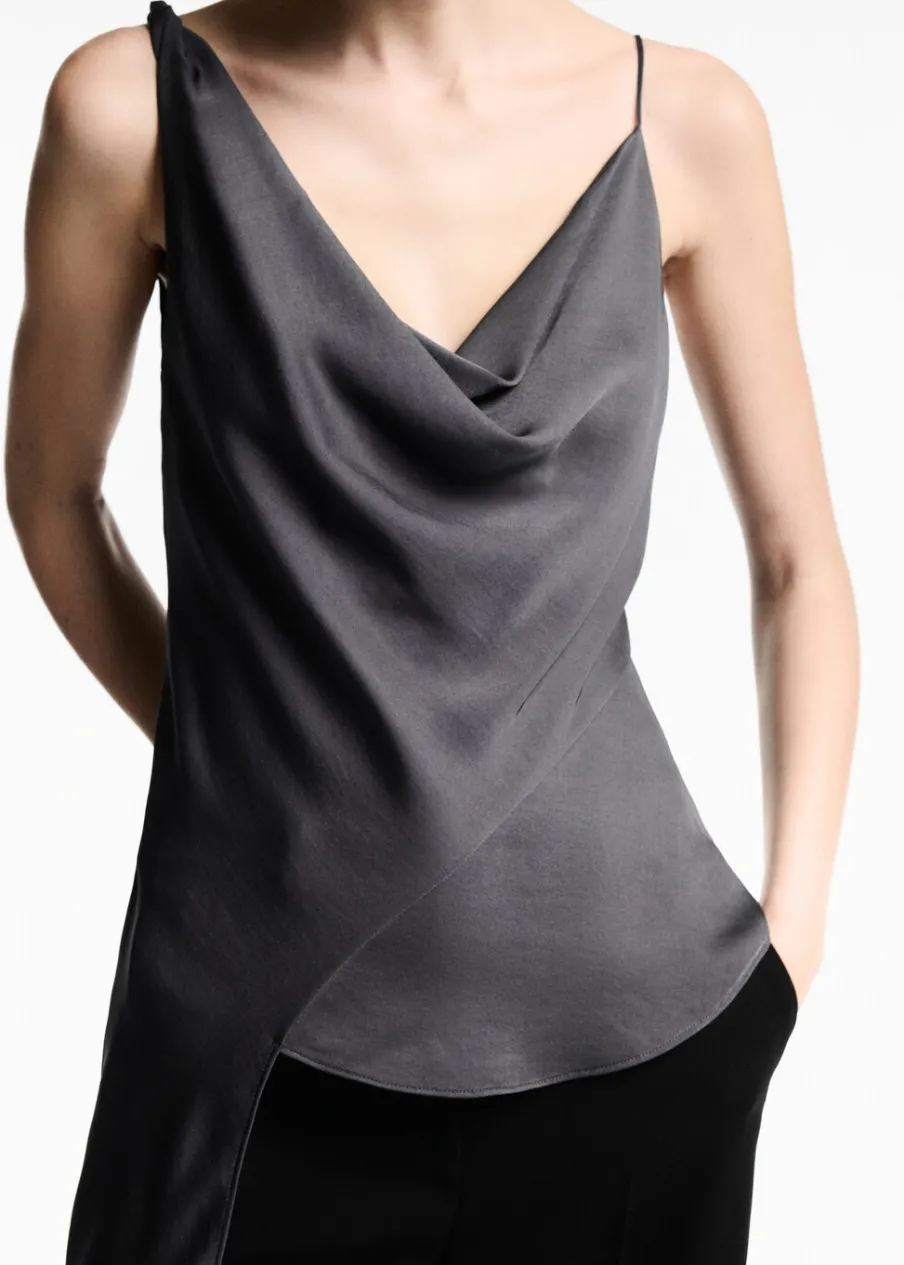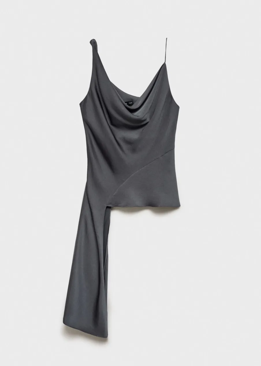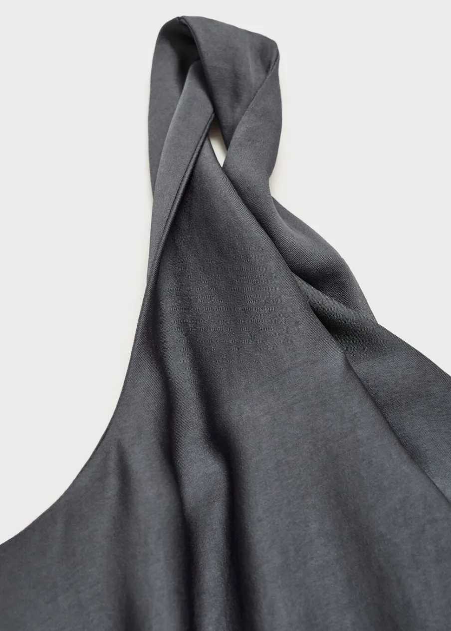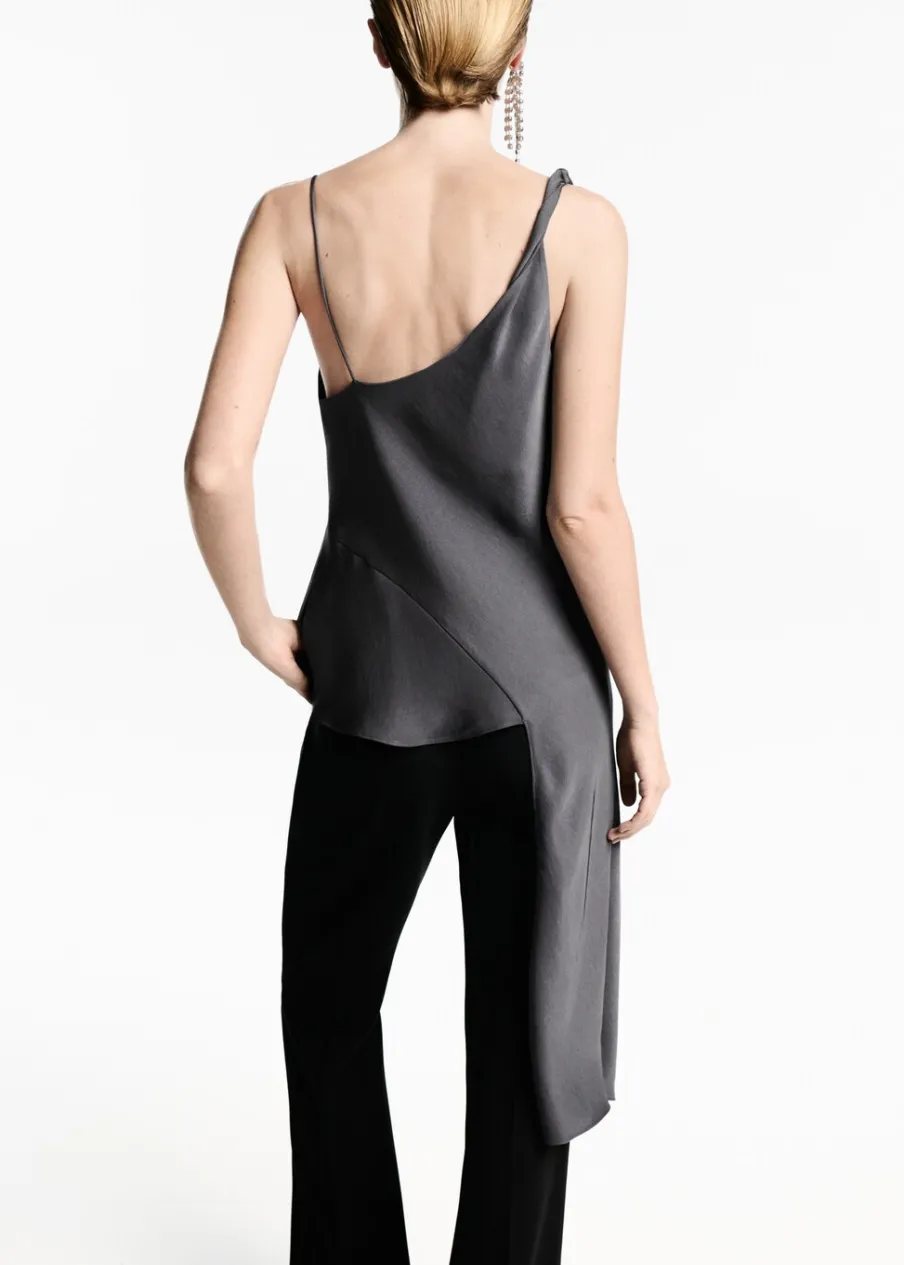 OpisSatynowa tkanina. Asymetryczny krój. Model wcięty. Drapowany dekolt. Cienkie ramiączka. Bez rękawów. Sznurowani…