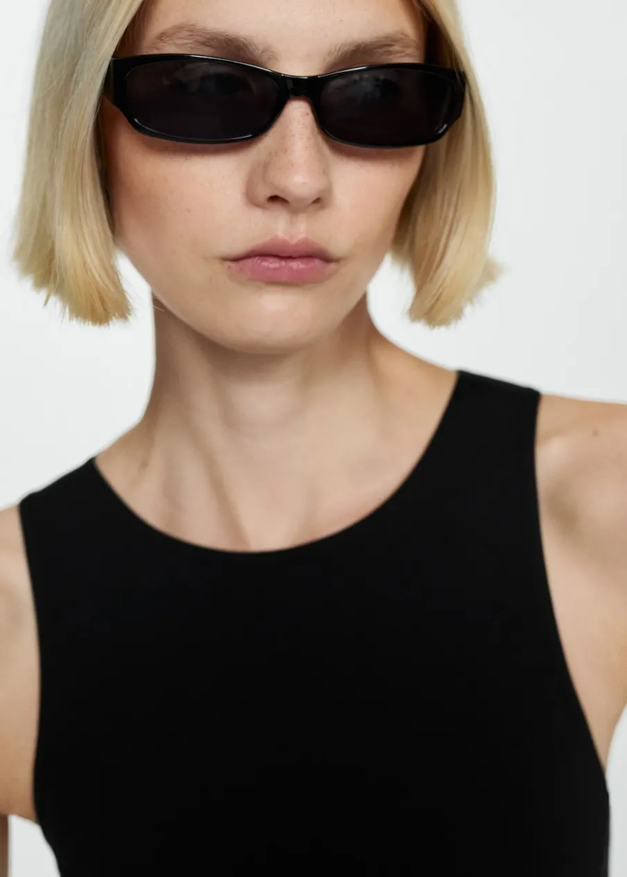 Fason body. Okrągły dekolt. Bez rękawów. Zapięcie na haftki. Model wcięty.