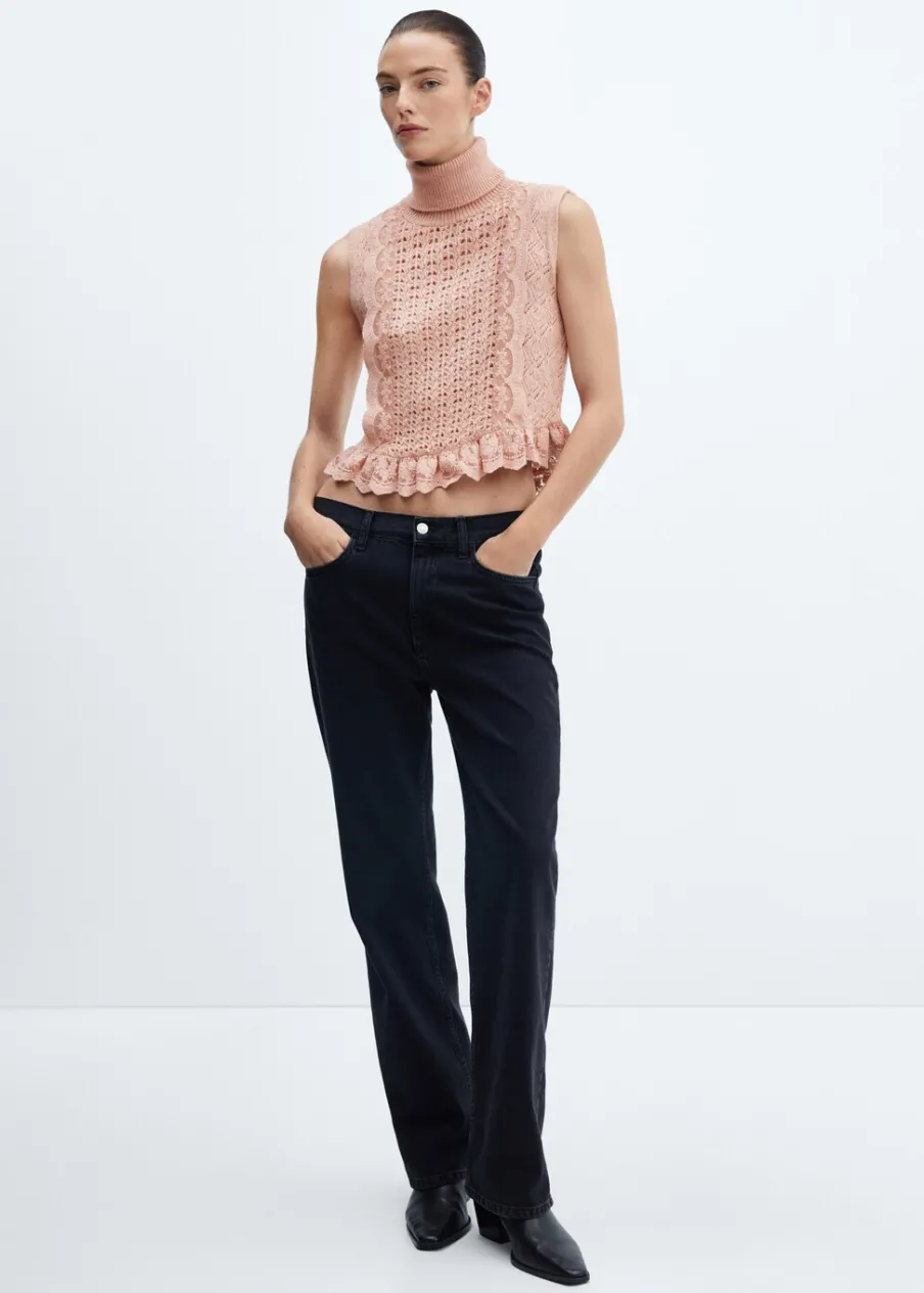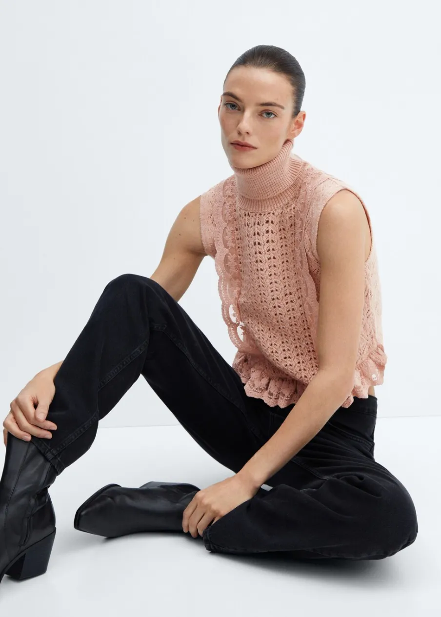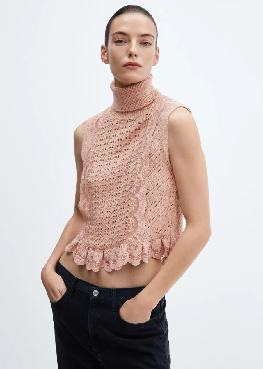 Dzianina średniej grubości. Model prosty. Wywinięty kołnierz. Bez rękawów. Bez zapięcia. Z falbanami. Ażurowe detale.