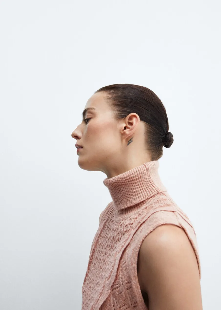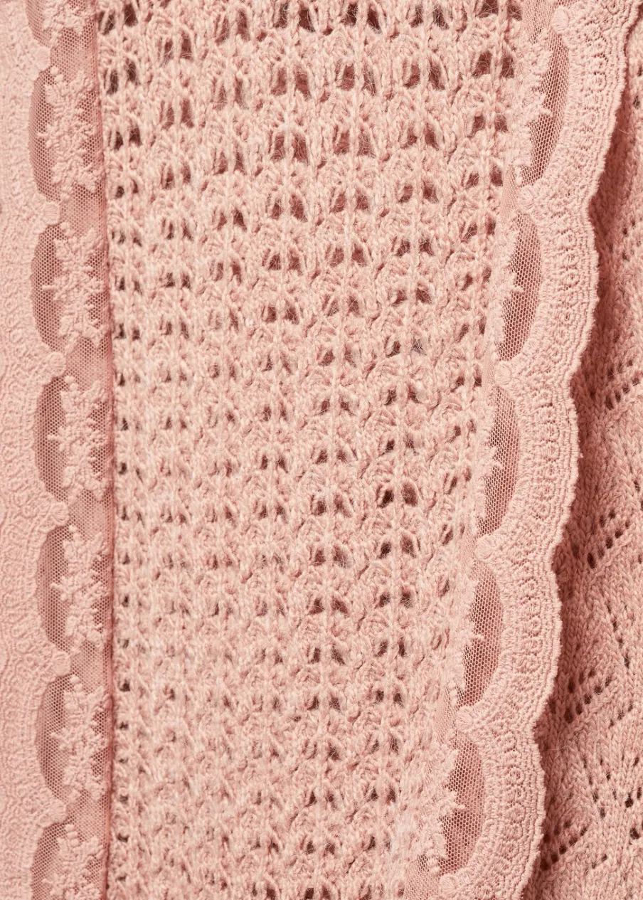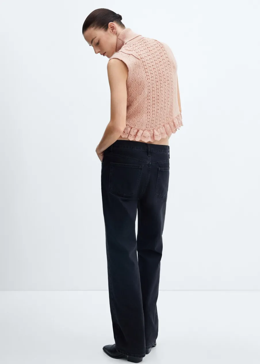 Dzianina średniej grubości. Model prosty. Wywinięty kołnierz. Bez rękawów. Bez zapięcia. Z falbanami. Ażurowe detale.