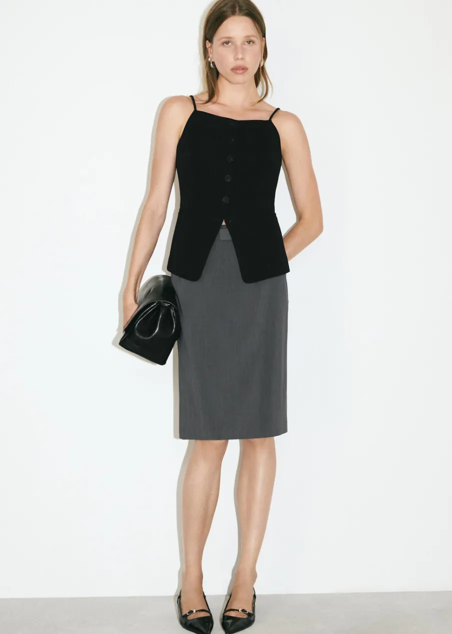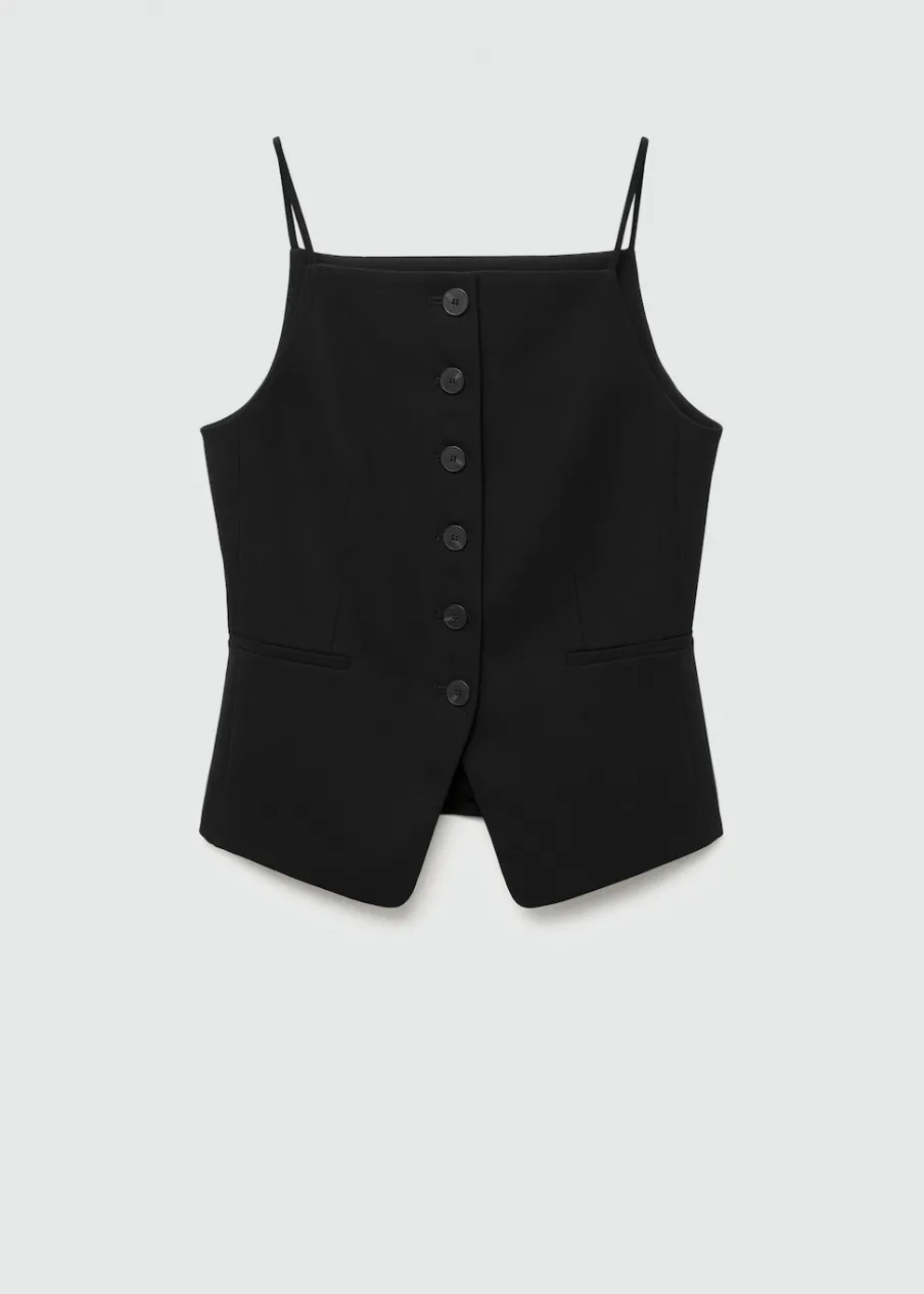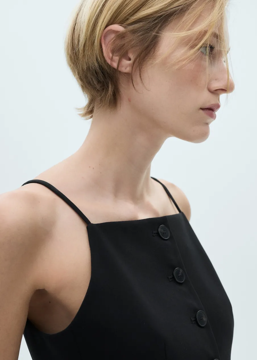 Dekolt w stylu halter. Bez rękawów. Cienkie ramiączka. Dwie kieszenie z wypustkami z przodu. Wewnętrzna podszewka. Zapięcie na guziki z przodu. Model wcięty.