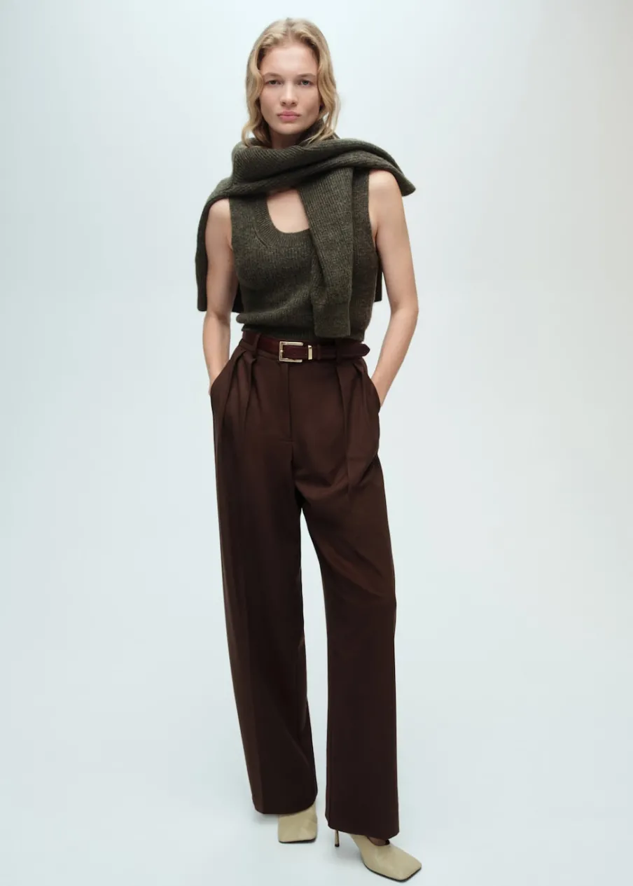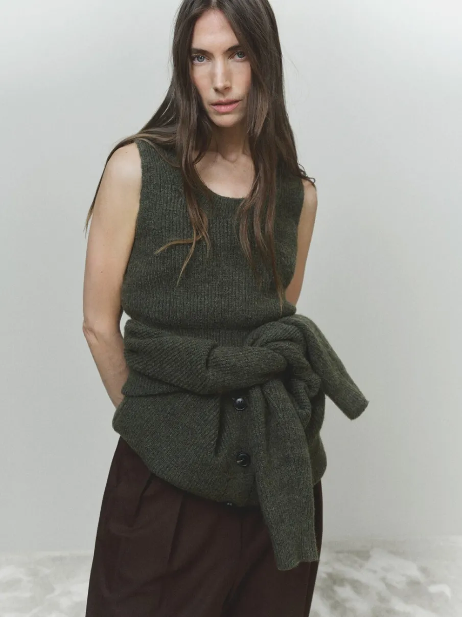 Tkanina z grubej dzianiny. Model prosty. Deseń crop. Dekolt. Bez rękawów. Szerokie ramiączka. Ściągaczowe wykończenia. Bez zapięcia. Total look.