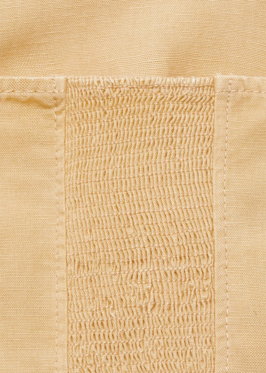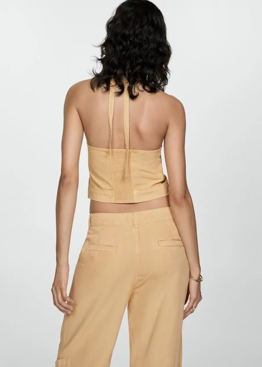 Deseń crop. Model prosty. Dekolt w stylu halter. Bez rękawów. Wiązanie z przodu. Wiązanie na szyi. Marszczony panel ze ściegiem typu plaster miodu. Total look. Średnia wielkość. Slim-fit. Miękki denim. Tkanina mieszana z lyocellu, bawełny i lnu.