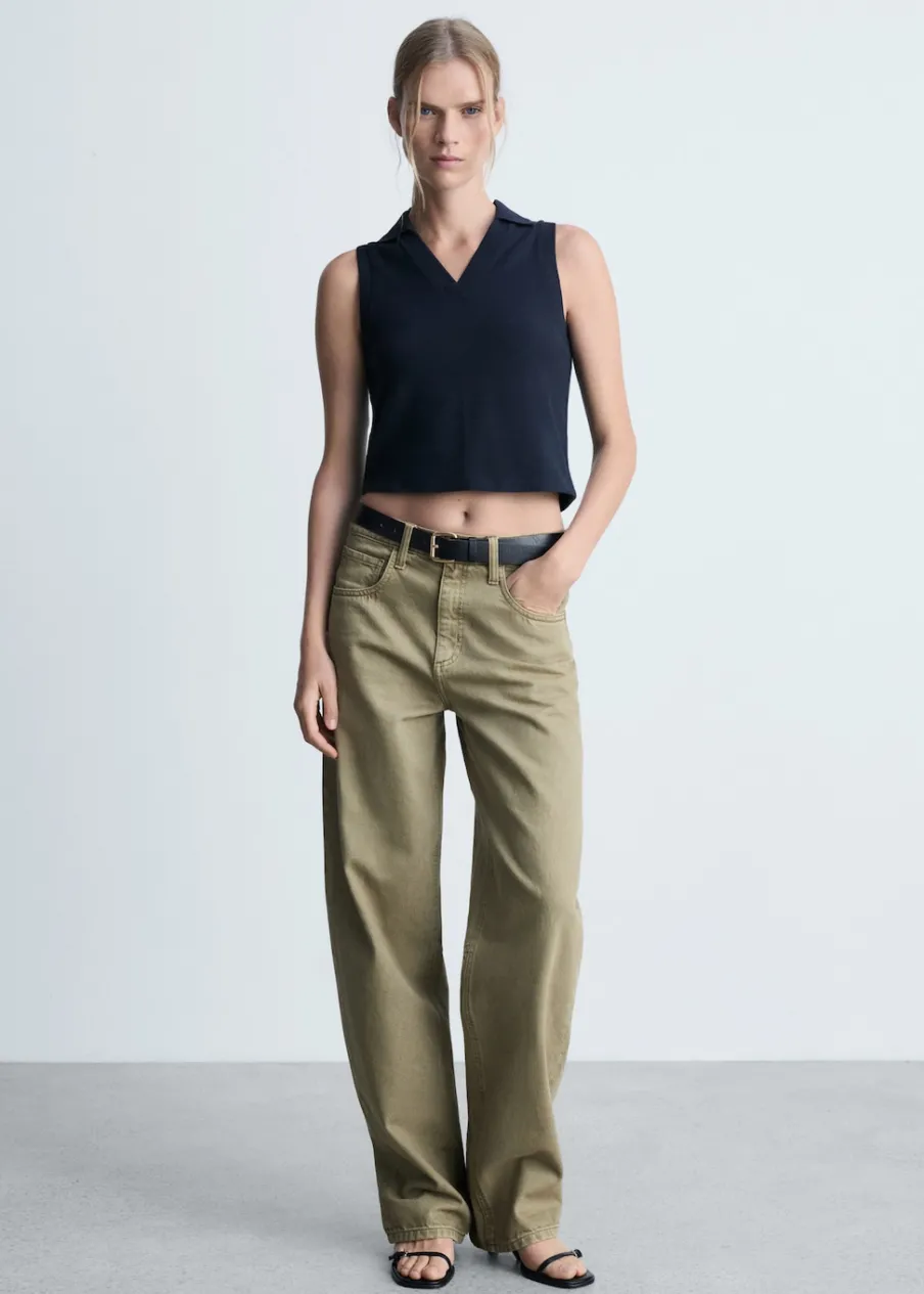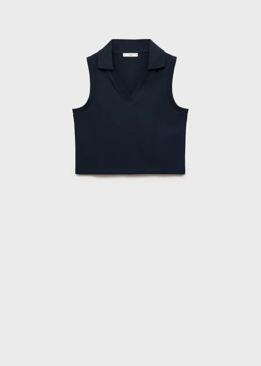 Deseń crop. Slim-fit. Kołnierzyk polo. Bez rękawów. Szerokie ramiączka. Modelka ma 178 cm wzrostu i nosi rozmiar S/36. Tkanina z 100% bawełny. Model prosty.