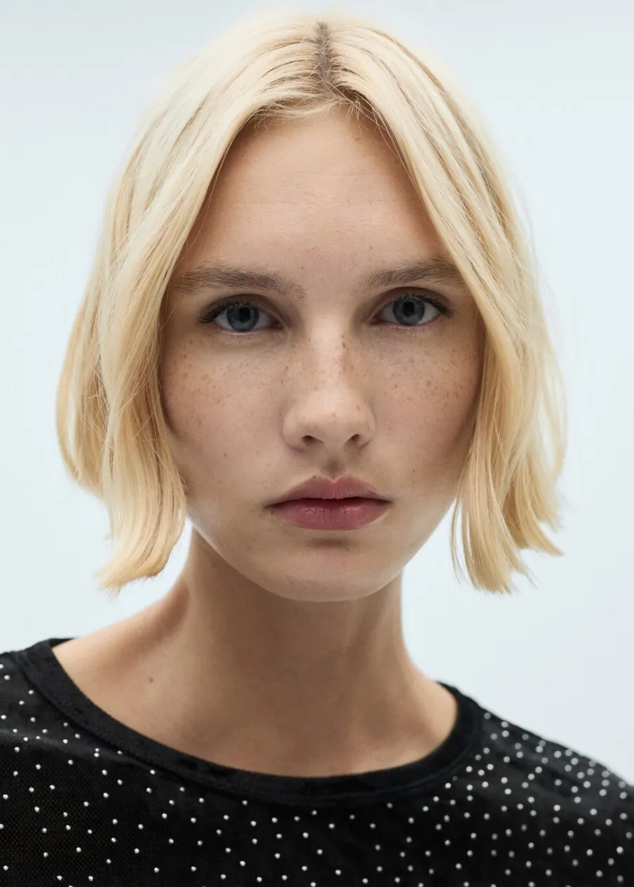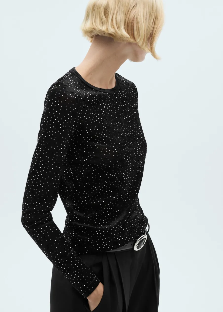 Lejąca tkanina. Detal strass. Model wcięty. Okrągły dekolt. Długi rękaw. Bez zapięcia. Kolekcja wizytowa.