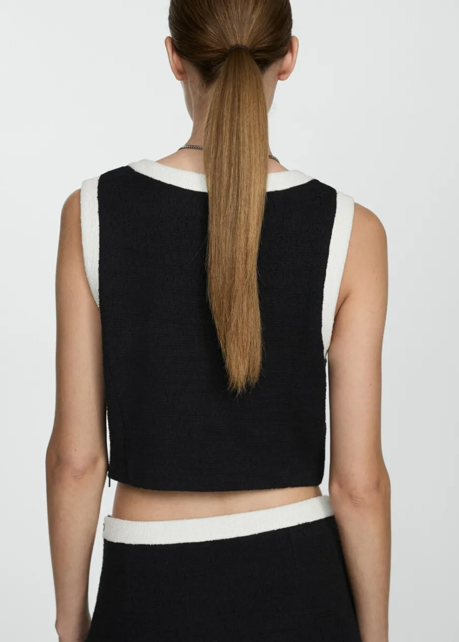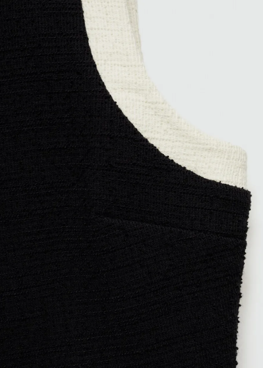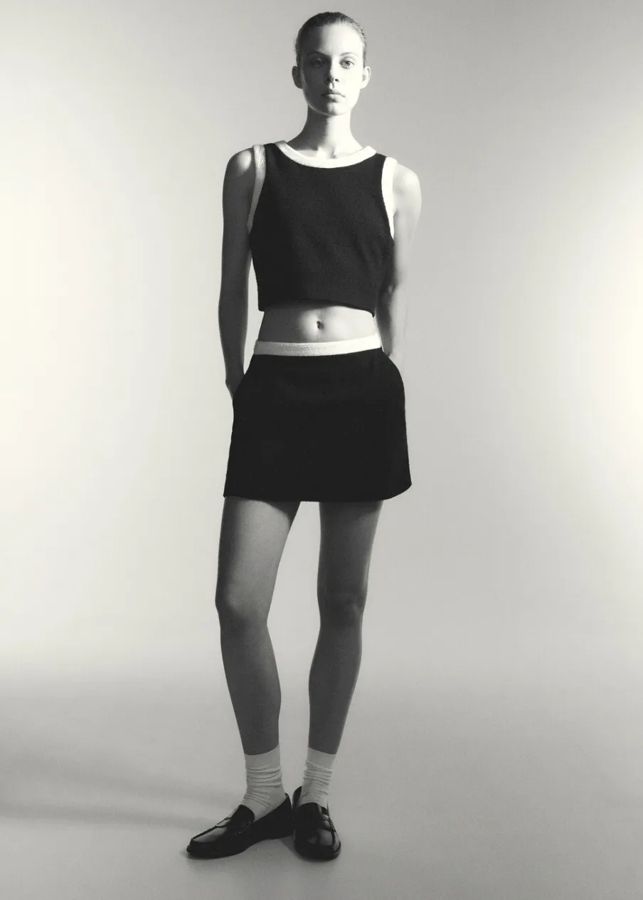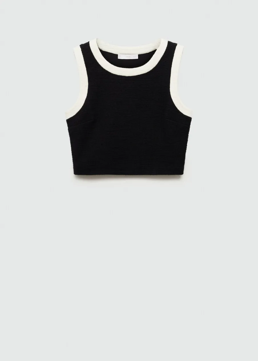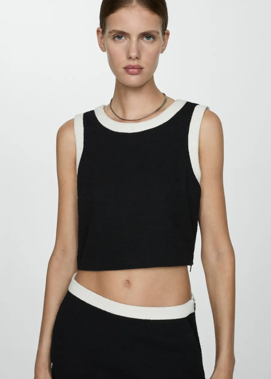 Tkanina mieszanka bawełny. Deseń crop. Model prosty. Okrągły dekolt. Szerokie ramiączka. Wykończenia z kontrastowymi lamówkami. Total look. Modelka ma 180 cm wzrostu i nosi rozmiar S.