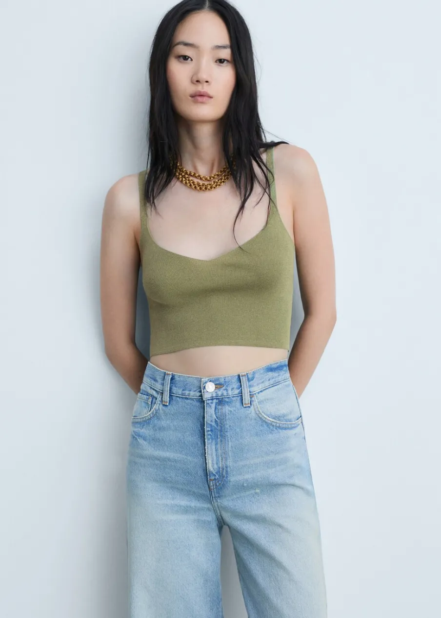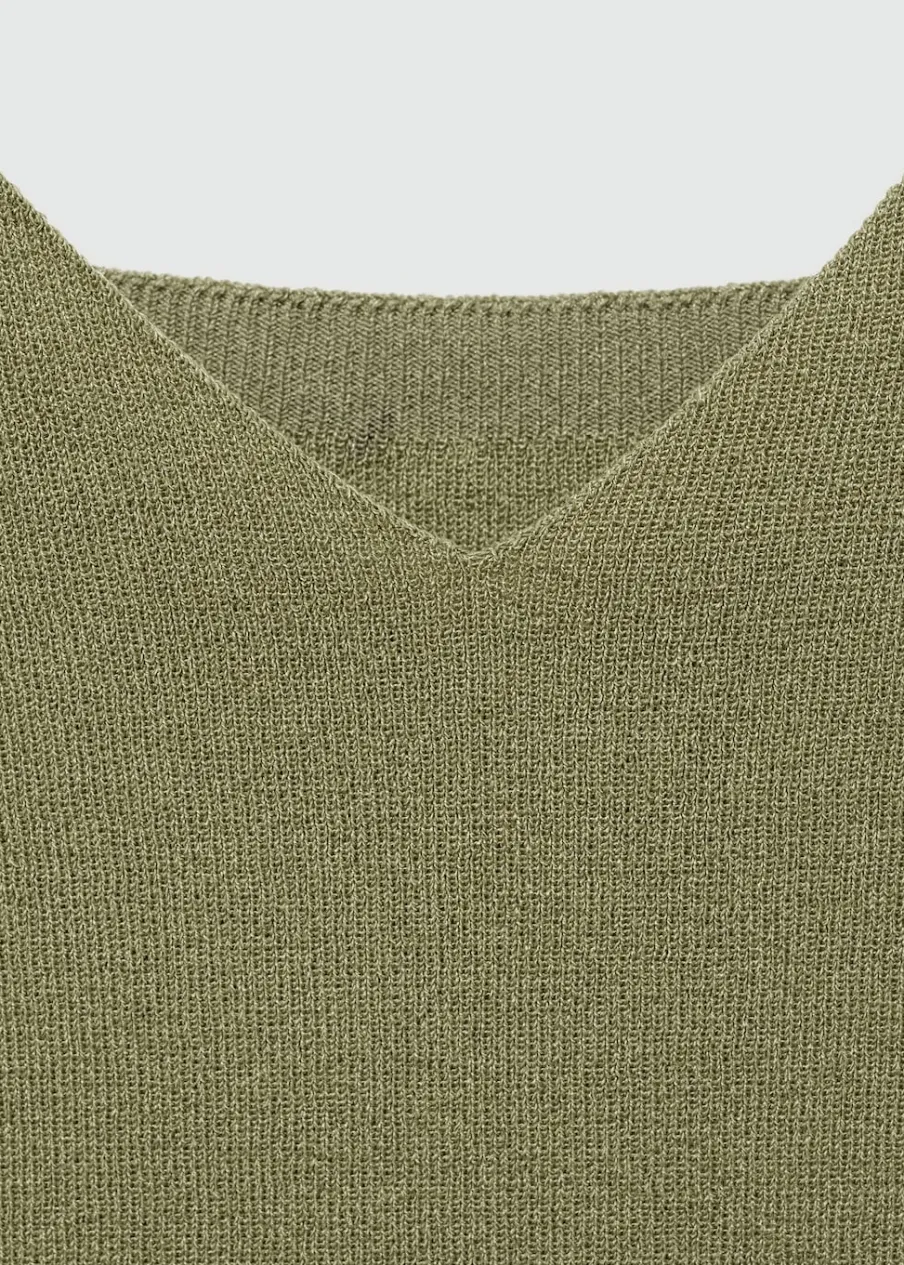 Tkanina z cienkiej dzianiny. Deseń crop. Dekolt V. Bez rękawów. Cienkie ramiączka. Dostępny jest total look w kolorze écru. Model wcięty.