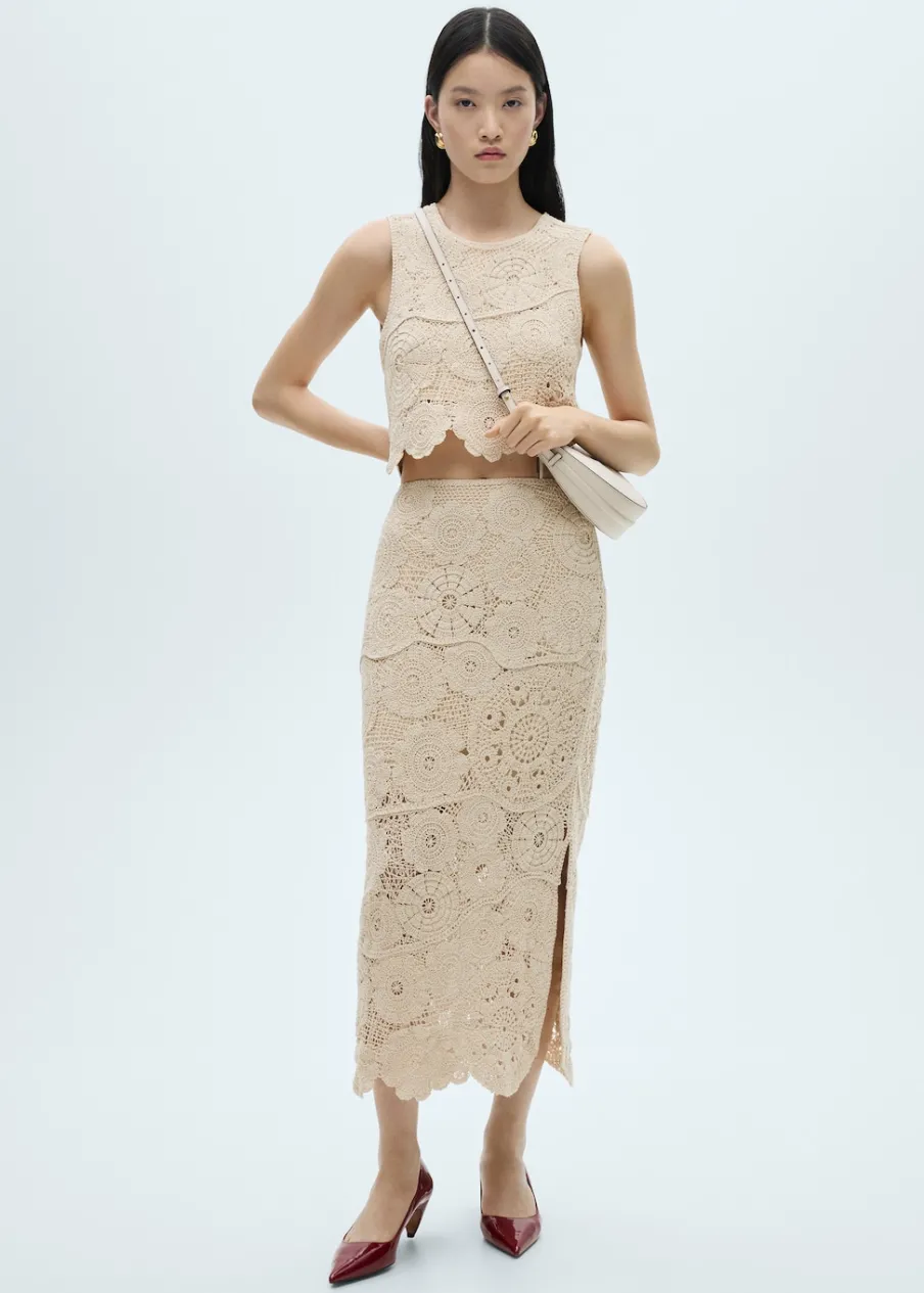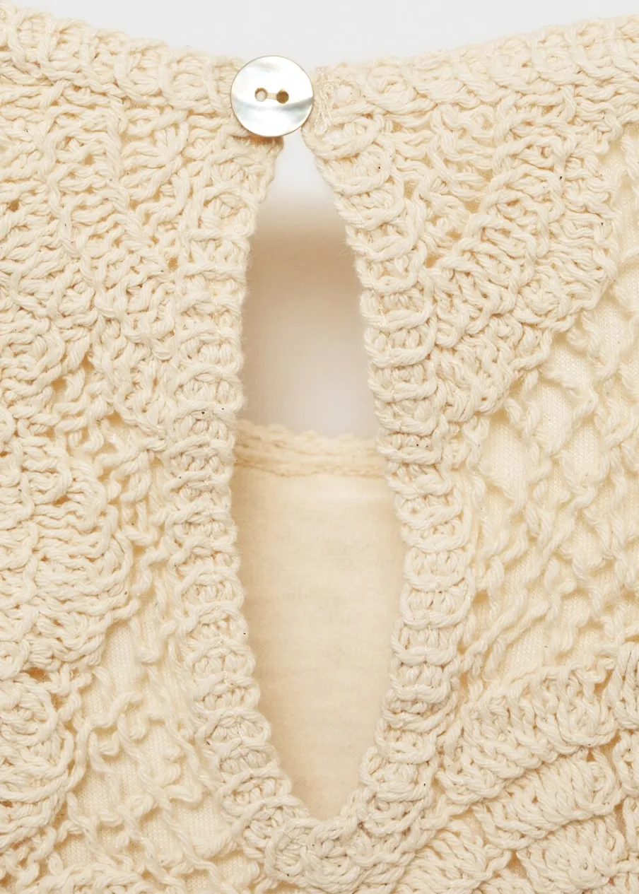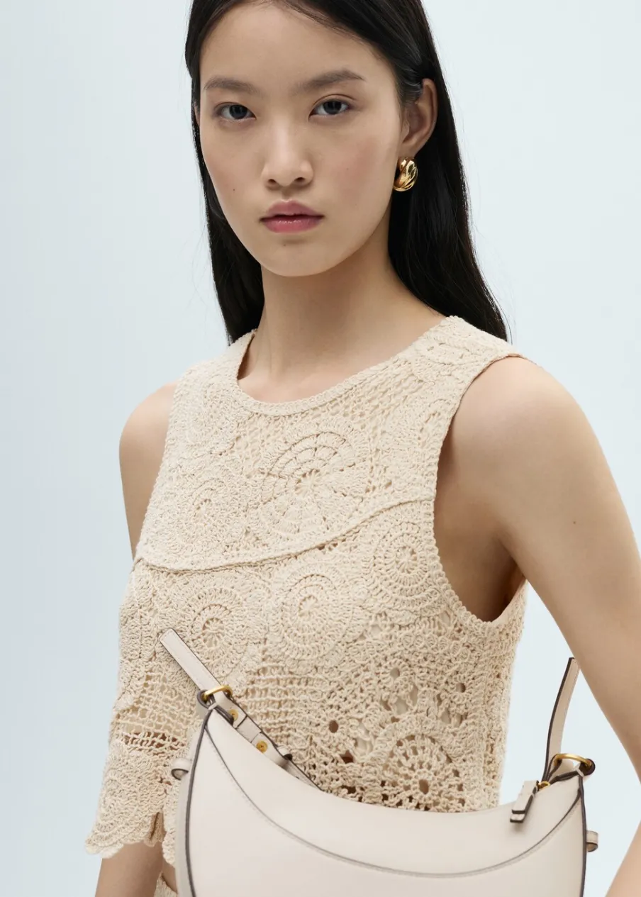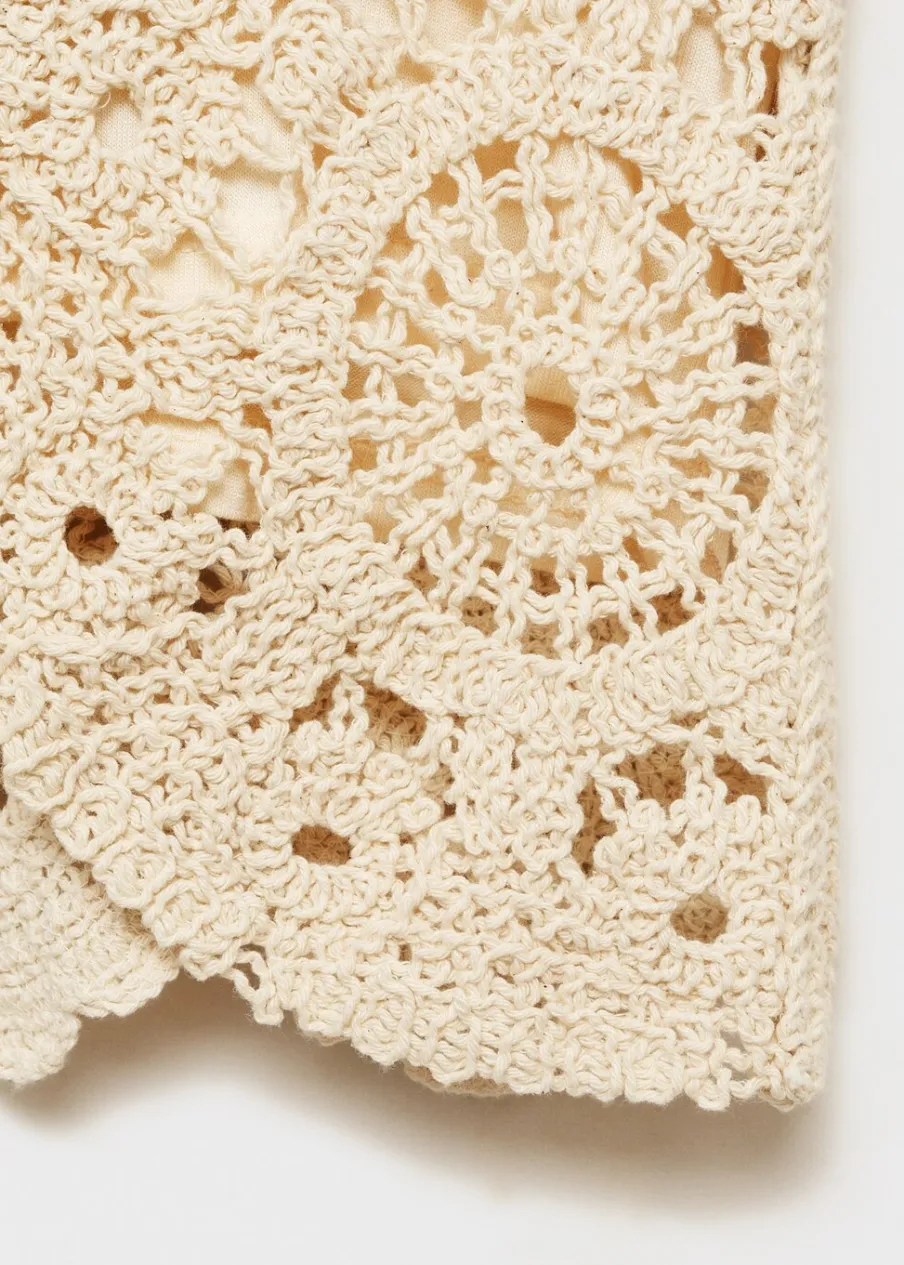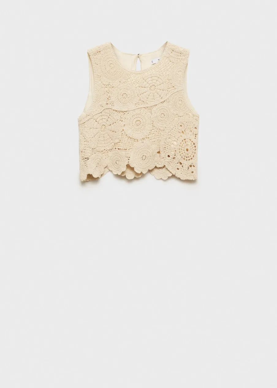 Tkanina z 100% bawełny. Szydełkowy model. Deseń crop. Model prosty. Okrągły dekolt. Bez rękawów. Zapięcie na guzik z tyłu. Wewnętrzna podszewka. Total look.