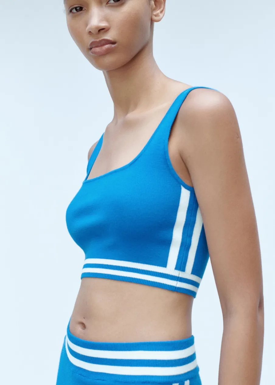 Tkanina z cienkiej dzianiny. Deseń crop. Kwadratowy dekolt. Bez rękawów. Szerokie ramiączka. Total look. Wzór w paski. Model wcięty.